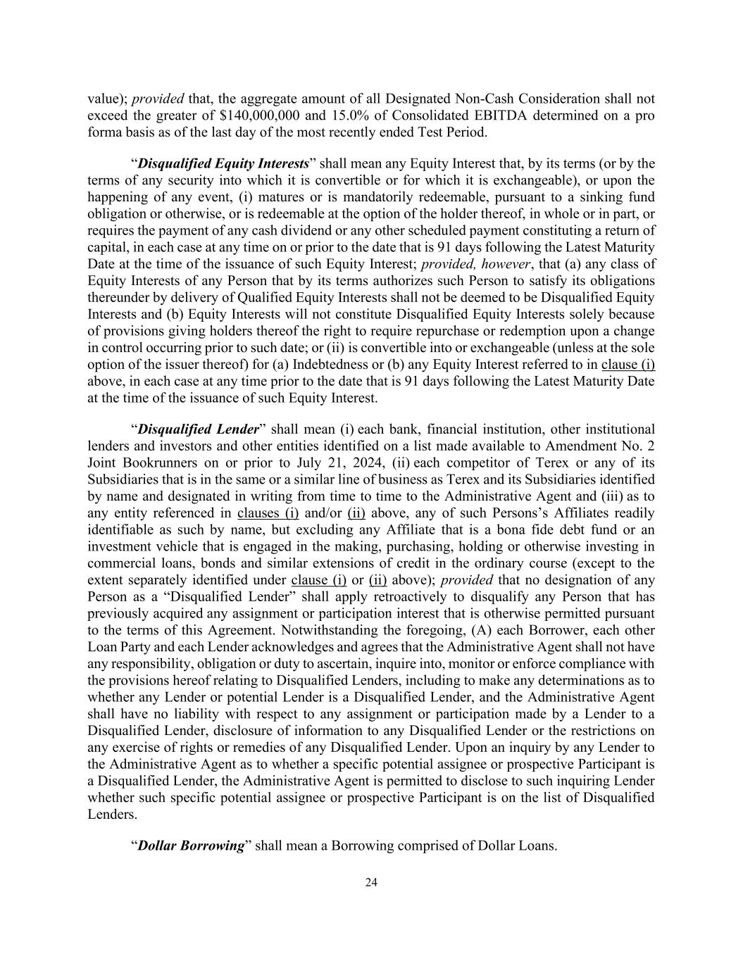 24 value); provided that, the aggregate amount of all Designated Non-Cash Consideration shall not exceed the greater of $140,000,000 and 15.0% of Consolidated EBITDA determined on a pro forma basis as of the last day of the most recently ended Test Period. “Disqualified Equity Interests” shall mean any Equity Interest that, by its terms (or by the terms of any security into which it is convertible or for which it is exchangeable), or upon the happening of any event, (i) matures or is mandatorily redeemable, pursuant to a sinking fund obligation or otherwise, or is redeemable at the option of the holder thereof, in whole or in part, or requires the payment of any cash dividend or any other scheduled payment constituting a return of capital, in each case at any time on or prior to the date that is 91 days following the Latest Maturity Date at the time of the issuance of such Equity Interest; provided, however, that (a) any class of Equity Interests of any Person that by its terms authorizes such Person to satisfy its obligations thereunder by delivery of Qualified Equity Interests shall not be deemed to be Disqualified Equity Interests and (b) Equity Interests will not constitute Disqualified Equity Interests solely because of provisions giving holders thereof the right to require repurchase or redemption upon a change in control occurring prior to such date; or (ii) is convertible into or exchangeable (unless at the sole option of the issuer thereof) for (a) Indebtedness or (b) any Equity Interest referred to in clause (i) above, in each case at any time prior to the date that is 91 days following the Latest Maturity Date at the time of the issuance of such Equity Interest. “Disqualified Lender” shall mean (i) each bank, financial institution, other institutional lenders and investors and other entities identified on a list made available to Amendment No. 2 Joint Bookrunners on or prior to July 21, 2024, (ii) each competitor of Terex or any of its Subsidiaries that is in the same or a similar line of business as Terex and its Subsidiaries identified by name and designated in writing from time to time to the Administrative Agent and (iii) as to any entity referenced in clauses (i) and/or (ii) above, any of such Persons’s Affiliates readily identifiable as such by name, but excluding any Affiliate that is a bona fide debt fund or an investment vehicle that is engaged in the making, purchasing, holding or otherwise investing in commercial loans, bonds and similar extensions of credit in the ordinary course (except to the extent separately identified under clause (i) or (ii) above); provided that no designation of any Person as a “Disqualified Lender” shall apply retroactively to disqualify any Person that has previously acquired any assignment or participation interest that is otherwise permitted pursuant to the terms of this Agreement. Notwithstanding the foregoing, (A) each Borrower, each other Loan Party and each Lender acknowledges and agrees that the Administrative Agent shall not have any responsibility, obligation or duty to ascertain, inquire into, monitor or enforce compliance with the provisions hereof relating to Disqualified Lenders, including to make any determinations as to whether any Lender or potential Lender is a Disqualified Lender, and the Administrative Agent shall have no liability with respect to any assignment or participation made by a Lender to a Disqualified Lender, disclosure of information to any Disqualified Lender or the restrictions on any exercise of rights or remedies of any Disqualified Lender. Upon an inquiry by any Lender to the Administrative Agent as to whether a specific potential assignee or prospective Participant is a Disqualified Lender, the Administrative Agent is permitted to disclose to such inquiring Lender whether such specific potential assignee or prospective Participant is on the list of Disqualified Lenders. “Dollar Borrowing” shall mean a Borrowing comprised of Dollar Loans.