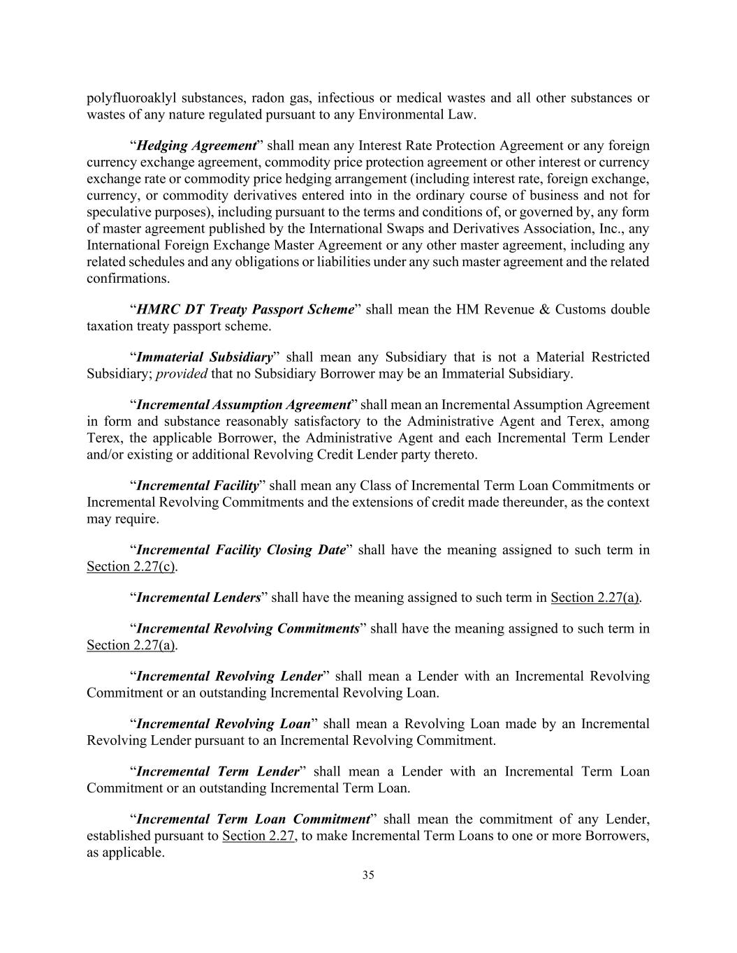 35 polyfluoroaklyl substances, radon gas, infectious or medical wastes and all other substances or wastes of any nature regulated pursuant to any Environmental Law. “Hedging Agreement” shall mean any Interest Rate Protection Agreement or any foreign currency exchange agreement, commodity price protection agreement or other interest or currency exchange rate or commodity price hedging arrangement (including interest rate, foreign exchange, currency, or commodity derivatives entered into in the ordinary course of business and not for speculative purposes), including pursuant to the terms and conditions of, or governed by, any form of master agreement published by the International Swaps and Derivatives Association, Inc., any International Foreign Exchange Master Agreement or any other master agreement, including any related schedules and any obligations or liabilities under any such master agreement and the related confirmations. “HMRC DT Treaty Passport Scheme” shall mean the HM Revenue & Customs double taxation treaty passport scheme. “Immaterial Subsidiary” shall mean any Subsidiary that is not a Material Restricted Subsidiary; provided that no Subsidiary Borrower may be an Immaterial Subsidiary. “Incremental Assumption Agreement” shall mean an Incremental Assumption Agreement in form and substance reasonably satisfactory to the Administrative Agent and Terex, among Terex, the applicable Borrower, the Administrative Agent and each Incremental Term Lender and/or existing or additional Revolving Credit Lender party thereto. “Incremental Facility” shall mean any Class of Incremental Term Loan Commitments or Incremental Revolving Commitments and the extensions of credit made thereunder, as the context may require. “Incremental Facility Closing Date” shall have the meaning assigned to such term in Section 2.27(c). “Incremental Lenders” shall have the meaning assigned to such term in Section 2.27(a). “Incremental Revolving Commitments” shall have the meaning assigned to such term in Section 2.27(a). “Incremental Revolving Lender” shall mean a Lender with an Incremental Revolving Commitment or an outstanding Incremental Revolving Loan. “Incremental Revolving Loan” shall mean a Revolving Loan made by an Incremental Revolving Lender pursuant to an Incremental Revolving Commitment. “Incremental Term Lender” shall mean a Lender with an Incremental Term Loan Commitment or an outstanding Incremental Term Loan. “Incremental Term Loan Commitment” shall mean the commitment of any Lender, established pursuant to Section 2.27, to make Incremental Term Loans to one or more Borrowers, as applicable.