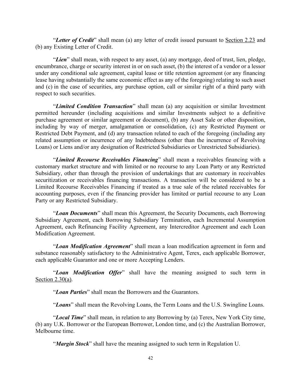 42 “Letter of Credit” shall mean (a) any letter of credit issued pursuant to Section 2.23 and (b) any Existing Letter of Credit. “Lien” shall mean, with respect to any asset, (a) any mortgage, deed of trust, lien, pledge, encumbrance, charge or security interest in or on such asset, (b) the interest of a vendor or a lessor under any conditional sale agreement, capital lease or title retention agreement (or any financing lease having substantially the same economic effect as any of the foregoing) relating to such asset and (c) in the case of securities, any purchase option, call or similar right of a third party with respect to such securities. “Limited Condition Transaction” shall mean (a) any acquisition or similar Investment permitted hereunder (including acquisitions and similar Investments subject to a definitive purchase agreement or similar agreement or document), (b) any Asset Sale or other disposition, including by way of merger, amalgamation or consolidation, (c) any Restricted Payment or Restricted Debt Payment, and (d) any transaction related to each of the foregoing (including any related assumption or incurrence of any Indebtedness (other than the incurrence of Revolving Loans) or Liens and/or any designation of Restricted Subsidiaries or Unrestricted Subsidiaries). “Limited Recourse Receivables Financing” shall mean a receivables financing with a customary market structure and with limited or no recourse to any Loan Party or any Restricted Subsidiary, other than through the provision of undertakings that are customary in receivables securitization or receivables financing transactions. A transaction will be considered to be a Limited Recourse Receivables Financing if treated as a true sale of the related receivables for accounting purposes, even if the financing provider has limited or partial recourse to any Loan Party or any Restricted Subsidiary. “Loan Documents” shall mean this Agreement, the Security Documents, each Borrowing Subsidiary Agreement, each Borrowing Subsidiary Termination, each Incremental Assumption Agreement, each Refinancing Facility Agreement, any Intercreditor Agreement and each Loan Modification Agreement. “Loan Modification Agreement” shall mean a loan modification agreement in form and substance reasonably satisfactory to the Administrative Agent, Terex, each applicable Borrower, each applicable Guarantor and one or more Accepting Lenders. “Loan Modification Offer” shall have the meaning assigned to such term in Section 2.30(a). “Loan Parties” shall mean the Borrowers and the Guarantors. “Loans” shall mean the Revolving Loans, the Term Loans and the U.S. Swingline Loans. “Local Time” shall mean, in relation to any Borrowing by (a) Terex, New York City time, (b) any U.K. Borrower or the European Borrower, London time, and (c) the Australian Borrower, Melbourne time. “Margin Stock” shall have the meaning assigned to such term in Regulation U.