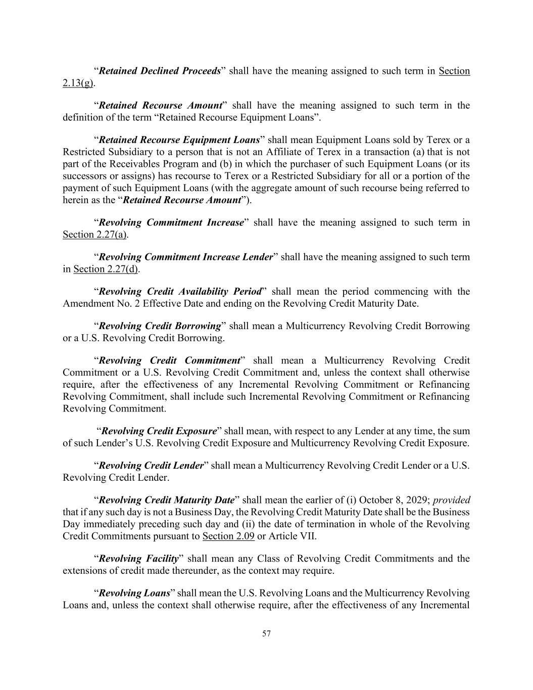 57 “Retained Declined Proceeds” shall have the meaning assigned to such term in Section 2.13(g). “Retained Recourse Amount” shall have the meaning assigned to such term in the definition of the term “Retained Recourse Equipment Loans”. “Retained Recourse Equipment Loans” shall mean Equipment Loans sold by Terex or a Restricted Subsidiary to a person that is not an Affiliate of Terex in a transaction (a) that is not part of the Receivables Program and (b) in which the purchaser of such Equipment Loans (or its successors or assigns) has recourse to Terex or a Restricted Subsidiary for all or a portion of the payment of such Equipment Loans (with the aggregate amount of such recourse being referred to herein as the “Retained Recourse Amount”). “Revolving Commitment Increase” shall have the meaning assigned to such term in Section 2.27(a). “Revolving Commitment Increase Lender” shall have the meaning assigned to such term in Section 2.27(d). “Revolving Credit Availability Period” shall mean the period commencing with the Amendment No. 2 Effective Date and ending on the Revolving Credit Maturity Date. “Revolving Credit Borrowing” shall mean a Multicurrency Revolving Credit Borrowing or a U.S. Revolving Credit Borrowing. “Revolving Credit Commitment” shall mean a Multicurrency Revolving Credit Commitment or a U.S. Revolving Credit Commitment and, unless the context shall otherwise require, after the effectiveness of any Incremental Revolving Commitment or Refinancing Revolving Commitment, shall include such Incremental Revolving Commitment or Refinancing Revolving Commitment. “Revolving Credit Exposure” shall mean, with respect to any Lender at any time, the sum of such Lender’s U.S. Revolving Credit Exposure and Multicurrency Revolving Credit Exposure. “Revolving Credit Lender” shall mean a Multicurrency Revolving Credit Lender or a U.S. Revolving Credit Lender. “Revolving Credit Maturity Date” shall mean the earlier of (i) October 8, 2029; provided that if any such day is not a Business Day, the Revolving Credit Maturity Date shall be the Business Day immediately preceding such day and (ii) the date of termination in whole of the Revolving Credit Commitments pursuant to Section 2.09 or Article VII. “Revolving Facility” shall mean any Class of Revolving Credit Commitments and the extensions of credit made thereunder, as the context may require. “Revolving Loans” shall mean the U.S. Revolving Loans and the Multicurrency Revolving Loans and, unless the context shall otherwise require, after the effectiveness of any Incremental