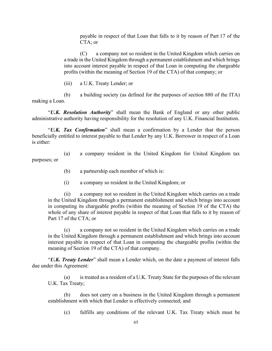 65 payable in respect of that Loan that falls to it by reason of Part 17 of the CTA; or (C) a company not so resident in the United Kingdom which carries on a trade in the United Kingdom through a permanent establishment and which brings into account interest payable in respect of that Loan in computing the chargeable profits (within the meaning of Section 19 of the CTA) of that company; or (iii) a U.K. Treaty Lender; or (b) a building society (as defined for the purposes of section 880 of the ITA) making a Loan. “U.K. Resolution Authority” shall mean the Bank of England or any other public administrative authority having responsibility for the resolution of any U.K. Financial Institution. “U.K. Tax Confirmation” shall mean a confirmation by a Lender that the person beneficially entitled to interest payable to that Lender by any U.K. Borrower in respect of a Loan is either: (a) a company resident in the United Kingdom for United Kingdom tax purposes; or (b) a partnership each member of which is: (i) a company so resident in the United Kingdom; or (ii) a company not so resident in the United Kingdom which carries on a trade in the United Kingdom through a permanent establishment and which brings into account in computing its chargeable profits (within the meaning of Section 19 of the CTA) the whole of any share of interest payable in respect of that Loan that falls to it by reason of Part 17 of the CTA; or (c) a company not so resident in the United Kingdom which carries on a trade in the United Kingdom through a permanent establishment and which brings into account interest payable in respect of that Loan in computing the chargeable profits (within the meaning of Section 19 of the CTA) of that company. “U.K. Treaty Lender” shall mean a Lender which, on the date a payment of interest falls due under this Agreement: (a) is treated as a resident of a U.K. Treaty State for the purposes of the relevant U.K. Tax Treaty; (b) does not carry on a business in the United Kingdom through a permanent establishment with which that Lender is effectively connected; and (c) fulfills any conditions of the relevant U.K. Tax Treaty which must be