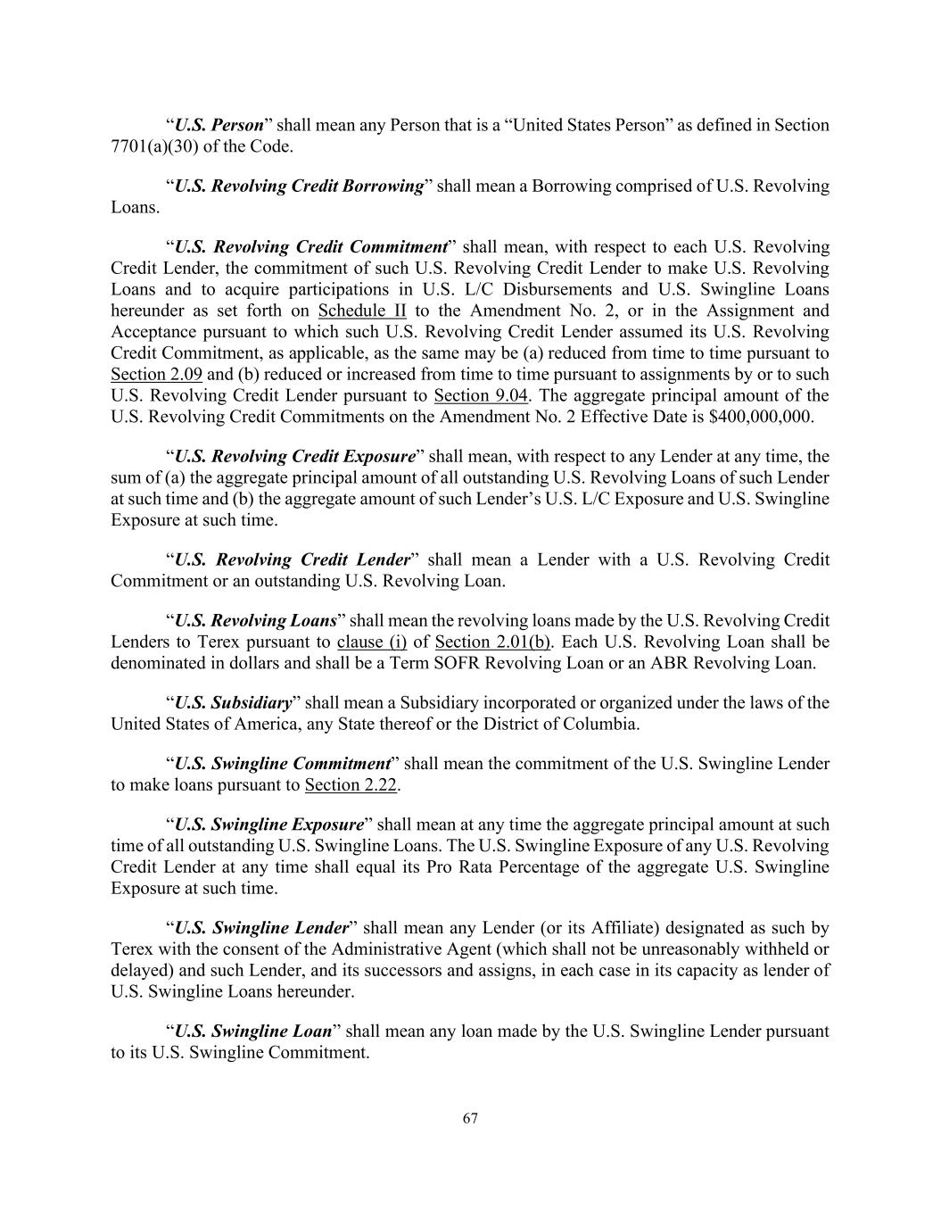 67 “U.S. Person” shall mean any Person that is a “United States Person” as defined in Section 7701(a)(30) of the Code. “U.S. Revolving Credit Borrowing” shall mean a Borrowing comprised of U.S. Revolving Loans. “U.S. Revolving Credit Commitment” shall mean, with respect to each U.S. Revolving Credit Lender, the commitment of such U.S. Revolving Credit Lender to make U.S. Revolving Loans and to acquire participations in U.S. L/C Disbursements and U.S. Swingline Loans hereunder as set forth on Schedule II to the Amendment No. 2, or in the Assignment and Acceptance pursuant to which such U.S. Revolving Credit Lender assumed its U.S. Revolving Credit Commitment, as applicable, as the same may be (a) reduced from time to time pursuant to Section 2.09 and (b) reduced or increased from time to time pursuant to assignments by or to such U.S. Revolving Credit Lender pursuant to Section 9.04. The aggregate principal amount of the U.S. Revolving Credit Commitments on the Amendment No. 2 Effective Date is $400,000,000. “U.S. Revolving Credit Exposure” shall mean, with respect to any Lender at any time, the sum of (a) the aggregate principal amount of all outstanding U.S. Revolving Loans of such Lender at such time and (b) the aggregate amount of such Lender’s U.S. L/C Exposure and U.S. Swingline Exposure at such time. “U.S. Revolving Credit Lender” shall mean a Lender with a U.S. Revolving Credit Commitment or an outstanding U.S. Revolving Loan. “U.S. Revolving Loans” shall mean the revolving loans made by the U.S. Revolving Credit Lenders to Terex pursuant to clause (i) of Section 2.01(b). Each U.S. Revolving Loan shall be denominated in dollars and shall be a Term SOFR Revolving Loan or an ABR Revolving Loan. “U.S. Subsidiary” shall mean a Subsidiary incorporated or organized under the laws of the United States of America, any State thereof or the District of Columbia. “U.S. Swingline Commitment” shall mean the commitment of the U.S. Swingline Lender to make loans pursuant to Section 2.22. “U.S. Swingline Exposure” shall mean at any time the aggregate principal amount at such time of all outstanding U.S. Swingline Loans. The U.S. Swingline Exposure of any U.S. Revolving Credit Lender at any time shall equal its Pro Rata Percentage of the aggregate U.S. Swingline Exposure at such time. “U.S. Swingline Lender” shall mean any Lender (or its Affiliate) designated as such by Terex with the consent of the Administrative Agent (which shall not be unreasonably withheld or delayed) and such Lender, and its successors and assigns, in each case in its capacity as lender of U.S. Swingline Loans hereunder. “U.S. Swingline Loan” shall mean any loan made by the U.S. Swingline Lender pursuant to its U.S. Swingline Commitment.