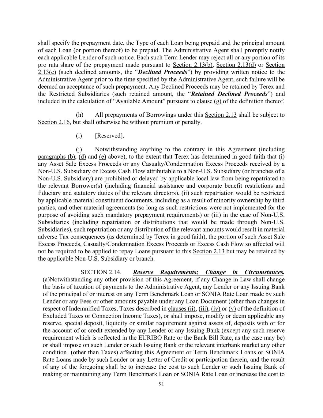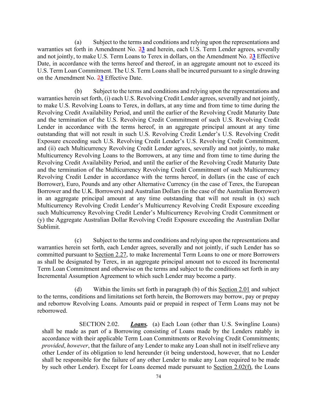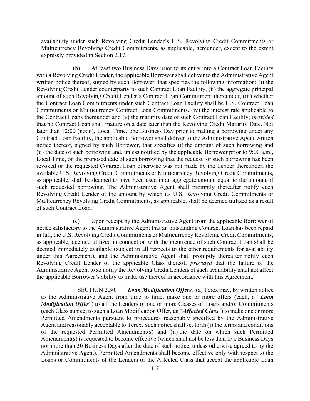 117 availability under such Revolving Credit Lender’s U.S. Revolving Credit Commitments or Multicurrency Revolving Credit Commitments, as applicable, hereunder, except to the extent expressly provided in Section 2.17. (b) At least two Business Days prior to its entry into a Contract Loan Facility with a Revolving Credit Lender, the applicable Borrower shall deliver to the Administrative Agent written notice thereof, signed by such Borrower, that specifies the following information: (i) the Revolving Credit Lender counterparty to such Contract Loan Facility, (ii) the aggregate principal amount of such Revolving Credit Lender’s Contract Loan Commitment thereunder, (iii) whether the Contract Loan Commitments under such Contract Loan Facility shall be U.S. Contract Loan Commitments or Multicurrency Contract Loan Commitments, (iv) the interest rate applicable to the Contract Loans thereunder and (v) the maturity date of such Contract Loan Facility; provided that no Contract Loan shall mature on a date later than the Revolving Credit Maturity Date. Not later than 12:00 (noon), Local Time, one Business Day prior to making a borrowing under any Contract Loan Facility, the applicable Borrower shall deliver to the Administrative Agent written notice thereof, signed by such Borrower, that specifies (i) the amount of such borrowing and (ii) the date of such borrowing and, unless notified by the applicable Borrower prior to 9:00 a.m., Local Time, on the proposed date of such borrowing that the request for such borrowing has been revoked or the requested Contract Loan otherwise was not made by the Lender thereunder, the available U.S. Revolving Credit Commitments or Multicurrency Revolving Credit Commitments, as applicable, shall be deemed to have been used in an aggregate amount equal to the amount of such requested borrowing. The Administrative Agent shall promptly thereafter notify each Revolving Credit Lender of the amount by which its U.S. Revolving Credit Commitments or Multicurrency Revolving Credit Commitments, as applicable, shall be deemed utilized as a result of such Contract Loan. (c) Upon receipt by the Administrative Agent from the applicable Borrower of notice satisfactory to the Administrative Agent that an outstanding Contract Loan has been repaid in full, the U.S. Revolving Credit Commitments or Multicurrency Revolving Credit Commitments, as applicable, deemed utilized in connection with the incurrence of such Contract Loan shall be deemed immediately available (subject in all respects to the other requirements for availability under this Agreement), and the Administrative Agent shall promptly thereafter notify each Revolving Credit Lender of the applicable Class thereof; provided that the failure of the Administrative Agent to so notify the Revolving Credit Lenders of such availability shall not affect the applicable Borrower’s ability to make use thereof in accordance with this Agreement. SECTION 2.30. Loan Modification Offers. (a) Terex may, by written notice to the Administrative Agent from time to time, make one or more offers (each, a “Loan Modification Offer”) to all the Lenders of one or more Classes of Loans and/or Commitments (each Class subject to such a Loan Modification Offer, an “Affected Class”) to make one or more Permitted Amendments pursuant to procedures reasonably specified by the Administrative Agent and reasonably acceptable to Terex. Such notice shall set forth (i) the terms and conditions of the requested Permitted Amendment(s) and (ii) the date on which such Permitted Amendment(s) is requested to become effective (which shall not be less than five Business Days nor more than 30 Business Days after the date of such notice, unless otherwise agreed to by the Administrative Agent). Permitted Amendments shall become effective only with respect to the Loans or Commitments of the Lenders of the Affected Class that accept the applicable Loan