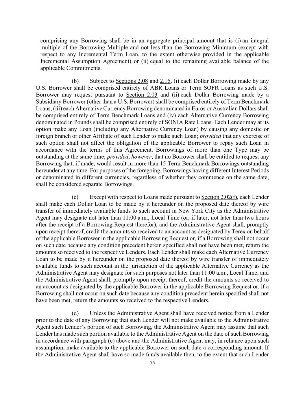 14 (i) where it relates to a U.K. Treaty Lender that is a Lender on the day on which this Agreement is entered into, contains the scheme reference number and jurisdiction of tax residence stated below that U.K. Treaty Lender’s name on its signature page to this Agreement and is filed with HM Revenue & Customs within 30 days of the date of this Agreement; or (ii) where it relates to a U.K. Treaty Lender that is a New Lender, contains the scheme reference number and jurisdiction of tax residence stated in respect of that Lender in the relevant Assignment and Acceptance and is filed with HM Revenue & Customs within 30 days of that date. “Borrower Purchase Assignment and Acceptance” shall mean an assignment and acceptance entered into by a Lender and Terex, and accepted by the Administrative Agent, in the form of Exhibit B-2 or such other form as shall be approved by the Administrative Agent. “Borrowers” shall mean, collectively, Terex and the Subsidiary Borrowers. “Borrowing” shall mean a group of Loans of a single Type made by the Lenders on a single date and, in the case of a Eurocurrency Borrowing or a Term SOFR Borrowing, as to which a single Interest Period is in effect. “Borrowing Minimum” shall mean $2,500,000, A$2,500,000, €2,000,000, £2,000,000 or, in the case of any other Alternative Currency, such amount as may be reasonably specified by the Administrative Agent. “Borrowing Multiple” shall mean $100,000, A$100,000, €100,000, £100,000 or, in the case of any other Alternative Currency, such amount as may be reasonably specified by the Administrative Agent. “Borrowing Request” shall mean a request by any Borrower in accordance with the terms of Section 2.03 and substantially in the form of Exhibit C. “Borrowing Subsidiary Agreement” shall mean a Borrowing Subsidiary Agreement substantially in the form of Exhibit J-1, or such other form as shall be acceptable to Terex and the Administrative Agent. “Borrowing Subsidiary Termination” shall mean a Borrowing Subsidiary Termination substantially in the form of Exhibit J-2, or such other form as shall be acceptable to Terex and the Administrative Agent. “Business Day” shall mean any day other than a Saturday, Sunday or day on which banks in New York City are authorized or required by law to close; provided, however, that (i) when used in connection with a Term SOFR Loan, the term “Business Day” shall exclude any day that is not a U.S. Government Securities Business Day, (ii) when used in connection with a Eurocurrency Loan, the term “Business Day” shall also exclude any day that is not a Target Day, (iii) when use in connection with any SONIA Rate Loan, the term “Business Day” shall also exclude any day on which banks are closed for general business in London and (iv) when used in connection with any Calculation Date or determining any date on which any amount is to be paid or made available in an Alternative Currency other than Euro, the term “Business Day” shall also