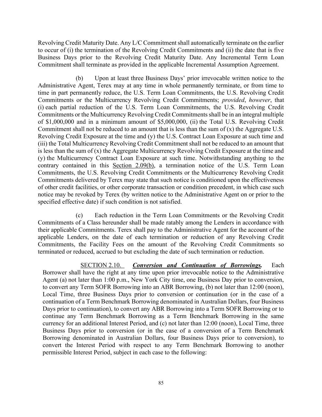 109 Letters of Credit issued by such Issuing Bank, including the face amount, the account party, the beneficiary and the expiration date of such Letters of Credit and any other information with respect thereto as may be requested by the Administrative Agent. SECTION 2.26. Additional Issuing Banks. The Borrowers may, at any time and from time to time with the consent of the Administrative Agent (which consent shall not be unreasonably withheld) and such Lender, designate one or more additional Lenders to act as an Issuing Bank under the terms of this Agreement, in each case, subject to terms and conditions agreed to by the Borrowers, the Administrative Agent and such Lender. Any Lender designated as an issuing bank pursuant to this Section 2.26 shall be deemed to be an “Issuing Bank” (in addition to being a Lender) in respect of Letters of Credit issued or to be issued by such Lender and, with respect to such Letters of Credit, such term shall thereafter apply to the Issuing Bank and such Lender. SECTION 2.27. Incremental Commitments. (a) The Borrowers may, from time to time, by written notice from Terex to the Administrative Agent, request Incremental Term Loan Commitments, one or more additional tranches of revolving commitments (“Other Revolving Commitments”) and/or one or more increases in the amount of the Revolving Credit Commitments of any Class (each such increase, a “Revolving Commitment Increase” and, together with any Other Revolving Commitments, the “Incremental Revolving Commitments” and, together with the Incremental Term Loan Commitments, collectively, the “Incremental Commitments”), from one or more Lenders (in the sole discretion of such Lenders) or persons who will become Lenders (collectively, the “Incremental Lenders”), provided that: (i) after giving effect to any such Incremental Commitments (in each case assuming the full utilization thereof and the full utilization of any undrawn Incremental Commitments in the form of delayed draw term commitments), the aggregate amount of such Incremental Commitments shall not exceed an amount equal to the sum of (w) the Extension-Based Amount (any incurrence under this clause (w), a “Extension-Based Incremental Facility”), plus (x) the Ratio-Based Amount (any incurrence under this clause (x), a “Ratio-Based Incremental Facility”), plus (y) the Prepayment-Based Amount (any incurrence under this clause (y), a “Prepayment-Based Incremental Facility”), plus (z) the Fixed Amount (any incurrence under this clause (z), a “Fixed Incremental Facility”). Unless Terex elects otherwise, any Incremental Commitments shall be deemed incurred first under the Ratio-Based Incremental Facility, with the balance incurred next under the Extension-Based Incremental Facility (if applicable) next under the Prepayment-Based Incremental Facility and then under the Fixed Incremental Facility; (ii) the Incremental Commitments shall rank pari passu in right of payment and with respect to security with any then-existing Class of Loans; (iii) subject to the Permitted Maturity Exceptions, any Incremental Term Loans shall not mature earlier than the Latest Maturity Date applicable to U.S. Term Loans and any Incremental Revolving Commitments shall not mature earlier than the Latest Maturity Date applicable to Revolving Credit Commitments (this clause (iii), the “Maturity Limitation”);