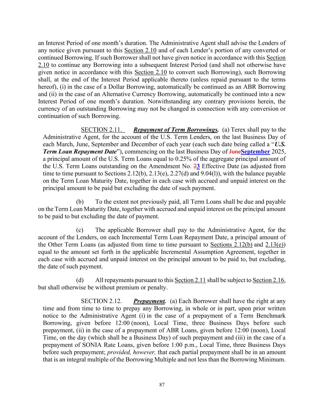66 fulfilled for residents of the relevant U.K. Treaty State to be paid interest without the deduction of United Kingdom Tax (assuming the completion of any procedural formalities). “U.K. Treaty State” shall mean a jurisdiction having a double taxation agreement (a “U.K. Tax Treaty”) with the United Kingdom which makes provision for full exemption from, or a full refund of, Taxes on interest imposed by the United Kingdom. “Unadjusted Benchmark Replacement” shall mean the applicable Benchmark Replacement excluding the related Benchmark Replacement Adjustment. “Unrestricted Subsidiary” shall mean each Subsidiary listed on Schedule 1.01(e), and each other Subsidiary that is designated as an Unrestricted Subsidiary by Terex pursuant to and in compliance with Section 6.12, in each case, unless and until such Subsidiary is designated or redesignated as a Restricted Subsidiary pursuant to and in compliance with Section 6.12. No Unrestricted Subsidiary may own any Equity Interests of a Restricted Subsidiary. “U.S. Base Rate” shall mean, for any day in the jurisdiction of any Subsidiary Borrower, a rate per annum equal to the greater of (a) the Prime Rate and (b) the rate of interest determined from time to time by the Administrative Agent as its base rate in effect at its principal office in such jurisdiction for determining interest rates on commercial loans made in such jurisdiction and denominated in dollars. “U.S. Borrower” shall mean Terex and each other Subsidiary Borrower that is a U.S. Subsidiary. “U.S. Contract Loan Commitment” shall mean the commitment of a Revolving Credit Lender to make U.S. Contract Loans pursuant to Section 2.29. “U.S. Contract Loan Exposure” shall mean, at any time, the aggregate principal amount of all outstanding U.S. Contract Loans at such time. “USD Benchmark” shall have the meaning assigned to such term in the definition of “Benchmark”. “U.S. Government Securities Business Day” shall mean any day except for (a) a Saturday, (b) a Sunday or (c) a day on which the Securities Industry and Financial Markets Association recommends that the fixed income departments of its members be closed for the entire day for purposes of trading in United States government securities. “U.S. L/C Exposure” shall mean at any time the sum of (a) the aggregate undrawn amount of all outstanding U.S. Letters of Credit at such time and (b) the aggregate principal amount of all U.S. L/C Disbursements that have not yet been reimbursed at such time. The U.S. L/C Exposure of any U.S. Revolving Credit Lender at any time shall mean its Pro Rata Percentage of the total U.S. L/C Exposure at such time. “U.S. Letter of Credit” shall mean a Letter of Credit that is issued or deemed issued under the U.S. Revolving Credit Commitments.