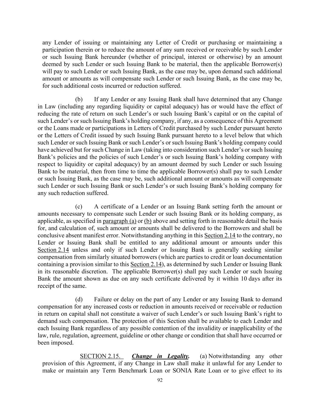 114 Revolving Credit Commitments that are the same Class as the Incremental Revolving Loans and shall not apply to any other Class of Revolving Loans. (e) Notwithstanding anything to the contrary herein, this Section 2.27 shall supersede any provisions in Sections 2.17 or 9.08 to the contrary. SECTION 2.28. Defaulting Lenders. (a) Notwithstanding any provision of this Agreement to the contrary, if any Lender becomes a Defaulting Lender, then, until such time as such Lender is no longer a Defaulting Lender, to the extent permitted by applicable law: (i) Such Defaulting Lender’s right to approve or disapprove any amendment, waiver or consent with respect to this Agreement shall be restricted as set forth in the definition of Required Lenders. (ii) Any payment of principal, interest, fees or other amounts received by the Administrative Agent for the account of such Defaulting Lender (whether voluntary or mandatory, at maturity, pursuant to Article VII or otherwise) or received by the Administrative Agent from a Defaulting Lender pursuant to Section 9.06 shall be applied at such time or times as may be determined by the Administrative Agent as follows: first, to the payment of any amounts owing by such Defaulting Lender to the Administrative Agent hereunder; second, to the payment on a pro rata basis of any amounts owing by such Defaulting Lender to any Issuing Bank or U.S. Swingline Lender hereunder; third, to cash collateralize, in accordance with Section 2.23(j), the Issuing Banks’ Fronting Exposure with respect to such Defaulting Lender; fourth, as the applicable Borrower may request (so long as no Default or Event of Default exists), to the funding of any Loan in respect of which such Defaulting Lender has failed to fund its portion thereof as required by this Agreement, as determined by the Administrative Agent; fifth, if so determined by the Administrative Agent and the applicable Borrower, to be held in a deposit account and released pro rata in order to (A) satisfy such Defaulting Lender’s potential future funding obligations with respect to Loans under this Agreement and (B) cash collateralize, in accordance with Section 2.23(j), the Issuing Banks’ future Fronting Exposure with respect to such Defaulting Lender with respect to future Letters of Credit issued under this Agreement; sixth, to the payment of any amounts owing to the Lenders, the Issuing Banks or the U.S. Swingline Lenders as a result of any judgment of a court of competent jurisdiction obtained by any Lender, Issuing Bank or U.S. Swingline Lender against such Defaulting Lender as a result of such Defaulting Lender’s breach of its obligations under this Agreement; seventh, so long as no Default or Event of Default exists, to the payment of any amounts owing to a Borrower as a result of any judgment of a court of competent jurisdiction obtained by a Borrower against such Defaulting Lender as a result of such Defaulting Lender’s breach of its obligations under this Agreement; and eighth, to such Defaulting Lender or as otherwise directed by a court of competent jurisdiction; provided that if (x) such payment is a payment of the principal amount of any Loans or L/C Disbursements in respect of which such Defaulting Lender has not fully funded its appropriate share and (y) such Loans were made or the related Letters of Credit were issued at a time when the conditions set forth in Section 4.02 were satisfied or waived, such payment shall be applied solely to pay the Loans of, and L/C Disbursements owed to, all Non-Defaulting Lenders on a pro rata basis prior to being applied to the payment of any