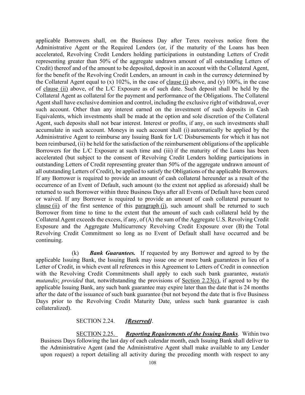 108 applicable Borrowers shall, on the Business Day after Terex receives notice from the Administrative Agent or the Required Lenders (or, if the maturity of the Loans has been accelerated, Revolving Credit Lenders holding participations in outstanding Letters of Credit representing greater than 50% of the aggregate undrawn amount of all outstanding Letters of Credit) thereof and of the amount to be deposited, deposit in an account with the Collateral Agent, for the benefit of the Revolving Credit Lenders, an amount in cash in the currency determined by the Collateral Agent equal to (x) 102%, in the case of clause (i) above, and (y) 100%, in the case of clause (ii) above, of the L/C Exposure as of such date. Such deposit shall be held by the Collateral Agent as collateral for the payment and performance of the Obligations. The Collateral Agent shall have exclusive dominion and control, including the exclusive right of withdrawal, over such account. Other than any interest earned on the investment of such deposits in Cash Equivalents, which investments shall be made at the option and sole discretion of the Collateral Agent, such deposits shall not bear interest. Interest or profits, if any, on such investments shall accumulate in such account. Moneys in such account shall (i) automatically be applied by the Administrative Agent to reimburse any Issuing Bank for L/C Disbursements for which it has not been reimbursed, (ii) be held for the satisfaction of the reimbursement obligations of the applicable Borrowers for the L/C Exposure at such time and (iii) if the maturity of the Loans has been accelerated (but subject to the consent of Revolving Credit Lenders holding participations in outstanding Letters of Credit representing greater than 50% of the aggregate undrawn amount of all outstanding Letters of Credit), be applied to satisfy the Obligations of the applicable Borrowers. If any Borrower is required to provide an amount of cash collateral hereunder as a result of the occurrence of an Event of Default, such amount (to the extent not applied as aforesaid) shall be returned to such Borrower within three Business Days after all Events of Default have been cured or waived. If any Borrower is required to provide an amount of cash collateral pursuant to clause (ii) of the first sentence of this paragraph (j), such amount shall be returned to such Borrower from time to time to the extent that the amount of such cash collateral held by the Collateral Agent exceeds the excess, if any, of (A) the sum of the Aggregate U.S. Revolving Credit Exposure and the Aggregate Multicurrency Revolving Credit Exposure over (B) the Total Revolving Credit Commitment so long as no Event of Default shall have occurred and be continuing. (k) Bank Guarantees. If requested by any Borrower and agreed to by the applicable Issuing Bank, the Issuing Bank may issue one or more bank guarantees in lieu of a Letter of Credit, in which event all references in this Agreement to Letters of Credit in connection with the Revolving Credit Commitments shall apply to each such bank guarantee, mutatis mutandis; provided that, notwithstanding the provisions of Section 2.23(c), if agreed to by the applicable Issuing Bank, any such bank guarantee may expire later than the date that is 24 months after the date of the issuance of such bank guarantee (but not beyond the date that is five Business Days prior to the Revolving Credit Maturity Date, unless such bank guarantee is cash collateralized). SECTION 2.24. [Reserved]. SECTION 2.25. Reporting Requirements of the Issuing Banks. Within two Business Days following the last day of each calendar month, each Issuing Bank shall deliver to the Administrative Agent (and the Administrative Agent shall make available to any Lender upon request) a report detailing all activity during the preceding month with respect to any