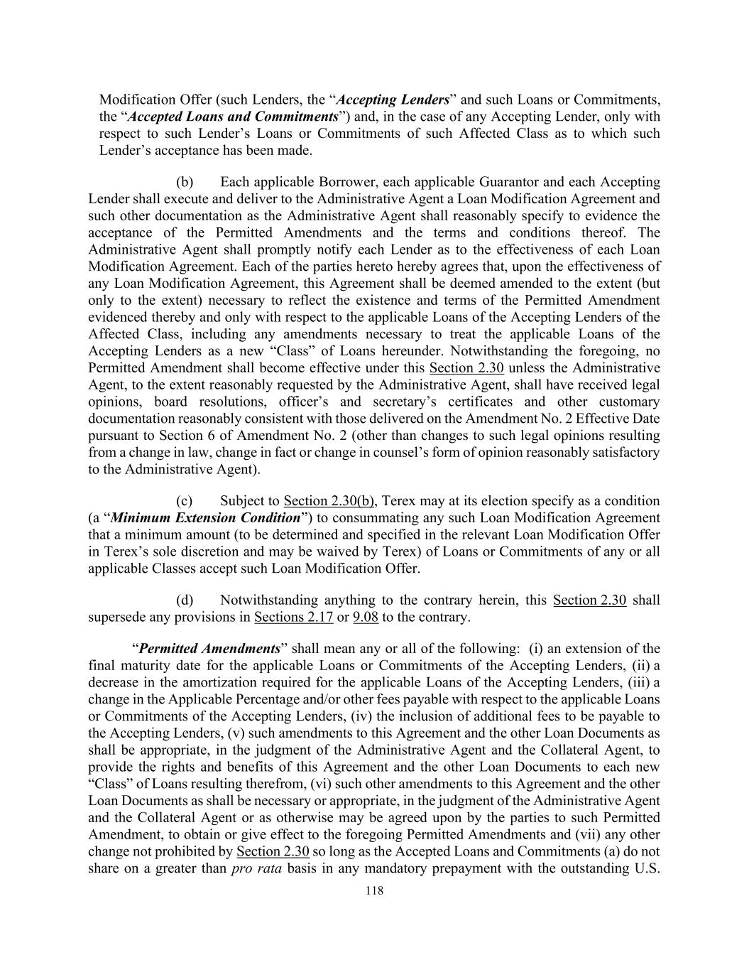 118 Modification Offer (such Lenders, the “Accepting Lenders” and such Loans or Commitments, the “Accepted Loans and Commitments”) and, in the case of any Accepting Lender, only with respect to such Lender’s Loans or Commitments of such Affected Class as to which such Lender’s acceptance has been made. (b) Each applicable Borrower, each applicable Guarantor and each Accepting Lender shall execute and deliver to the Administrative Agent a Loan Modification Agreement and such other documentation as the Administrative Agent shall reasonably specify to evidence the acceptance of the Permitted Amendments and the terms and conditions thereof. The Administrative Agent shall promptly notify each Lender as to the effectiveness of each Loan Modification Agreement. Each of the parties hereto hereby agrees that, upon the effectiveness of any Loan Modification Agreement, this Agreement shall be deemed amended to the extent (but only to the extent) necessary to reflect the existence and terms of the Permitted Amendment evidenced thereby and only with respect to the applicable Loans of the Accepting Lenders of the Affected Class, including any amendments necessary to treat the applicable Loans of the Accepting Lenders as a new “Class” of Loans hereunder. Notwithstanding the foregoing, no Permitted Amendment shall become effective under this Section 2.30 unless the Administrative Agent, to the extent reasonably requested by the Administrative Agent, shall have received legal opinions, board resolutions, officer’s and secretary’s certificates and other customary documentation reasonably consistent with those delivered on the Amendment No. 2 Effective Date pursuant to Section 6 of Amendment No. 2 (other than changes to such legal opinions resulting from a change in law, change in fact or change in counsel’s form of opinion reasonably satisfactory to the Administrative Agent). (c) Subject to Section 2.30(b), Terex may at its election specify as a condition (a “Minimum Extension Condition”) to consummating any such Loan Modification Agreement that a minimum amount (to be determined and specified in the relevant Loan Modification Offer in Terex’s sole discretion and may be waived by Terex) of Loans or Commitments of any or all applicable Classes accept such Loan Modification Offer. (d) Notwithstanding anything to the contrary herein, this Section 2.30 shall supersede any provisions in Sections 2.17 or 9.08 to the contrary. “Permitted Amendments” shall mean any or all of the following: (i) an extension of the final maturity date for the applicable Loans or Commitments of the Accepting Lenders, (ii) a decrease in the amortization required for the applicable Loans of the Accepting Lenders, (iii) a change in the Applicable Percentage and/or other fees payable with respect to the applicable Loans or Commitments of the Accepting Lenders, (iv) the inclusion of additional fees to be payable to the Accepting Lenders, (v) such amendments to this Agreement and the other Loan Documents as shall be appropriate, in the judgment of the Administrative Agent and the Collateral Agent, to provide the rights and benefits of this Agreement and the other Loan Documents to each new “Class” of Loans resulting therefrom, (vi) such other amendments to this Agreement and the other Loan Documents as shall be necessary or appropriate, in the judgment of the Administrative Agent and the Collateral Agent or as otherwise may be agreed upon by the parties to such Permitted Amendment, to obtain or give effect to the foregoing Permitted Amendments and (vii) any other change not prohibited by Section 2.30 so long as the Accepted Loans and Commitments (a) do not share on a greater than pro rata basis in any mandatory prepayment with the outstanding U.S.