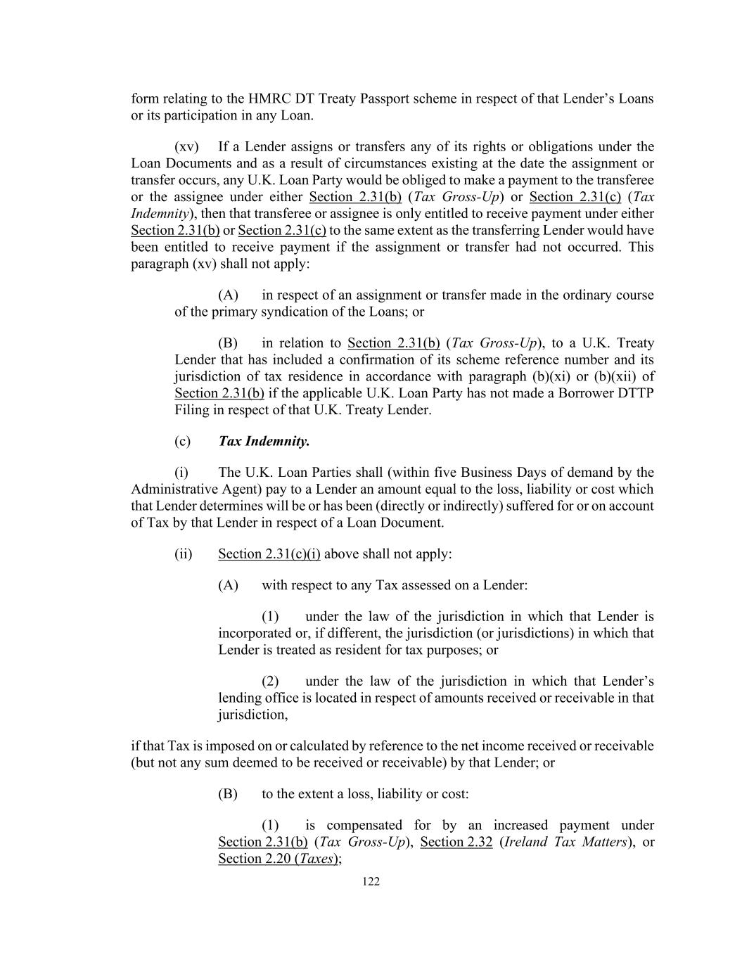 122 form relating to the HMRC DT Treaty Passport scheme in respect of that Lender’s Loans or its participation in any Loan. (xv) If a Lender assigns or transfers any of its rights or obligations under the Loan Documents and as a result of circumstances existing at the date the assignment or transfer occurs, any U.K. Loan Party would be obliged to make a payment to the transferee or the assignee under either Section 2.31(b) (Tax Gross-Up) or Section 2.31(c) (Tax Indemnity), then that transferee or assignee is only entitled to receive payment under either Section 2.31(b) or Section 2.31(c) to the same extent as the transferring Lender would have been entitled to receive payment if the assignment or transfer had not occurred. This paragraph (xv) shall not apply: (A) in respect of an assignment or transfer made in the ordinary course of the primary syndication of the Loans; or (B) in relation to Section 2.31(b) (Tax Gross-Up), to a U.K. Treaty Lender that has included a confirmation of its scheme reference number and its jurisdiction of tax residence in accordance with paragraph (b)(xi) or (b)(xii) of Section 2.31(b) if the applicable U.K. Loan Party has not made a Borrower DTTP Filing in respect of that U.K. Treaty Lender. (c) Tax Indemnity. (i) The U.K. Loan Parties shall (within five Business Days of demand by the Administrative Agent) pay to a Lender an amount equal to the loss, liability or cost which that Lender determines will be or has been (directly or indirectly) suffered for or on account of Tax by that Lender in respect of a Loan Document. (ii) Section 2.31(c)(i) above shall not apply: (A) with respect to any Tax assessed on a Lender: (1) under the law of the jurisdiction in which that Lender is incorporated or, if different, the jurisdiction (or jurisdictions) in which that Lender is treated as resident for tax purposes; or (2) under the law of the jurisdiction in which that Lender’s lending office is located in respect of amounts received or receivable in that jurisdiction, if that Tax is imposed on or calculated by reference to the net income received or receivable (but not any sum deemed to be received or receivable) by that Lender; or (B) to the extent a loss, liability or cost: (1) is compensated for by an increased payment under Section 2.31(b) (Tax Gross-Up), Section 2.32 (Ireland Tax Matters), or Section 2.20 (Taxes);