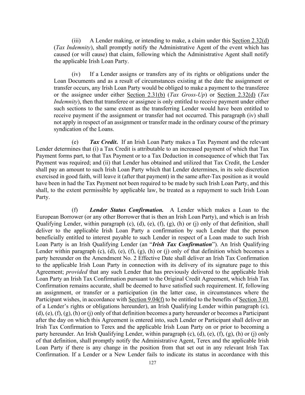 127 (iii) A Lender making, or intending to make, a claim under this Section 2.32(d) (Tax Indemnity), shall promptly notify the Administrative Agent of the event which has caused (or will cause) that claim, following which the Administrative Agent shall notify the applicable Irish Loan Party. (iv) If a Lender assigns or transfers any of its rights or obligations under the Loan Documents and as a result of circumstances existing at the date the assignment or transfer occurs, any Irish Loan Party would be obliged to make a payment to the transferee or the assignee under either Section 2.31(b) (Tax Gross-Up) or Section 2.32(d) (Tax Indemnity), then that transferee or assignee is only entitled to receive payment under either such sections to the same extent as the transferring Lender would have been entitled to receive payment if the assignment or transfer had not occurred. This paragraph (iv) shall not apply in respect of an assignment or transfer made in the ordinary course of the primary syndication of the Loans. (e) Tax Credit. If an Irish Loan Party makes a Tax Payment and the relevant Lender determines that (i) a Tax Credit is attributable to an increased payment of which that Tax Payment forms part, to that Tax Payment or to a Tax Deduction in consequence of which that Tax Payment was required; and (ii) that Lender has obtained and utilized that Tax Credit, the Lender shall pay an amount to such Irish Loan Party which that Lender determines, in its sole discretion exercised in good faith, will leave it (after that payment) in the same after-Tax position as it would have been in had the Tax Payment not been required to be made by such Irish Loan Party, and this shall, to the extent permissible by applicable law, be treated as a repayment to such Irish Loan Party. (f) Lender Status Confirmation. A Lender which makes a Loan to the European Borrower (or any other Borrower that is then an Irish Loan Party), and which is an Irish Qualifying Lender, within paragraph (c), (d), (e), (f), (g), (h) or (j) only of that definition, shall deliver to the applicable Irish Loan Party a confirmation by such Lender that the person beneficially entitled to interest payable to such Lender in respect of a Loan made to such Irish Loan Party is an Irish Qualifying Lender (an “Irish Tax Confirmation”). An Irish Qualifying Lender within paragraph (c), (d), (e), (f), (g), (h) or (j) only of that definition which becomes a party hereunder on the Amendment No. 2 Effective Date shall deliver an Irish Tax Confirmation to the applicable Irish Loan Party in connection with its delivery of its signature page to this Agreement; provided that any such Lender that has previously delivered to the applicable Irish Loan Party an Irish Tax Confirmation pursuant to the Original Credit Agreement, which Irish Tax Confirmation remains accurate, shall be deemed to have satisfied such requirement. If, following an assignment, or transfer or a participation (in the latter case, in circumstances where the Participant wishes, in accordance with Section 9.04(f) to be entitled to the benefits of Section 3.01 of a Lender’s rights or obligations hereunder), an Irish Qualifying Lender within paragraph (c), (d), (e), (f), (g), (h) or (j) only of that definition becomes a party hereunder or becomes a Participant after the day on which this Agreement is entered into, such Lender or Participant shall deliver an Irish Tax Confirmation to Terex and the applicable Irish Loan Party on or prior to becoming a party hereunder. An Irish Qualifying Lender, within paragraph (c), (d), (e), (f), (g), (h) or (j) only of that definition, shall promptly notify the Administrative Agent, Terex and the applicable Irish Loan Party if there is any change in the position from that set out in any relevant Irish Tax Confirmation. If a Lender or a New Lender fails to indicate its status in accordance with this
