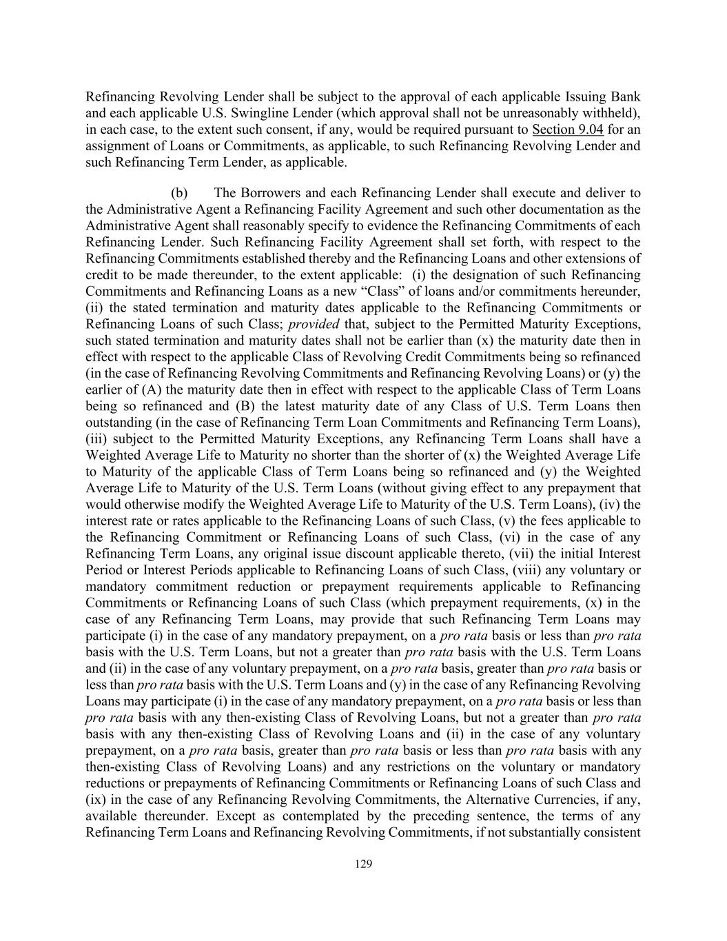 129 Refinancing Revolving Lender shall be subject to the approval of each applicable Issuing Bank and each applicable U.S. Swingline Lender (which approval shall not be unreasonably withheld), in each case, to the extent such consent, if any, would be required pursuant to Section 9.04 for an assignment of Loans or Commitments, as applicable, to such Refinancing Revolving Lender and such Refinancing Term Lender, as applicable. (b) The Borrowers and each Refinancing Lender shall execute and deliver to the Administrative Agent a Refinancing Facility Agreement and such other documentation as the Administrative Agent shall reasonably specify to evidence the Refinancing Commitments of each Refinancing Lender. Such Refinancing Facility Agreement shall set forth, with respect to the Refinancing Commitments established thereby and the Refinancing Loans and other extensions of credit to be made thereunder, to the extent applicable: (i) the designation of such Refinancing Commitments and Refinancing Loans as a new “Class” of loans and/or commitments hereunder, (ii) the stated termination and maturity dates applicable to the Refinancing Commitments or Refinancing Loans of such Class; provided that, subject to the Permitted Maturity Exceptions, such stated termination and maturity dates shall not be earlier than (x) the maturity date then in effect with respect to the applicable Class of Revolving Credit Commitments being so refinanced (in the case of Refinancing Revolving Commitments and Refinancing Revolving Loans) or (y) the earlier of (A) the maturity date then in effect with respect to the applicable Class of Term Loans being so refinanced and (B) the latest maturity date of any Class of U.S. Term Loans then outstanding (in the case of Refinancing Term Loan Commitments and Refinancing Term Loans), (iii) subject to the Permitted Maturity Exceptions, any Refinancing Term Loans shall have a Weighted Average Life to Maturity no shorter than the shorter of (x) the Weighted Average Life to Maturity of the applicable Class of Term Loans being so refinanced and (y) the Weighted Average Life to Maturity of the U.S. Term Loans (without giving effect to any prepayment that would otherwise modify the Weighted Average Life to Maturity of the U.S. Term Loans), (iv) the interest rate or rates applicable to the Refinancing Loans of such Class, (v) the fees applicable to the Refinancing Commitment or Refinancing Loans of such Class, (vi) in the case of any Refinancing Term Loans, any original issue discount applicable thereto, (vii) the initial Interest Period or Interest Periods applicable to Refinancing Loans of such Class, (viii) any voluntary or mandatory commitment reduction or prepayment requirements applicable to Refinancing Commitments or Refinancing Loans of such Class (which prepayment requirements, (x) in the case of any Refinancing Term Loans, may provide that such Refinancing Term Loans may participate (i) in the case of any mandatory prepayment, on a pro rata basis or less than pro rata basis with the U.S. Term Loans, but not a greater than pro rata basis with the U.S. Term Loans and (ii) in the case of any voluntary prepayment, on a pro rata basis, greater than pro rata basis or less than pro rata basis with the U.S. Term Loans and (y) in the case of any Refinancing Revolving Loans may participate (i) in the case of any mandatory prepayment, on a pro rata basis or less than pro rata basis with any then-existing Class of Revolving Loans, but not a greater than pro rata basis with any then-existing Class of Revolving Loans and (ii) in the case of any voluntary prepayment, on a pro rata basis, greater than pro rata basis or less than pro rata basis with any then-existing Class of Revolving Loans) and any restrictions on the voluntary or mandatory reductions or prepayments of Refinancing Commitments or Refinancing Loans of such Class and (ix) in the case of any Refinancing Revolving Commitments, the Alternative Currencies, if any, available thereunder. Except as contemplated by the preceding sentence, the terms of any Refinancing Term Loans and Refinancing Revolving Commitments, if not substantially consistent
