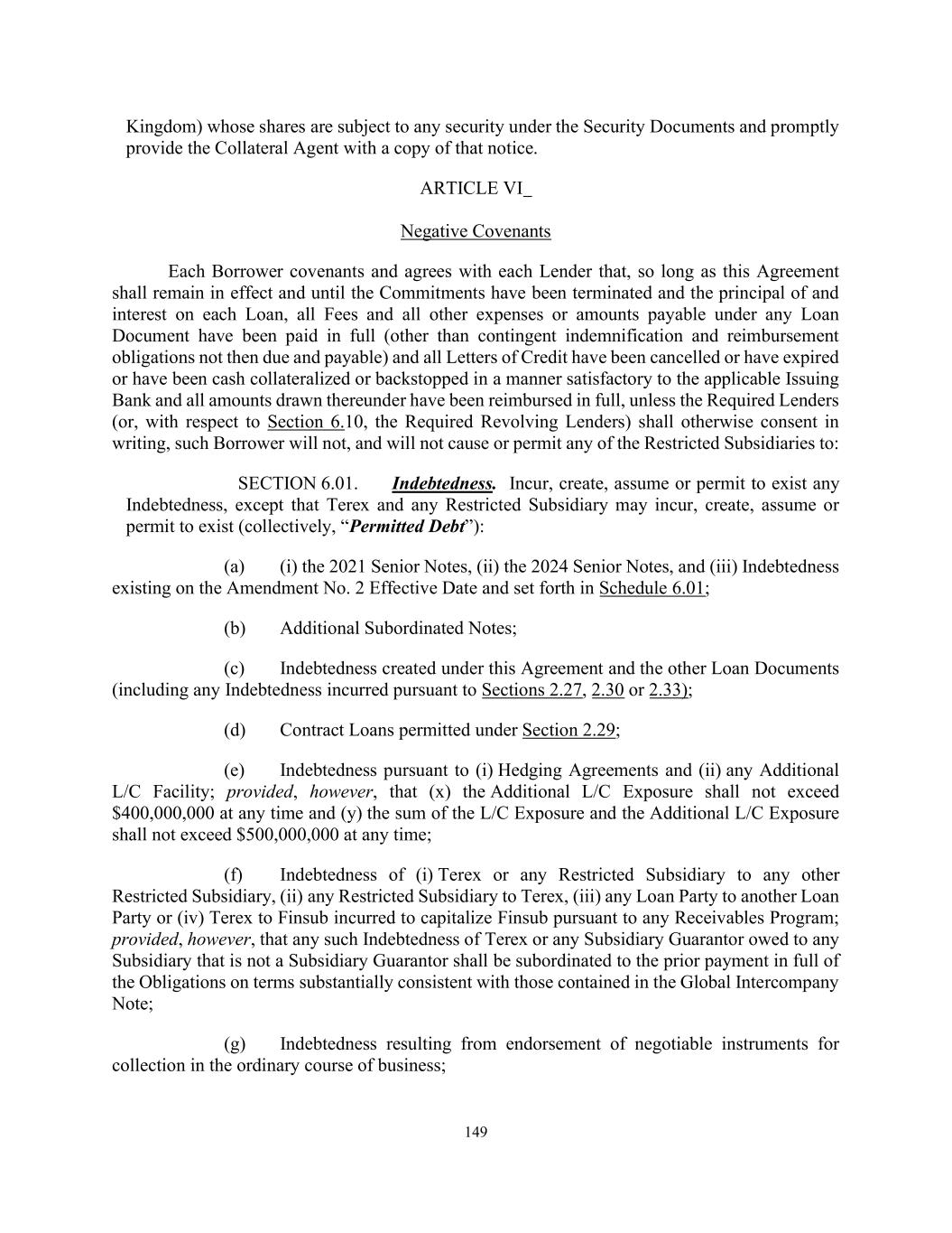 149 Kingdom) whose shares are subject to any security under the Security Documents and promptly provide the Collateral Agent with a copy of that notice. ARTICLE VI Negative Covenants Each Borrower covenants and agrees with each Lender that, so long as this Agreement shall remain in effect and until the Commitments have been terminated and the principal of and interest on each Loan, all Fees and all other expenses or amounts payable under any Loan Document have been paid in full (other than contingent indemnification and reimbursement obligations not then due and payable) and all Letters of Credit have been cancelled or have expired or have been cash collateralized or backstopped in a manner satisfactory to the applicable Issuing Bank and all amounts drawn thereunder have been reimbursed in full, unless the Required Lenders (or, with respect to Section 6.10, the Required Revolving Lenders) shall otherwise consent in writing, such Borrower will not, and will not cause or permit any of the Restricted Subsidiaries to: SECTION 6.01. Indebtedness. Incur, create, assume or permit to exist any Indebtedness, except that Terex and any Restricted Subsidiary may incur, create, assume or permit to exist (collectively, “Permitted Debt”): (a) (i) the 2021 Senior Notes, (ii) the 2024 Senior Notes, and (iii) Indebtedness existing on the Amendment No. 2 Effective Date and set forth in Schedule 6.01; (b) Additional Subordinated Notes; (c) Indebtedness created under this Agreement and the other Loan Documents (including any Indebtedness incurred pursuant to Sections 2.27, 2.30 or 2.33); (d) Contract Loans permitted under Section 2.29; (e) Indebtedness pursuant to (i) Hedging Agreements and (ii) any Additional L/C Facility; provided, however, that (x) the Additional L/C Exposure shall not exceed $400,000,000 at any time and (y) the sum of the L/C Exposure and the Additional L/C Exposure shall not exceed $500,000,000 at any time; (f) Indebtedness of (i) Terex or any Restricted Subsidiary to any other Restricted Subsidiary, (ii) any Restricted Subsidiary to Terex, (iii) any Loan Party to another Loan Party or (iv) Terex to Finsub incurred to capitalize Finsub pursuant to any Receivables Program; provided, however, that any such Indebtedness of Terex or any Subsidiary Guarantor owed to any Subsidiary that is not a Subsidiary Guarantor shall be subordinated to the prior payment in full of the Obligations on terms substantially consistent with those contained in the Global Intercompany Note; (g) Indebtedness resulting from endorsement of negotiable instruments for collection in the ordinary course of business;