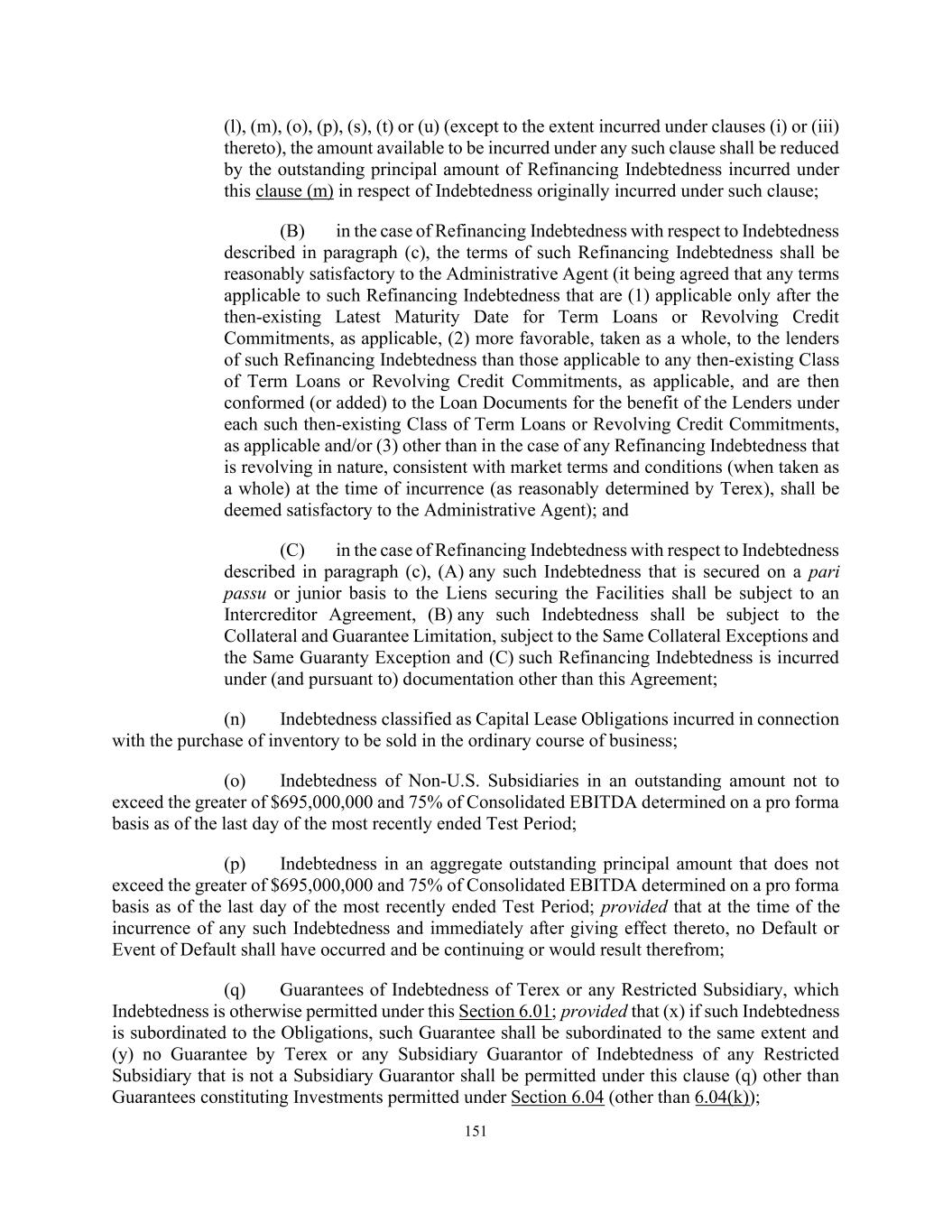 151 (l), (m), (o), (p), (s), (t) or (u) (except to the extent incurred under clauses (i) or (iii) thereto), the amount available to be incurred under any such clause shall be reduced by the outstanding principal amount of Refinancing Indebtedness incurred under this clause (m) in respect of Indebtedness originally incurred under such clause; (B) in the case of Refinancing Indebtedness with respect to Indebtedness described in paragraph (c), the terms of such Refinancing Indebtedness shall be reasonably satisfactory to the Administrative Agent (it being agreed that any terms applicable to such Refinancing Indebtedness that are (1) applicable only after the then-existing Latest Maturity Date for Term Loans or Revolving Credit Commitments, as applicable, (2) more favorable, taken as a whole, to the lenders of such Refinancing Indebtedness than those applicable to any then-existing Class of Term Loans or Revolving Credit Commitments, as applicable, and are then conformed (or added) to the Loan Documents for the benefit of the Lenders under each such then-existing Class of Term Loans or Revolving Credit Commitments, as applicable and/or (3) other than in the case of any Refinancing Indebtedness that is revolving in nature, consistent with market terms and conditions (when taken as a whole) at the time of incurrence (as reasonably determined by Terex), shall be deemed satisfactory to the Administrative Agent); and (C) in the case of Refinancing Indebtedness with respect to Indebtedness described in paragraph (c), (A) any such Indebtedness that is secured on a pari passu or junior basis to the Liens securing the Facilities shall be subject to an Intercreditor Agreement, (B) any such Indebtedness shall be subject to the Collateral and Guarantee Limitation, subject to the Same Collateral Exceptions and the Same Guaranty Exception and (C) such Refinancing Indebtedness is incurred under (and pursuant to) documentation other than this Agreement; (n) Indebtedness classified as Capital Lease Obligations incurred in connection with the purchase of inventory to be sold in the ordinary course of business; (o) Indebtedness of Non-U.S. Subsidiaries in an outstanding amount not to exceed the greater of $695,000,000 and 75% of Consolidated EBITDA determined on a pro forma basis as of the last day of the most recently ended Test Period; (p) Indebtedness in an aggregate outstanding principal amount that does not exceed the greater of $695,000,000 and 75% of Consolidated EBITDA determined on a pro forma basis as of the last day of the most recently ended Test Period; provided that at the time of the incurrence of any such Indebtedness and immediately after giving effect thereto, no Default or Event of Default shall have occurred and be continuing or would result therefrom; (q) Guarantees of Indebtedness of Terex or any Restricted Subsidiary, which Indebtedness is otherwise permitted under this Section 6.01; provided that (x) if such Indebtedness is subordinated to the Obligations, such Guarantee shall be subordinated to the same extent and (y) no Guarantee by Terex or any Subsidiary Guarantor of Indebtedness of any Restricted Subsidiary that is not a Subsidiary Guarantor shall be permitted under this clause (q) other than Guarantees constituting Investments permitted under Section 6.04 (other than 6.04(k));