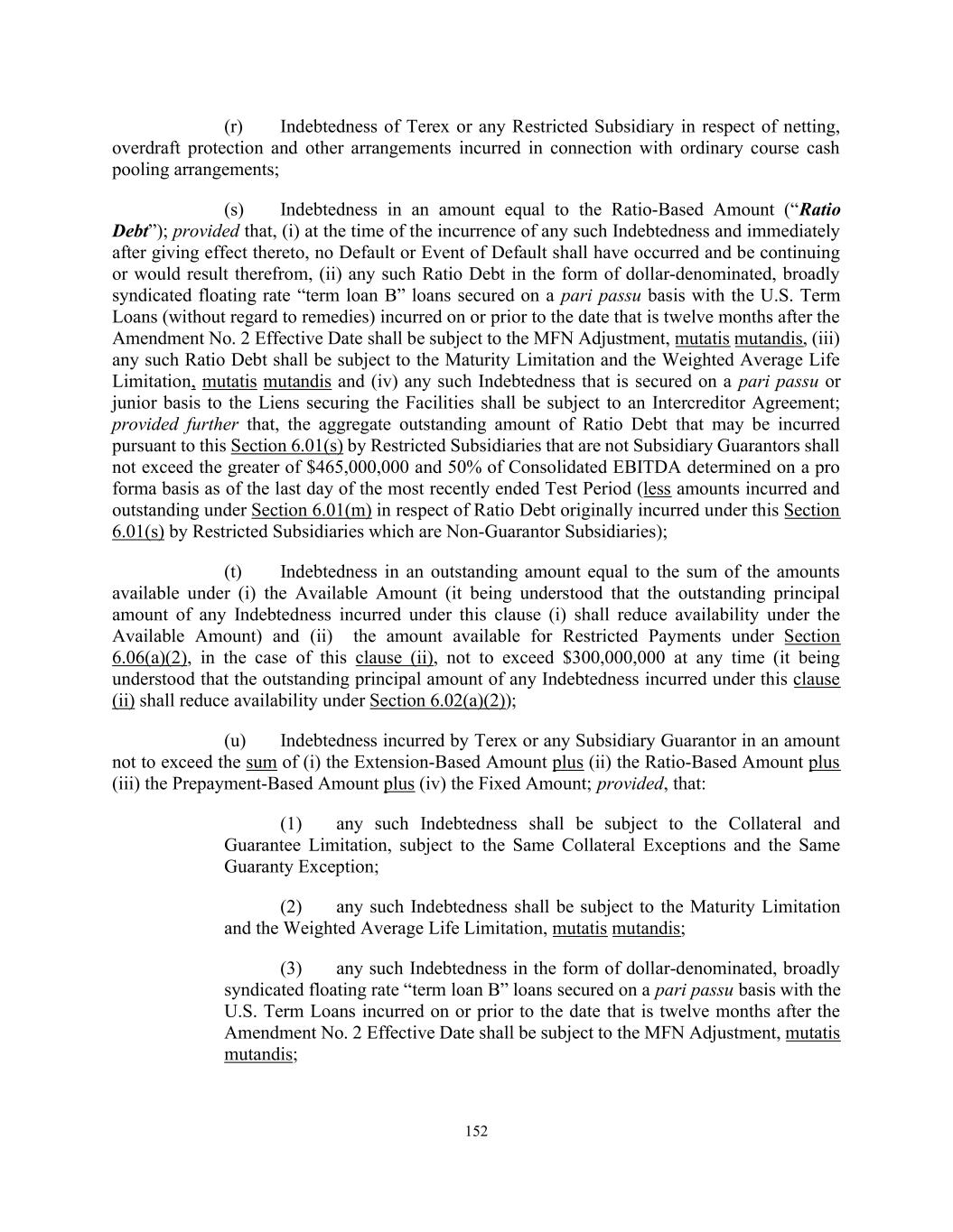 152 (r) Indebtedness of Terex or any Restricted Subsidiary in respect of netting, overdraft protection and other arrangements incurred in connection with ordinary course cash pooling arrangements; (s) Indebtedness in an amount equal to the Ratio-Based Amount (“Ratio Debt”); provided that, (i) at the time of the incurrence of any such Indebtedness and immediately after giving effect thereto, no Default or Event of Default shall have occurred and be continuing or would result therefrom, (ii) any such Ratio Debt in the form of dollar-denominated, broadly syndicated floating rate “term loan B” loans secured on a pari passu basis with the U.S. Term Loans (without regard to remedies) incurred on or prior to the date that is twelve months after the Amendment No. 2 Effective Date shall be subject to the MFN Adjustment, mutatis mutandis, (iii) any such Ratio Debt shall be subject to the Maturity Limitation and the Weighted Average Life Limitation, mutatis mutandis and (iv) any such Indebtedness that is secured on a pari passu or junior basis to the Liens securing the Facilities shall be subject to an Intercreditor Agreement; provided further that, the aggregate outstanding amount of Ratio Debt that may be incurred pursuant to this Section 6.01(s) by Restricted Subsidiaries that are not Subsidiary Guarantors shall not exceed the greater of $465,000,000 and 50% of Consolidated EBITDA determined on a pro forma basis as of the last day of the most recently ended Test Period (less amounts incurred and outstanding under Section 6.01(m) in respect of Ratio Debt originally incurred under this Section 6.01(s) by Restricted Subsidiaries which are Non-Guarantor Subsidiaries); (t) Indebtedness in an outstanding amount equal to the sum of the amounts available under (i) the Available Amount (it being understood that the outstanding principal amount of any Indebtedness incurred under this clause (i) shall reduce availability under the Available Amount) and (ii) the amount available for Restricted Payments under Section 6.06(a)(2), in the case of this clause (ii), not to exceed $300,000,000 at any time (it being understood that the outstanding principal amount of any Indebtedness incurred under this clause (ii) shall reduce availability under Section 6.02(a)(2)); (u) Indebtedness incurred by Terex or any Subsidiary Guarantor in an amount not to exceed the sum of (i) the Extension-Based Amount plus (ii) the Ratio-Based Amount plus (iii) the Prepayment-Based Amount plus (iv) the Fixed Amount; provided, that: (1) any such Indebtedness shall be subject to the Collateral and Guarantee Limitation, subject to the Same Collateral Exceptions and the Same Guaranty Exception; (2) any such Indebtedness shall be subject to the Maturity Limitation and the Weighted Average Life Limitation, mutatis mutandis; (3) any such Indebtedness in the form of dollar-denominated, broadly syndicated floating rate “term loan B” loans secured on a pari passu basis with the U.S. Term Loans incurred on or prior to the date that is twelve months after the Amendment No. 2 Effective Date shall be subject to the MFN Adjustment, mutatis mutandis;