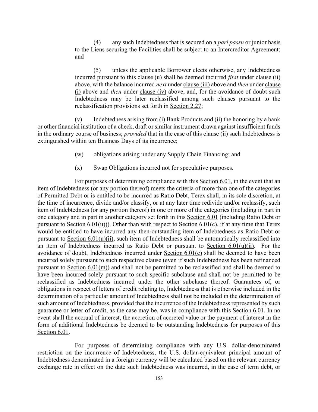 153 (4) any such Indebtedness that is secured on a pari passu or junior basis to the Liens securing the Facilities shall be subject to an Intercreditor Agreement; and (5) unless the applicable Borrower elects otherwise, any Indebtedness incurred pursuant to this clause (u) shall be deemed incurred first under clause (ii) above, with the balance incurred next under clause (iii) above and then under clause (i) above and then under clause (iv) above, and, for the avoidance of doubt such Indebtedness may be later reclassified among such clauses pursuant to the reclassification provisions set forth in Section 2.27; (v) Indebtedness arising from (i) Bank Products and (ii) the honoring by a bank or other financial institution of a check, draft or similar instrument drawn against insufficient funds in the ordinary course of business; provided that in the case of this clause (ii) such Indebtedness is extinguished within ten Business Days of its incurrence; (w) obligations arising under any Supply Chain Financing; and (x) Swap Obligations incurred not for speculative purposes. For purposes of determining compliance with this Section 6.01, in the event that an item of Indebtedness (or any portion thereof) meets the criteria of more than one of the categories of Permitted Debt or is entitled to be incurred as Ratio Debt, Terex shall, in its sole discretion, at the time of incurrence, divide and/or classify, or at any later time redivide and/or reclassify, such item of Indebtedness (or any portion thereof) in one or more of the categories (including in part in one category and in part in another category set forth in this Section 6.01 (including Ratio Debt or pursuant to Section 6.01(u))). Other than with respect to Section 6.01(c), if at any time that Terex would be entitled to have incurred any then-outstanding item of Indebtedness as Ratio Debt or pursuant to Section 6.01(u)(ii), such item of Indebtedness shall be automatically reclassified into an item of Indebtedness incurred as Ratio Debt or pursuant to Section 6.01(u)(ii). For the avoidance of doubt, Indebtedness incurred under Section 6.01(c) shall be deemed to have been incurred solely pursuant to such respective clause (even if such Indebtedness has been refinanced pursuant to Section 6.01(m)) and shall not be permitted to be reclassified and shall be deemed to have been incurred solely pursuant to such specific subclause and shall not be permitted to be reclassified as Indebtedness incurred under the other subclause thereof. Guarantees of, or obligations in respect of letters of credit relating to, Indebtedness that is otherwise included in the determination of a particular amount of Indebtedness shall not be included in the determination of such amount of Indebtedness, provided that the incurrence of the Indebtedness represented by such guarantee or letter of credit, as the case may be, was in compliance with this Section 6.01. In no event shall the accrual of interest, the accretion of accreted value or the payment of interest in the form of additional Indebtedness be deemed to be outstanding Indebtedness for purposes of this Section 6.01. For purposes of determining compliance with any U.S. dollar-denominated restriction on the incurrence of Indebtedness, the U.S. dollar-equivalent principal amount of Indebtedness denominated in a foreign currency will be calculated based on the relevant currency exchange rate in effect on the date such Indebtedness was incurred, in the case of term debt, or