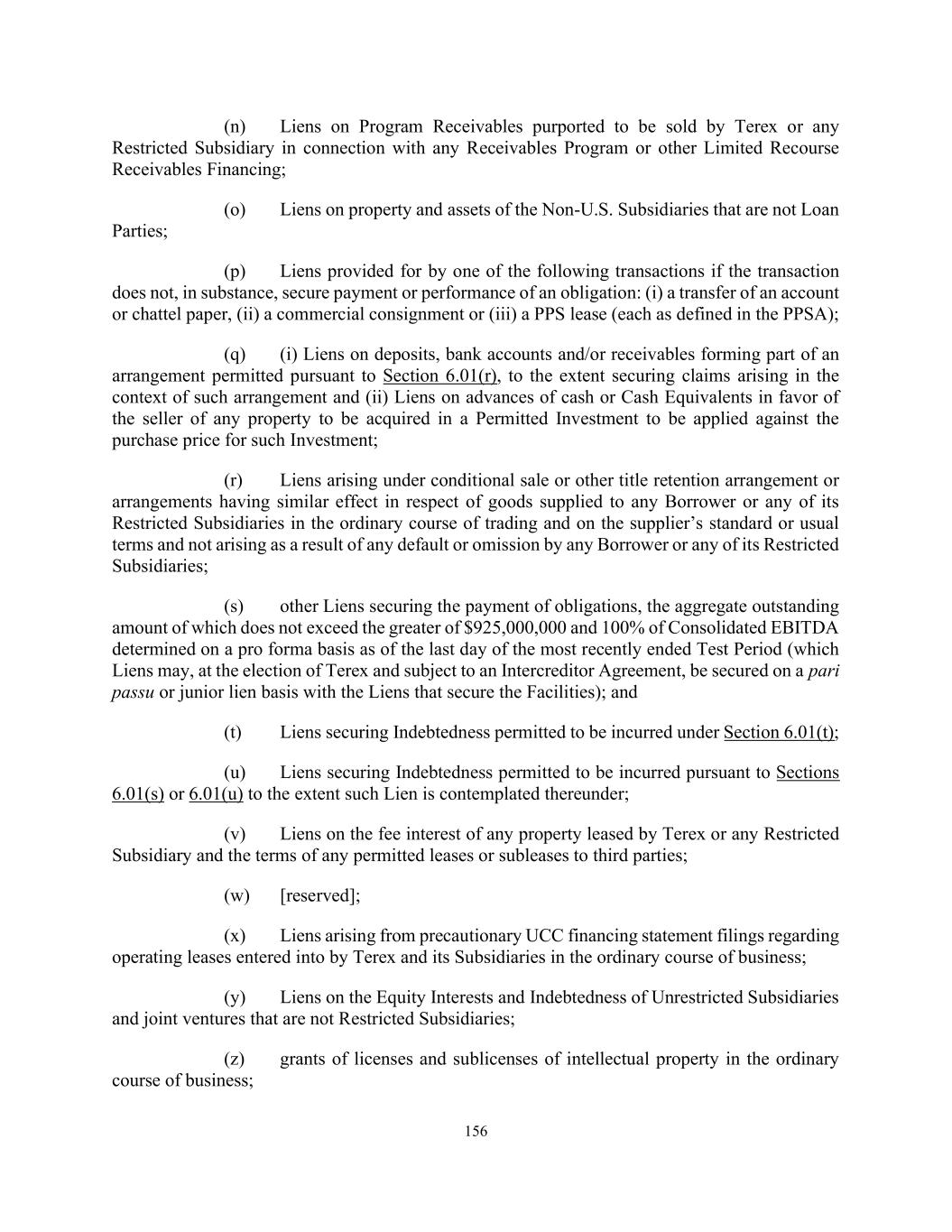 156 (n) Liens on Program Receivables purported to be sold by Terex or any Restricted Subsidiary in connection with any Receivables Program or other Limited Recourse Receivables Financing; (o) Liens on property and assets of the Non-U.S. Subsidiaries that are not Loan Parties; (p) Liens provided for by one of the following transactions if the transaction does not, in substance, secure payment or performance of an obligation: (i) a transfer of an account or chattel paper, (ii) a commercial consignment or (iii) a PPS lease (each as defined in the PPSA); (q) (i) Liens on deposits, bank accounts and/or receivables forming part of an arrangement permitted pursuant to Section 6.01(r), to the extent securing claims arising in the context of such arrangement and (ii) Liens on advances of cash or Cash Equivalents in favor of the seller of any property to be acquired in a Permitted Investment to be applied against the purchase price for such Investment; (r) Liens arising under conditional sale or other title retention arrangement or arrangements having similar effect in respect of goods supplied to any Borrower or any of its Restricted Subsidiaries in the ordinary course of trading and on the supplier’s standard or usual terms and not arising as a result of any default or omission by any Borrower or any of its Restricted Subsidiaries; (s) other Liens securing the payment of obligations, the aggregate outstanding amount of which does not exceed the greater of $925,000,000 and 100% of Consolidated EBITDA determined on a pro forma basis as of the last day of the most recently ended Test Period (which Liens may, at the election of Terex and subject to an Intercreditor Agreement, be secured on a pari passu or junior lien basis with the Liens that secure the Facilities); and (t) Liens securing Indebtedness permitted to be incurred under Section 6.01(t); (u) Liens securing Indebtedness permitted to be incurred pursuant to Sections 6.01(s) or 6.01(u) to the extent such Lien is contemplated thereunder; (v) Liens on the fee interest of any property leased by Terex or any Restricted Subsidiary and the terms of any permitted leases or subleases to third parties; (w) [reserved]; (x) Liens arising from precautionary UCC financing statement filings regarding operating leases entered into by Terex and its Subsidiaries in the ordinary course of business; (y) Liens on the Equity Interests and Indebtedness of Unrestricted Subsidiaries and joint ventures that are not Restricted Subsidiaries; (z) grants of licenses and sublicenses of intellectual property in the ordinary course of business;