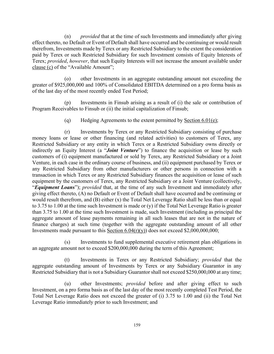 159 (n) provided that at the time of such Investments and immediately after giving effect thereto, no Default or Event of Default shall have occurred and be continuing or would result therefrom, Investments made by Terex or any Restricted Subsidiary to the extent the consideration paid by Terex or such Restricted Subsidiary for such Investment consists of Equity Interests of Terex; provided, however, that such Equity Interests will not increase the amount available under clause (c) of the “Available Amount”; (o) other Investments in an aggregate outstanding amount not exceeding the greater of $925,000,000 and 100% of Consolidated EBITDA determined on a pro forma basis as of the last day of the most recently ended Test Period; (p) Investments in Finsub arising as a result of (i) the sale or contribution of Program Receivables to Finsub or (ii) the initial capitalization of Finsub; (q) Hedging Agreements to the extent permitted by Section 6.01(e); (r) Investments by Terex or any Restricted Subsidiary consisting of purchase money loans or lease or other financing (and related activities) to customers of Terex, any Restricted Subsidiary or any entity in which Terex or a Restricted Subsidiary owns directly or indirectly an Equity Interest (a “Joint Venture”) to finance the acquisition or lease by such customers of (i) equipment manufactured or sold by Terex, any Restricted Subsidiary or a Joint Venture, in each case in the ordinary course of business, and (ii) equipment purchased by Terex or any Restricted Subsidiary from other manufacturers or other persons in connection with a transaction in which Terex or any Restricted Subsidiary finances the acquisition or lease of such equipment by the customers of Terex, any Restricted Subsidiary or a Joint Venture (collectively, “Equipment Loans”); provided that, at the time of any such Investment and immediately after giving effect thereto, (A) no Default or Event of Default shall have occurred and be continuing or would result therefrom, and (B) either (x) the Total Net Leverage Ratio shall be less than or equal to 3.75 to 1.00 at the time such Investment is made or (y) if the Total Net Leverage Ratio is greater than 3.75 to 1.00 at the time such Investment is made, such Investment (including as principal the aggregate amount of lease payments remaining in all such leases that are not in the nature of finance charges) at such time (together with the aggregate outstanding amount of all other Investments made pursuant to this Section 6.04(r)(y)) does not exceed $2,000,000,000; (s) Investments to fund supplemental executive retirement plan obligations in an aggregate amount not to exceed $200,000,000 during the term of this Agreement; (t) Investments in Terex or any Restricted Subsidiary; provided that the aggregate outstanding amount of Investments by Terex or any Subsidiary Guarantor in any Restricted Subsidiary that is not a Subsidiary Guarantor shall not exceed $250,000,000 at any time; (u) other Investments; provided before and after giving effect to such Investment, on a pro forma basis as of the last day of the most recently completed Test Period, the Total Net Leverage Ratio does not exceed the greater of (i) 3.75 to 1.00 and (ii) the Total Net Leverage Ratio immediately prior to such Investment; and