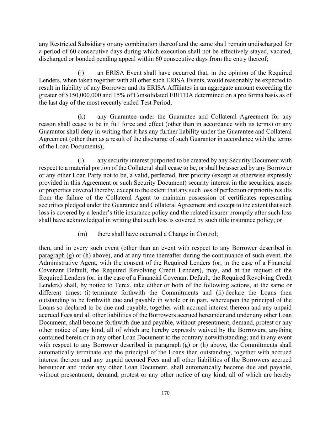 170 any Restricted Subsidiary or any combination thereof and the same shall remain undischarged for a period of 60 consecutive days during which execution shall not be effectively stayed, vacated, discharged or bonded pending appeal within 60 consecutive days from the entry thereof; (j) an ERISA Event shall have occurred that, in the opinion of the Required Lenders, when taken together with all other such ERISA Events, would reasonably be expected to result in liability of any Borrower and its ERISA Affiliates in an aggregate amount exceeding the greater of $150,000,000 and 15% of Consolidated EBITDA determined on a pro forma basis as of the last day of the most recently ended Test Period; (k) any Guarantee under the Guarantee and Collateral Agreement for any reason shall cease to be in full force and effect (other than in accordance with its terms) or any Guarantor shall deny in writing that it has any further liability under the Guarantee and Collateral Agreement (other than as a result of the discharge of such Guarantor in accordance with the terms of the Loan Documents); (l) any security interest purported to be created by any Security Document with respect to a material portion of the Collateral shall cease to be, or shall be asserted by any Borrower or any other Loan Party not to be, a valid, perfected, first priority (except as otherwise expressly provided in this Agreement or such Security Document) security interest in the securities, assets or properties covered thereby, except to the extent that any such loss of perfection or priority results from the failure of the Collateral Agent to maintain possession of certificates representing securities pledged under the Guarantee and Collateral Agreement and except to the extent that such loss is covered by a lender’s title insurance policy and the related insurer promptly after such loss shall have acknowledged in writing that such loss is covered by such title insurance policy; or (m) there shall have occurred a Change in Control; then, and in every such event (other than an event with respect to any Borrower described in paragraph (g) or (h) above), and at any time thereafter during the continuance of such event, the Administrative Agent, with the consent of the Required Lenders (or, in the case of a Financial Covenant Default, the Required Revolving Credit Lenders), may, and at the request of the Required Lenders (or, in the case of a Financial Covenant Default, the Required Revolving Credit Lenders) shall, by notice to Terex, take either or both of the following actions, at the same or different times: (i) terminate forthwith the Commitments and (ii) declare the Loans then outstanding to be forthwith due and payable in whole or in part, whereupon the principal of the Loans so declared to be due and payable, together with accrued interest thereon and any unpaid accrued Fees and all other liabilities of the Borrowers accrued hereunder and under any other Loan Document, shall become forthwith due and payable, without presentment, demand, protest or any other notice of any kind, all of which are hereby expressly waived by the Borrowers, anything contained herein or in any other Loan Document to the contrary notwithstanding; and in any event with respect to any Borrower described in paragraph (g) or (h) above, the Commitments shall automatically terminate and the principal of the Loans then outstanding, together with accrued interest thereon and any unpaid accrued Fees and all other liabilities of the Borrowers accrued hereunder and under any other Loan Document, shall automatically become due and payable, without presentment, demand, protest or any other notice of any kind, all of which are hereby