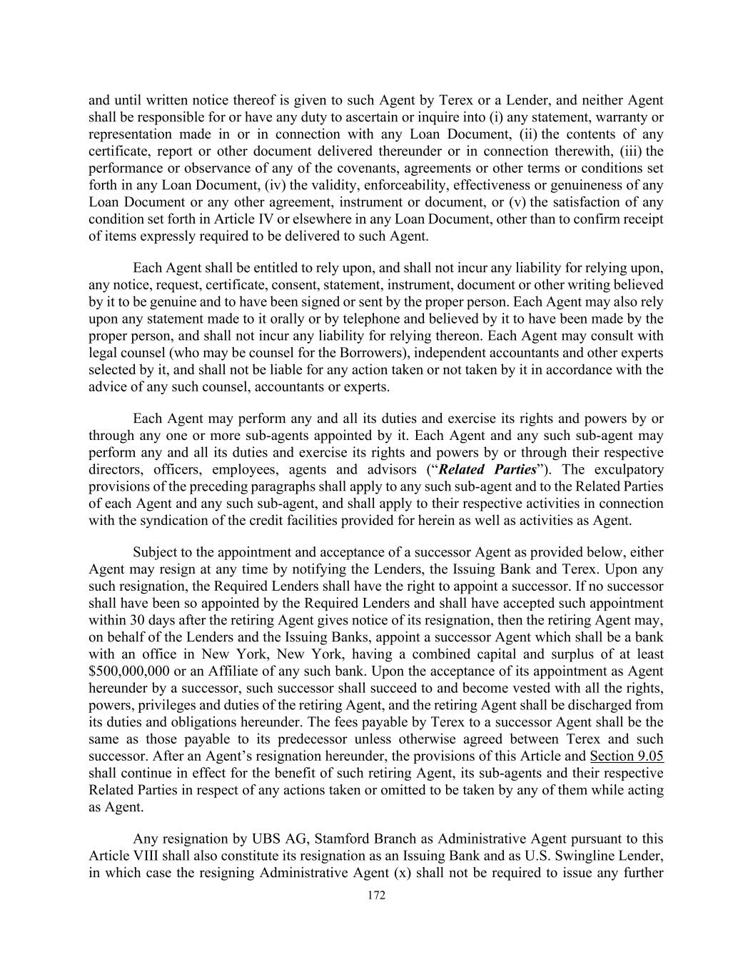 172 and until written notice thereof is given to such Agent by Terex or a Lender, and neither Agent shall be responsible for or have any duty to ascertain or inquire into (i) any statement, warranty or representation made in or in connection with any Loan Document, (ii) the contents of any certificate, report or other document delivered thereunder or in connection therewith, (iii) the performance or observance of any of the covenants, agreements or other terms or conditions set forth in any Loan Document, (iv) the validity, enforceability, effectiveness or genuineness of any Loan Document or any other agreement, instrument or document, or (v) the satisfaction of any condition set forth in Article IV or elsewhere in any Loan Document, other than to confirm receipt of items expressly required to be delivered to such Agent. Each Agent shall be entitled to rely upon, and shall not incur any liability for relying upon, any notice, request, certificate, consent, statement, instrument, document or other writing believed by it to be genuine and to have been signed or sent by the proper person. Each Agent may also rely upon any statement made to it orally or by telephone and believed by it to have been made by the proper person, and shall not incur any liability for relying thereon. Each Agent may consult with legal counsel (who may be counsel for the Borrowers), independent accountants and other experts selected by it, and shall not be liable for any action taken or not taken by it in accordance with the advice of any such counsel, accountants or experts. Each Agent may perform any and all its duties and exercise its rights and powers by or through any one or more sub-agents appointed by it. Each Agent and any such sub-agent may perform any and all its duties and exercise its rights and powers by or through their respective directors, officers, employees, agents and advisors (“Related Parties”). The exculpatory provisions of the preceding paragraphs shall apply to any such sub-agent and to the Related Parties of each Agent and any such sub-agent, and shall apply to their respective activities in connection with the syndication of the credit facilities provided for herein as well as activities as Agent. Subject to the appointment and acceptance of a successor Agent as provided below, either Agent may resign at any time by notifying the Lenders, the Issuing Bank and Terex. Upon any such resignation, the Required Lenders shall have the right to appoint a successor. If no successor shall have been so appointed by the Required Lenders and shall have accepted such appointment within 30 days after the retiring Agent gives notice of its resignation, then the retiring Agent may, on behalf of the Lenders and the Issuing Banks, appoint a successor Agent which shall be a bank with an office in New York, New York, having a combined capital and surplus of at least $500,000,000 or an Affiliate of any such bank. Upon the acceptance of its appointment as Agent hereunder by a successor, such successor shall succeed to and become vested with all the rights, powers, privileges and duties of the retiring Agent, and the retiring Agent shall be discharged from its duties and obligations hereunder. The fees payable by Terex to a successor Agent shall be the same as those payable to its predecessor unless otherwise agreed between Terex and such successor. After an Agent’s resignation hereunder, the provisions of this Article and Section 9.05 shall continue in effect for the benefit of such retiring Agent, its sub-agents and their respective Related Parties in respect of any actions taken or omitted to be taken by any of them while acting as Agent. Any resignation by UBS AG, Stamford Branch as Administrative Agent pursuant to this Article VIII shall also constitute its resignation as an Issuing Bank and as U.S. Swingline Lender, in which case the resigning Administrative Agent (x) shall not be required to issue any further