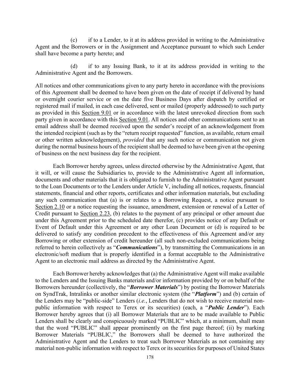 178 (c) if to a Lender, to it at its address provided in writing to the Administrative Agent and the Borrowers or in the Assignment and Acceptance pursuant to which such Lender shall have become a party hereto; and (d) if to any Issuing Bank, to it at its address provided in writing to the Administrative Agent and the Borrowers. All notices and other communications given to any party hereto in accordance with the provisions of this Agreement shall be deemed to have been given on the date of receipt if delivered by hand or overnight courier service or on the date five Business Days after dispatch by certified or registered mail if mailed, in each case delivered, sent or mailed (properly addressed) to such party as provided in this Section 9.01 or in accordance with the latest unrevoked direction from such party given in accordance with this Section 9.01. All notices and other communications sent to an email address shall be deemed received upon the sender’s receipt of an acknowledgement from the intended recipient (such as by the “return receipt requested” function, as available, return email or other written acknowledgement), provided that any such notice or communication not given during the normal business hours of the recipient shall be deemed to have been given at the opening of business on the next business day for the recipient. Each Borrower hereby agrees, unless directed otherwise by the Administrative Agent, that it will, or will cause the Subsidiaries to, provide to the Administrative Agent all information, documents and other materials that it is obligated to furnish to the Administrative Agent pursuant to the Loan Documents or to the Lenders under Article V, including all notices, requests, financial statements, financial and other reports, certificates and other information materials, but excluding any such communication that (a) is or relates to a Borrowing Request, a notice pursuant to Section 2.10 or a notice requesting the issuance, amendment, extension or renewal of a Letter of Credit pursuant to Section 2.23, (b) relates to the payment of any principal or other amount due under this Agreement prior to the scheduled date therefor, (c) provides notice of any Default or Event of Default under this Agreement or any other Loan Document or (d) is required to be delivered to satisfy any condition precedent to the effectiveness of this Agreement and/or any Borrowing or other extension of credit hereunder (all such non-excluded communications being referred to herein collectively as “Communications”), by transmitting the Communications in an electronic/soft medium that is properly identified in a format acceptable to the Administrative Agent to an electronic mail address as directed by the Administrative Agent. Each Borrower hereby acknowledges that (a) the Administrative Agent will make available to the Lenders and the Issuing Banks materials and/or information provided by or on behalf of the Borrowers hereunder (collectively, the “Borrower Materials”) by posting the Borrower Materials on SyndTrak, Intralinks or another similar electronic system (the “Platform”) and (b) certain of the Lenders may be “public-side” Lenders (i.e., Lenders that do not wish to receive material non- public information with respect to Terex or its securities) (each, a “Public Lender”). Each Borrower hereby agrees that (i) all Borrower Materials that are to be made available to Public Lenders shall be clearly and conspicuously marked “PUBLIC” which, at a minimum, shall mean that the word “PUBLIC” shall appear prominently on the first page thereof; (ii) by marking Borrower Materials “PUBLIC,” the Borrowers shall be deemed to have authorized the Administrative Agent and the Lenders to treat such Borrower Materials as not containing any material non-public information with respect to Terex or its securities for purposes of United States