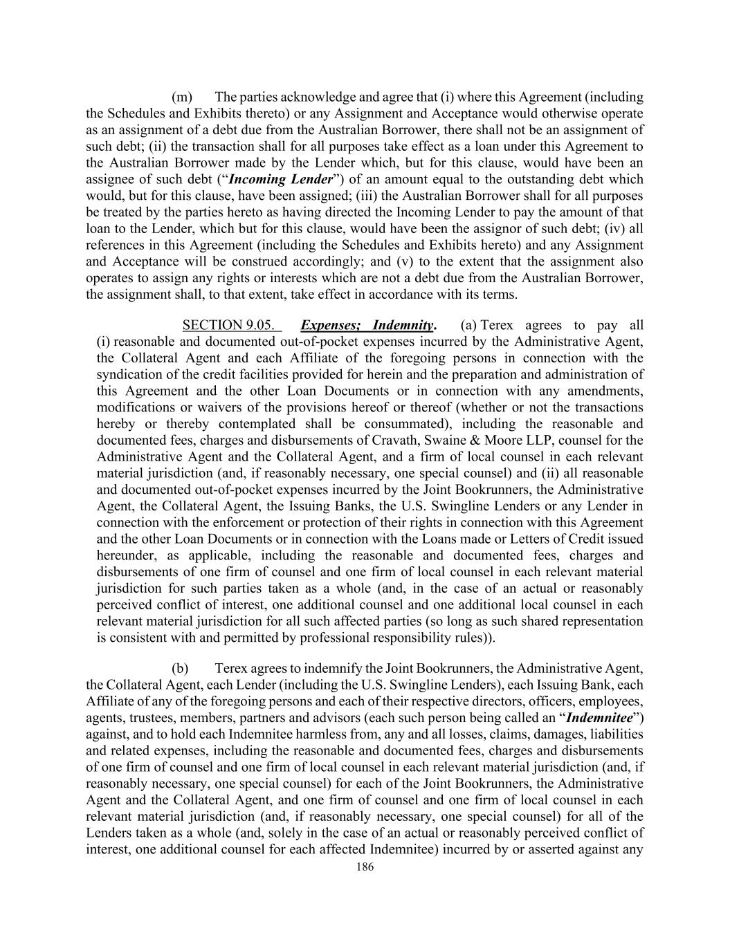 186 (m) The parties acknowledge and agree that (i) where this Agreement (including the Schedules and Exhibits thereto) or any Assignment and Acceptance would otherwise operate as an assignment of a debt due from the Australian Borrower, there shall not be an assignment of such debt; (ii) the transaction shall for all purposes take effect as a loan under this Agreement to the Australian Borrower made by the Lender which, but for this clause, would have been an assignee of such debt (“Incoming Lender”) of an amount equal to the outstanding debt which would, but for this clause, have been assigned; (iii) the Australian Borrower shall for all purposes be treated by the parties hereto as having directed the Incoming Lender to pay the amount of that loan to the Lender, which but for this clause, would have been the assignor of such debt; (iv) all references in this Agreement (including the Schedules and Exhibits hereto) and any Assignment and Acceptance will be construed accordingly; and (v) to the extent that the assignment also operates to assign any rights or interests which are not a debt due from the Australian Borrower, the assignment shall, to that extent, take effect in accordance with its terms. SECTION 9.05. Expenses; Indemnity. (a) Terex agrees to pay all (i) reasonable and documented out-of-pocket expenses incurred by the Administrative Agent, the Collateral Agent and each Affiliate of the foregoing persons in connection with the syndication of the credit facilities provided for herein and the preparation and administration of this Agreement and the other Loan Documents or in connection with any amendments, modifications or waivers of the provisions hereof or thereof (whether or not the transactions hereby or thereby contemplated shall be consummated), including the reasonable and documented fees, charges and disbursements of Cravath, Swaine & Moore LLP, counsel for the Administrative Agent and the Collateral Agent, and a firm of local counsel in each relevant material jurisdiction (and, if reasonably necessary, one special counsel) and (ii) all reasonable and documented out-of-pocket expenses incurred by the Joint Bookrunners, the Administrative Agent, the Collateral Agent, the Issuing Banks, the U.S. Swingline Lenders or any Lender in connection with the enforcement or protection of their rights in connection with this Agreement and the other Loan Documents or in connection with the Loans made or Letters of Credit issued hereunder, as applicable, including the reasonable and documented fees, charges and disbursements of one firm of counsel and one firm of local counsel in each relevant material jurisdiction for such parties taken as a whole (and, in the case of an actual or reasonably perceived conflict of interest, one additional counsel and one additional local counsel in each relevant material jurisdiction for all such affected parties (so long as such shared representation is consistent with and permitted by professional responsibility rules)). (b) Terex agrees to indemnify the Joint Bookrunners, the Administrative Agent, the Collateral Agent, each Lender (including the U.S. Swingline Lenders), each Issuing Bank, each Affiliate of any of the foregoing persons and each of their respective directors, officers, employees, agents, trustees, members, partners and advisors (each such person being called an “Indemnitee”) against, and to hold each Indemnitee harmless from, any and all losses, claims, damages, liabilities and related expenses, including the reasonable and documented fees, charges and disbursements of one firm of counsel and one firm of local counsel in each relevant material jurisdiction (and, if reasonably necessary, one special counsel) for each of the Joint Bookrunners, the Administrative Agent and the Collateral Agent, and one firm of counsel and one firm of local counsel in each relevant material jurisdiction (and, if reasonably necessary, one special counsel) for all of the Lenders taken as a whole (and, solely in the case of an actual or reasonably perceived conflict of interest, one additional counsel for each affected Indemnitee) incurred by or asserted against any