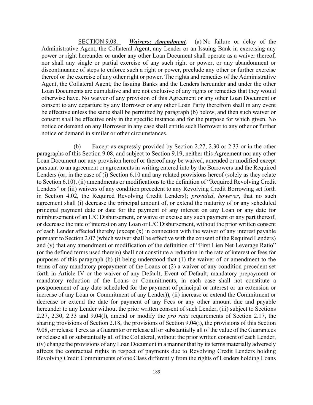 189 SECTION 9.08. Waivers; Amendment. (a) No failure or delay of the Administrative Agent, the Collateral Agent, any Lender or an Issuing Bank in exercising any power or right hereunder or under any other Loan Document shall operate as a waiver thereof, nor shall any single or partial exercise of any such right or power, or any abandonment or discontinuance of steps to enforce such a right or power, preclude any other or further exercise thereof or the exercise of any other right or power. The rights and remedies of the Administrative Agent, the Collateral Agent, the Issuing Banks and the Lenders hereunder and under the other Loan Documents are cumulative and are not exclusive of any rights or remedies that they would otherwise have. No waiver of any provision of this Agreement or any other Loan Document or consent to any departure by any Borrower or any other Loan Party therefrom shall in any event be effective unless the same shall be permitted by paragraph (b) below, and then such waiver or consent shall be effective only in the specific instance and for the purpose for which given. No notice or demand on any Borrower in any case shall entitle such Borrower to any other or further notice or demand in similar or other circumstances. (b) Except as expressly provided by Section 2.27, 2.30 or 2.33 or in the other paragraphs of this Section 9.08, and subject to Section 9.19, neither this Agreement nor any other Loan Document nor any provision hereof or thereof may be waived, amended or modified except pursuant to an agreement or agreements in writing entered into by the Borrowers and the Required Lenders (or, in the case of (i) Section 6.10 and any related provisions hereof (solely as they relate to Section 6.10), (ii) amendments or modifications to the definition of “Required Revolving Credit Lenders” or (iii) waivers of any condition precedent to any Revolving Credit Borrowing set forth in Section 4.02, the Required Revolving Credit Lenders); provided, however, that no such agreement shall (i) decrease the principal amount of, or extend the maturity of or any scheduled principal payment date or date for the payment of any interest on any Loan or any date for reimbursement of an L/C Disbursement, or waive or excuse any such payment or any part thereof, or decrease the rate of interest on any Loan or L/C Disbursement, without the prior written consent of each Lender affected thereby (except (x) in connection with the waiver of any interest payable pursuant to Section 2.07 (which waiver shall be effective with the consent of the Required Lenders) and (y) that any amendment or modification of the definition of “First Lien Net Leverage Ratio” (or the defined terms used therein) shall not constitute a reduction in the rate of interest or fees for purposes of this paragraph (b) (it being understood that (1) the waiver of or amendment to the terms of any mandatory prepayment of the Loans or (2) a waiver of any condition precedent set forth in Article IV or the waiver of any Default, Event of Default, mandatory prepayment or mandatory reduction of the Loans or Commitments, in each case shall not constitute a postponement of any date scheduled for the payment of principal or interest or an extension or increase of any Loan or Commitment of any Lender)), (ii) increase or extend the Commitment or decrease or extend the date for payment of any Fees or any other amount due and payable hereunder to any Lender without the prior written consent of such Lender, (iii) subject to Sections 2.27, 2.30, 2.33 and 9.04(l), amend or modify the pro rata requirements of Section 2.17, the sharing provisions of Section 2.18, the provisions of Section 9.04(i), the provisions of this Section 9.08, or release Terex as a Guarantor or release all or substantially all of the value of the Guarantees or release all or substantially all of the Collateral, without the prior written consent of each Lender, (iv) change the provisions of any Loan Document in a manner that by its terms materially adversely affects the contractual rights in respect of payments due to Revolving Credit Lenders holding Revolving Credit Commitments of one Class differently from the rights of Lenders holding Loans