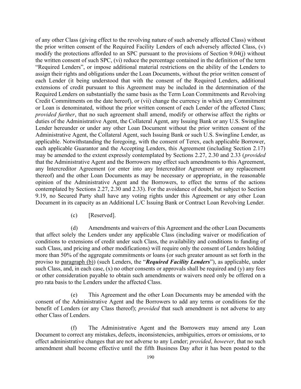 190 of any other Class (giving effect to the revolving nature of such adversely affected Class) without the prior written consent of the Required Facility Lenders of each adversely affected Class, (v) modify the protections afforded to an SPC pursuant to the provisions of Section 9.04(j) without the written consent of such SPC, (vi) reduce the percentage contained in the definition of the term “Required Lenders”, or impose additional material restrictions on the ability of the Lenders to assign their rights and obligations under the Loan Documents, without the prior written consent of each Lender (it being understood that with the consent of the Required Lenders, additional extensions of credit pursuant to this Agreement may be included in the determination of the Required Lenders on substantially the same basis as the Term Loan Commitments and Revolving Credit Commitments on the date hereof), or (vii) change the currency in which any Commitment or Loan is denominated, without the prior written consent of each Lender of the affected Class; provided further, that no such agreement shall amend, modify or otherwise affect the rights or duties of the Administrative Agent, the Collateral Agent, any Issuing Bank or any U.S. Swingline Lender hereunder or under any other Loan Document without the prior written consent of the Administrative Agent, the Collateral Agent, such Issuing Bank or such U.S. Swingline Lender, as applicable. Notwithstanding the foregoing, with the consent of Terex, each applicable Borrower, each applicable Guarantor and the Accepting Lenders, this Agreement (including Section 2.17) may be amended to the extent expressly contemplated by Sections 2.27, 2.30 and 2.33 (provided that the Administrative Agent and the Borrowers may effect such amendments to this Agreement, any Intercreditor Agreement (or enter into any Intercreditor Agreement or any replacement thereof) and the other Loan Documents as may be necessary or appropriate, in the reasonable opinion of the Administrative Agent and the Borrowers, to effect the terms of the actions contemplated by Sections 2.27, 2.30 and 2.33). For the avoidance of doubt, but subject to Section 9.19, no Secured Party shall have any voting rights under this Agreement or any other Loan Document in its capacity as an Additional L/C Issuing Bank or Contract Loan Revolving Lender. (c) [Reserved]. (d) Amendments and waivers of this Agreement and the other Loan Documents that affect solely the Lenders under any applicable Class (including waiver or modification of conditions to extensions of credit under such Class, the availability and conditions to funding of such Class, and pricing and other modifications) will require only the consent of Lenders holding more than 50% of the aggregate commitments or loans (or such greater amount as set forth in the proviso to paragraph (b)) (such Lenders, the “Required Facility Lenders”), as applicable, under such Class, and, in each case, (x) no other consents or approvals shall be required and (y) any fees or other consideration payable to obtain such amendments or waivers need only be offered on a pro rata basis to the Lenders under the affected Class. (e) This Agreement and the other Loan Documents may be amended with the consent of the Administrative Agent and the Borrowers to add any terms or conditions for the benefit of Lenders (or any Class thereof); provided that such amendment is not adverse to any other Class of Lenders. (f) The Administrative Agent and the Borrowers may amend any Loan Document to correct any mistakes, defects, inconsistencies, ambiguities, errors or omissions, or to effect administrative changes that are not adverse to any Lender; provided, however, that no such amendment shall become effective until the fifth Business Day after it has been posted to the