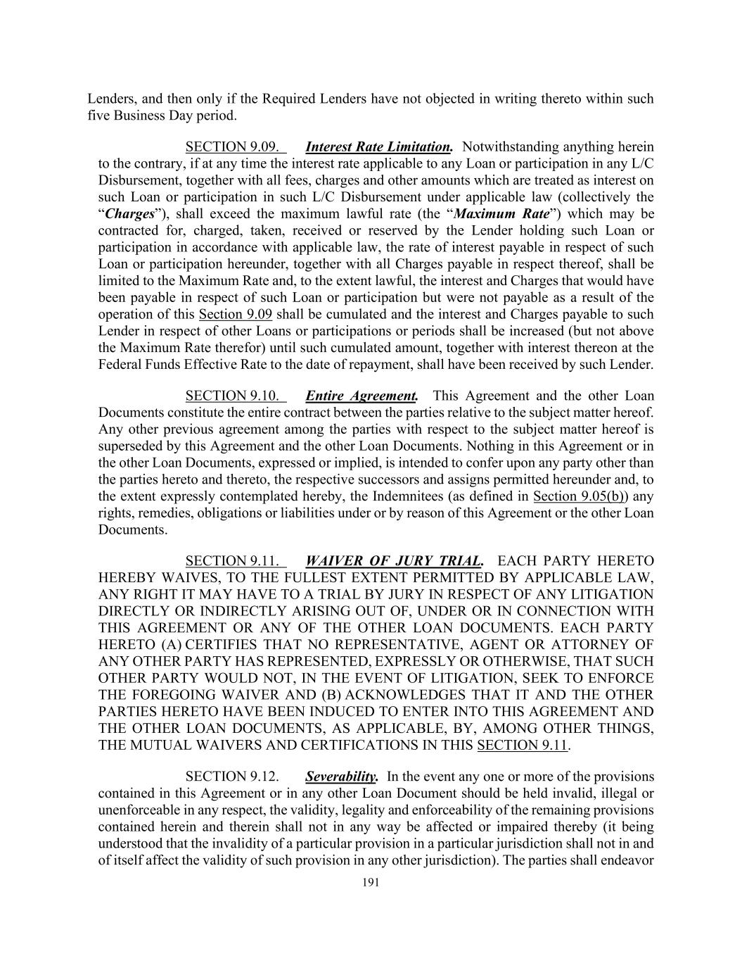 191 Lenders, and then only if the Required Lenders have not objected in writing thereto within such five Business Day period. SECTION 9.09. Interest Rate Limitation. Notwithstanding anything herein to the contrary, if at any time the interest rate applicable to any Loan or participation in any L/C Disbursement, together with all fees, charges and other amounts which are treated as interest on such Loan or participation in such L/C Disbursement under applicable law (collectively the “Charges”), shall exceed the maximum lawful rate (the “Maximum Rate”) which may be contracted for, charged, taken, received or reserved by the Lender holding such Loan or participation in accordance with applicable law, the rate of interest payable in respect of such Loan or participation hereunder, together with all Charges payable in respect thereof, shall be limited to the Maximum Rate and, to the extent lawful, the interest and Charges that would have been payable in respect of such Loan or participation but were not payable as a result of the operation of this Section 9.09 shall be cumulated and the interest and Charges payable to such Lender in respect of other Loans or participations or periods shall be increased (but not above the Maximum Rate therefor) until such cumulated amount, together with interest thereon at the Federal Funds Effective Rate to the date of repayment, shall have been received by such Lender. SECTION 9.10. Entire Agreement. This Agreement and the other Loan Documents constitute the entire contract between the parties relative to the subject matter hereof. Any other previous agreement among the parties with respect to the subject matter hereof is superseded by this Agreement and the other Loan Documents. Nothing in this Agreement or in the other Loan Documents, expressed or implied, is intended to confer upon any party other than the parties hereto and thereto, the respective successors and assigns permitted hereunder and, to the extent expressly contemplated hereby, the Indemnitees (as defined in Section 9.05(b)) any rights, remedies, obligations or liabilities under or by reason of this Agreement or the other Loan Documents. SECTION 9.11. WAIVER OF JURY TRIAL. EACH PARTY HERETO HEREBY WAIVES, TO THE FULLEST EXTENT PERMITTED BY APPLICABLE LAW, ANY RIGHT IT MAY HAVE TO A TRIAL BY JURY IN RESPECT OF ANY LITIGATION DIRECTLY OR INDIRECTLY ARISING OUT OF, UNDER OR IN CONNECTION WITH THIS AGREEMENT OR ANY OF THE OTHER LOAN DOCUMENTS. EACH PARTY HERETO (A) CERTIFIES THAT NO REPRESENTATIVE, AGENT OR ATTORNEY OF ANY OTHER PARTY HAS REPRESENTED, EXPRESSLY OR OTHERWISE, THAT SUCH OTHER PARTY WOULD NOT, IN THE EVENT OF LITIGATION, SEEK TO ENFORCE THE FOREGOING WAIVER AND (B) ACKNOWLEDGES THAT IT AND THE OTHER PARTIES HERETO HAVE BEEN INDUCED TO ENTER INTO THIS AGREEMENT AND THE OTHER LOAN DOCUMENTS, AS APPLICABLE, BY, AMONG OTHER THINGS, THE MUTUAL WAIVERS AND CERTIFICATIONS IN THIS SECTION 9.11. SECTION 9.12. Severability. In the event any one or more of the provisions contained in this Agreement or in any other Loan Document should be held invalid, illegal or unenforceable in any respect, the validity, legality and enforceability of the remaining provisions contained herein and therein shall not in any way be affected or impaired thereby (it being understood that the invalidity of a particular provision in a particular jurisdiction shall not in and of itself affect the validity of such provision in any other jurisdiction). The parties shall endeavor