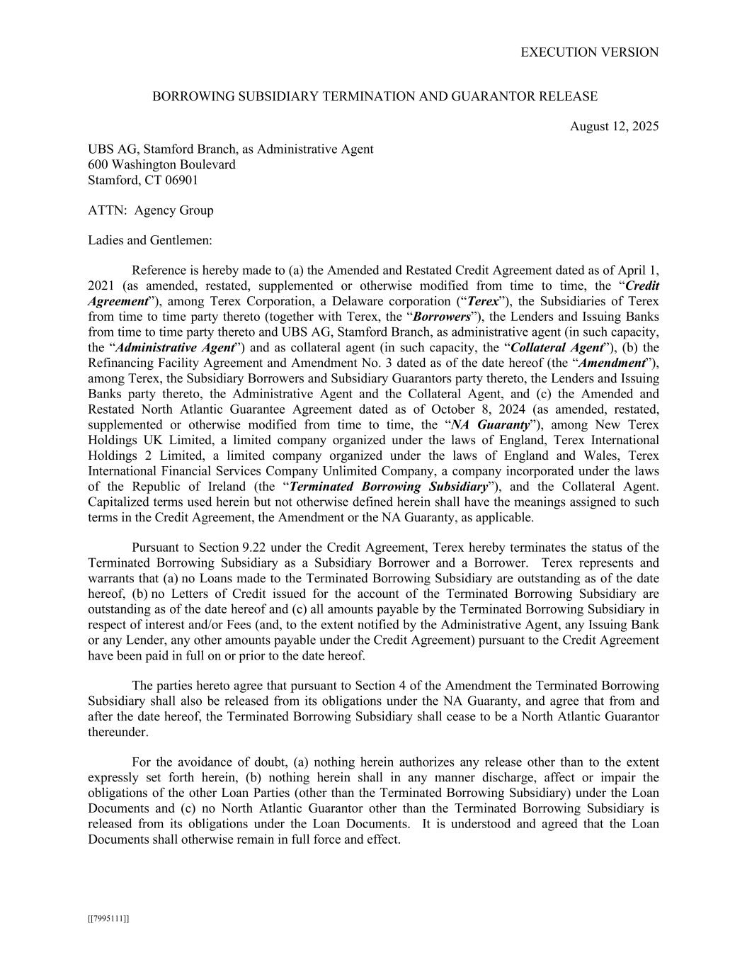 EXECUTION VERSION [[7995111]] BORROWING SUBSIDIARY TERMINATION AND GUARANTOR RELEASE August 12, 2025 UBS AG, Stamford Branch, as Administrative Agent 600 Washington Boulevard Stamford, CT 06901 ATTN: Agency Group Ladies and Gentlemen: Reference is hereby made to (a) the Amended and Restated Credit Agreement dated as of April 1, 2021 (as amended, restated, supplemented or otherwise modified from time to time, the “Credit Agreement”), among Terex Corporation, a Delaware corporation (“Terex”), the Subsidiaries of Terex from time to time party thereto (together with Terex, the “Borrowers”), the Lenders and Issuing Banks from time to time party thereto and UBS AG, Stamford Branch, as administrative agent (in such capacity, the “Administrative Agent”) and as collateral agent (in such capacity, the “Collateral Agent”), (b) the Refinancing Facility Agreement and Amendment No. 3 dated as of the date hereof (the “Amendment”), among Terex, the Subsidiary Borrowers and Subsidiary Guarantors party thereto, the Lenders and Issuing Banks party thereto, the Administrative Agent and the Collateral Agent, and (c) the Amended and Restated North Atlantic Guarantee Agreement dated as of October 8, 2024 (as amended, restated, supplemented or otherwise modified from time to time, the “NA Guaranty”), among New Terex Holdings UK Limited, a limited company organized under the laws of England, Terex International Holdings 2 Limited, a limited company organized under the laws of England and Wales, Terex International Financial Services Company Unlimited Company, a company incorporated under the laws of the Republic of Ireland (the “Terminated Borrowing Subsidiary”), and the Collateral Agent. Capitalized terms used herein but not otherwise defined herein shall have the meanings assigned to such terms in the Credit Agreement, the Amendment or the NA Guaranty, as applicable. Pursuant to Section 9.22 under the Credit Agreement, Terex hereby terminates the status of the Terminated Borrowing Subsidiary as a Subsidiary Borrower and a Borrower. Terex represents and warrants that (a) no Loans made to the Terminated Borrowing Subsidiary are outstanding as of the date hereof, (b) no Letters of Credit issued for the account of the Terminated Borrowing Subsidiary are outstanding as of the date hereof and (c) all amounts payable by the Terminated Borrowing Subsidiary in respect of interest and/or Fees (and, to the extent notified by the Administrative Agent, any Issuing Bank or any Lender, any other amounts payable under the Credit Agreement) pursuant to the Credit Agreement have been paid in full on or prior to the date hereof. The parties hereto agree that pursuant to Section 4 of the Amendment the Terminated Borrowing Subsidiary shall also be released from its obligations under the NA Guaranty, and agree that from and after the date hereof, the Terminated Borrowing Subsidiary shall cease to be a North Atlantic Guarantor thereunder. For the avoidance of doubt, (a) nothing herein authorizes any release other than to the extent expressly set forth herein, (b) nothing herein shall in any manner discharge, affect or impair the obligations of the other Loan Parties (other than the Terminated Borrowing Subsidiary) under the Loan Documents and (c) no North Atlantic Guarantor other than the Terminated Borrowing Subsidiary is released from its obligations under the Loan Documents. It is understood and agreed that the Loan Documents shall otherwise remain in full force and effect.