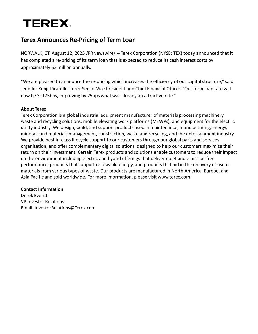Terex Announces Re-Pricing of Term Loan NORWALK, CT. August 12, 2025 /PRNewswire/ -- Terex Corporation (NYSE: TEX) today announced that it has completed a re-pricing of its term loan that is expected to reduce its cash interest costs by approximately $3 million annually. “We are pleased to announce the re-pricing which increases the efficiency of our capital structure,” said Jennifer Kong-Picarello, Terex Senior Vice President and Chief Financial Officer. “Our term loan rate will now be S+175bps, improving by 25bps what was already an attractive rate.” About Terex Terex Corporation is a global industrial equipment manufacturer of materials processing machinery, waste and recycling solutions, mobile elevating work platforms (MEWPs), and equipment for the electric utility industry. We design, build, and support products used in maintenance, manufacturing, energy, minerals and materials management, construction, waste and recycling, and the entertainment industry. We provide best-in-class lifecycle support to our customers through our global parts and services organization, and offer complementary digital solutions, designed to help our customers maximize their return on their investment. Certain Terex products and solutions enable customers to reduce their impact on the environment including electric and hybrid offerings that deliver quiet and emission-free performance, products that support renewable energy, and products that aid in the recovery of useful materials from various types of waste. Our products are manufactured in North America, Europe, and Asia Pacific and sold worldwide. For more information, please visit www.terex.com. Contact Information Derek Everitt VP Investor Relations Email: InvestorRelations@Terex.com