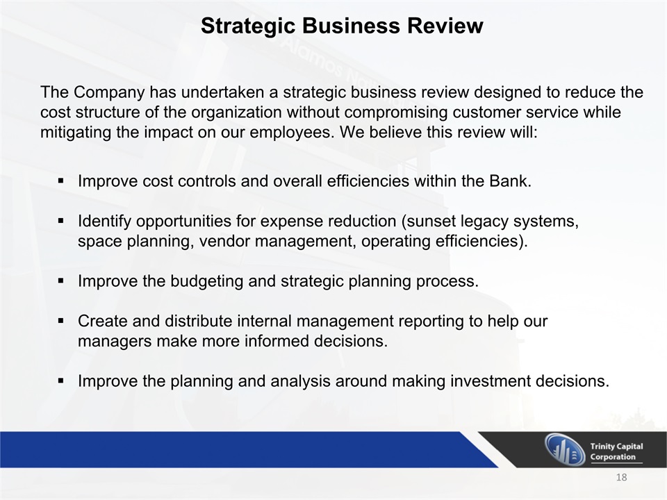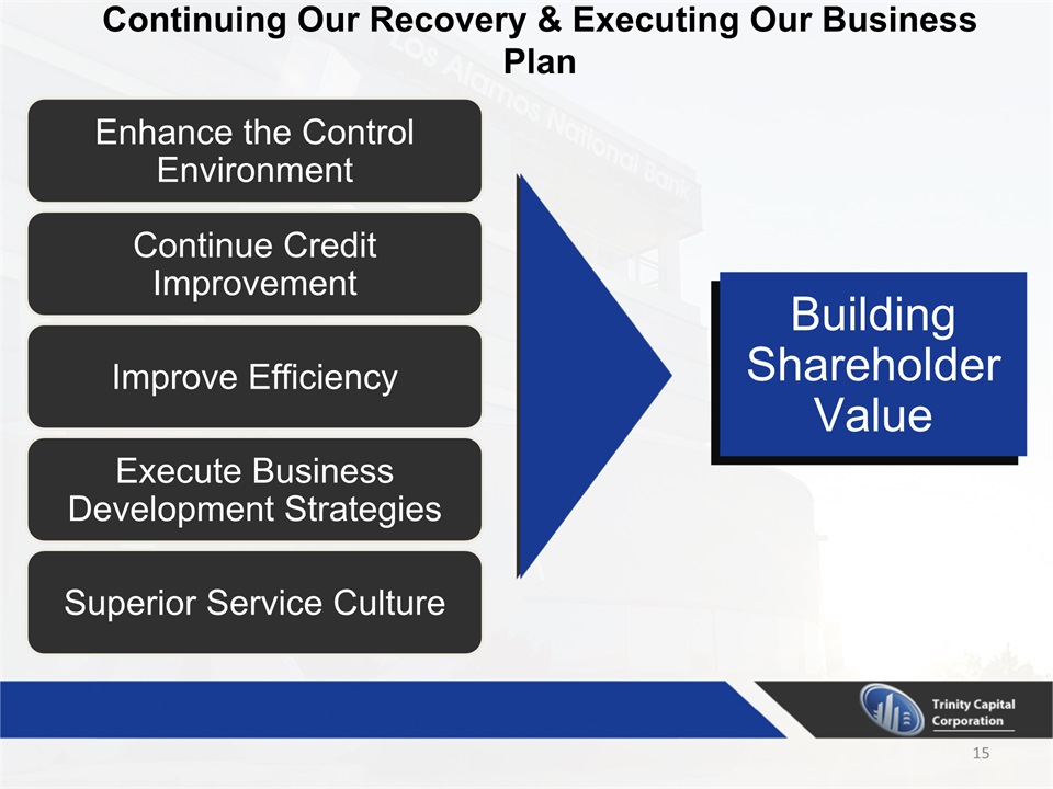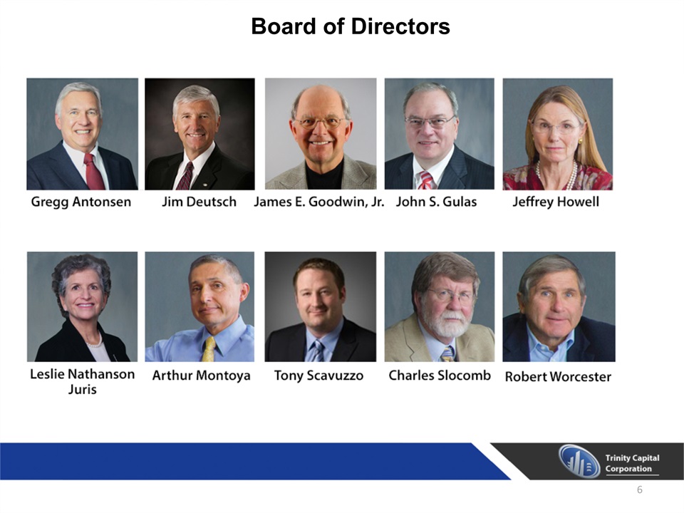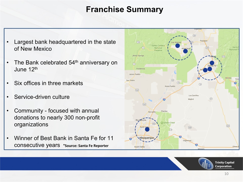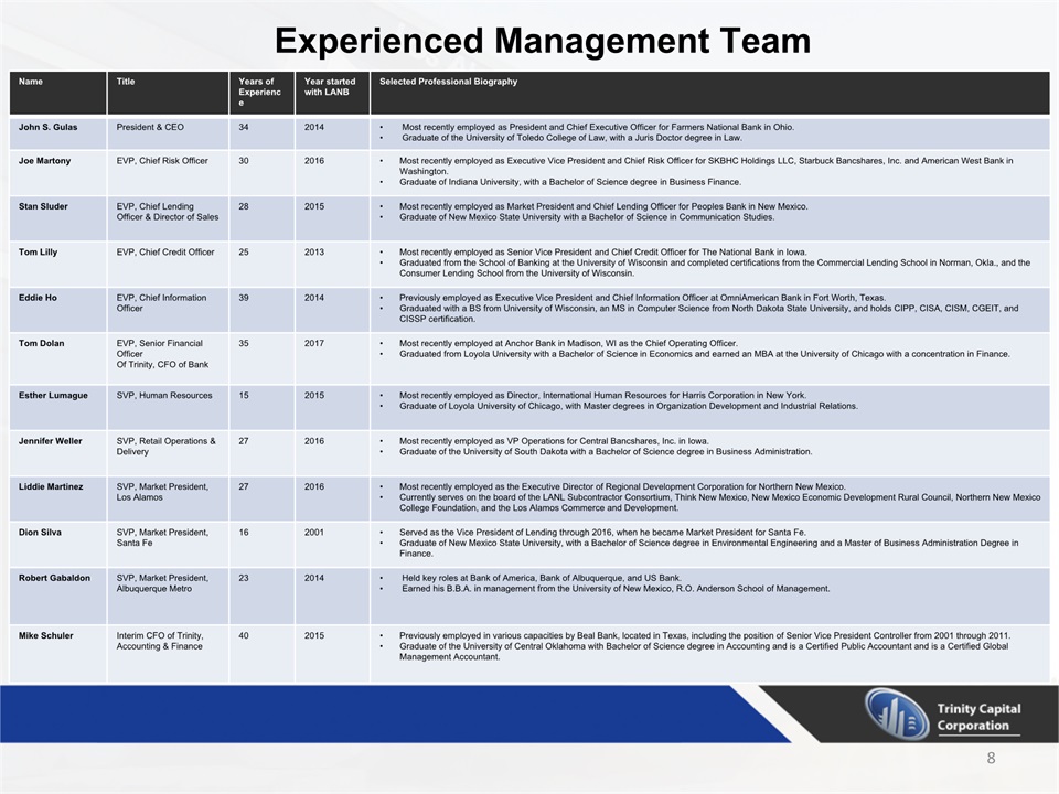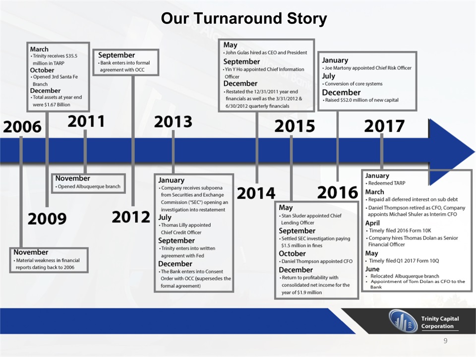 8 Experienced Management Team Name Title Years of Experience Year started with LANB Selected Professional Biography John S. Gulas President & CEO 34 2014 Most recently employed as President and Chief Executive Officer for Farmers National Bank in Ohio. Graduate of the University of Toledo College of Law, with a Juris Doctor degree in Law. Joe Martony EVP, Chief Risk Officer 30 2016 Most recently employed as Executive Vice President and Chief Risk Officer for SKBHC Holdings LLC, Starbuck Bancshares, Inc. and American West Bank in Washington. Graduate of Indiana University, with a Bachelor of Science degree in Business Finance. Stan Sluder EVP, Chief Lending Officer & Director of Sales 28 2015 Most recently employed as Market President and Chief Lending Officer for Peoples Bank in New Mexico. Graduate of New Mexico State University with a Bachelor of Science in Communication Studies. Tom Lilly EVP, Chief Credit Officer 25 2013 Most recently employed as Senior Vice President and Chief Credit Officer for The National Bank in Iowa.Graduated from the School of Banking at the University of Wisconsin and completed certifications from the Commercial Lending School in Norman, Okla., and the Consumer Lending School from the University of Wisconsin. Eddie Ho EVP, Chief Information Officer 39 2014 Previously employed as Executive Vice President and Chief Information Officer at OmniAmerican Bank in Fort Worth, Texas.Graduated with a BS from University of Wisconsin, an MS in Computer Science from North Dakota State University, and holds CIPP, CISA, CISM, CGEIT, and CISSP certification. Tom Dolan EVP, Senior Financial OfficerOf Trinity, CFO of Bank 35 2017 Most recently employed at Anchor Bank in Madison, WI as the Chief Operating Officer.Graduated from Loyola University with a Bachelor of Science in Economics and earned an MBA at the University of Chicago with a concentration in Finance. Esther Lumague SVP, Human Resources 15 2015 Most recently employed as Director, International Human Resources for Harris Corporation in New York. Graduate of Loyola University of Chicago, with Master degrees in Organization Development and Industrial Relations. Jennifer Weller SVP, Retail Operations & Delivery 27 2016 Most recently employed as VP Operations for Central Bancshares, Inc. in Iowa.Graduate of the University of South Dakota with a Bachelor of Science degree in Business Administration. Liddie Martinez SVP, Market President, Los Alamos 27 2016 Most recently employed as the Executive Director of Regional Development Corporation for Northern New Mexico. Currently serves on the board of the LANL Subcontractor Consortium, Think New Mexico, New Mexico Economic Development Rural Council, Northern New Mexico College Foundation, and the Los Alamos Commerce and Development. Dion Silva SVP, Market President, Santa Fe 16 2001 Served as the Vice President of Lending through 2016, when he became Market President for Santa Fe. Graduate of New Mexico State University, with a Bachelor of Science degree in Environmental Engineering and a Master of Business Administration Degree in Finance. Robert Gabaldon SVP, Market President, Albuquerque Metro 23 2014 Held key roles at Bank of America, Bank of Albuquerque, and US Bank. Earned his B.B.A. in management from the University of New Mexico, R.O. Anderson School of Management. Mike Schuler Interim CFO of Trinity, Accounting & Finance 40 2015 Previously employed in various capacities by Beal Bank, located in Texas, including the position of Senior Vice President Controller from 2001 through 2011. Graduate of the University of Central Oklahoma with Bachelor of Science degree in Accounting and is a Certified Public Accountant and is a Certified Global Management Accountant.