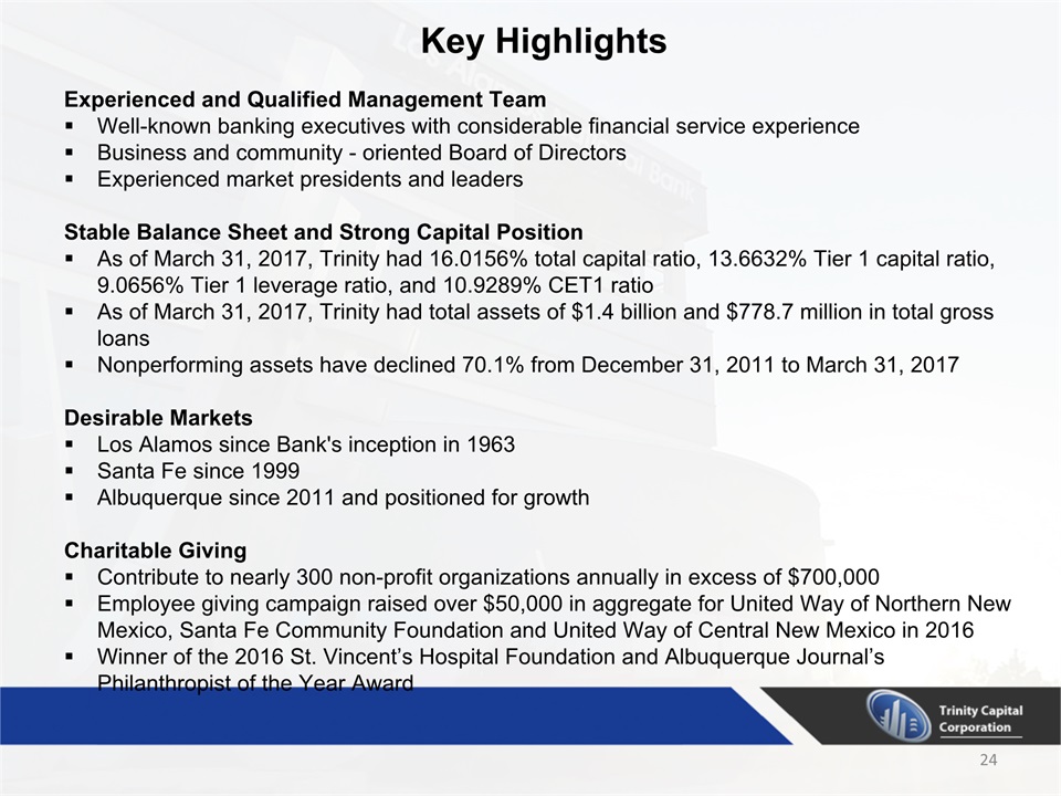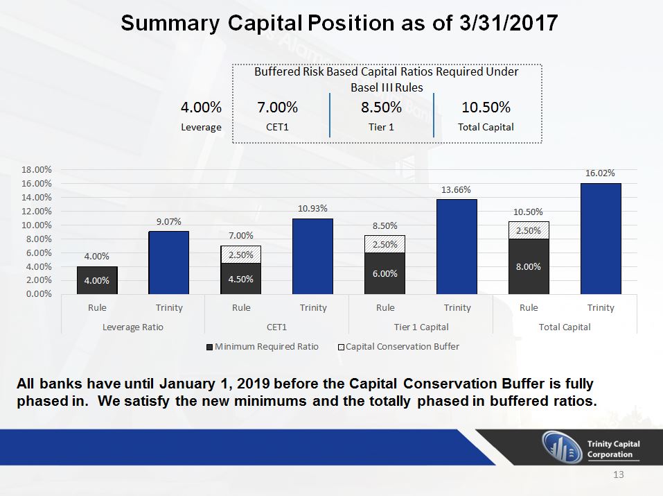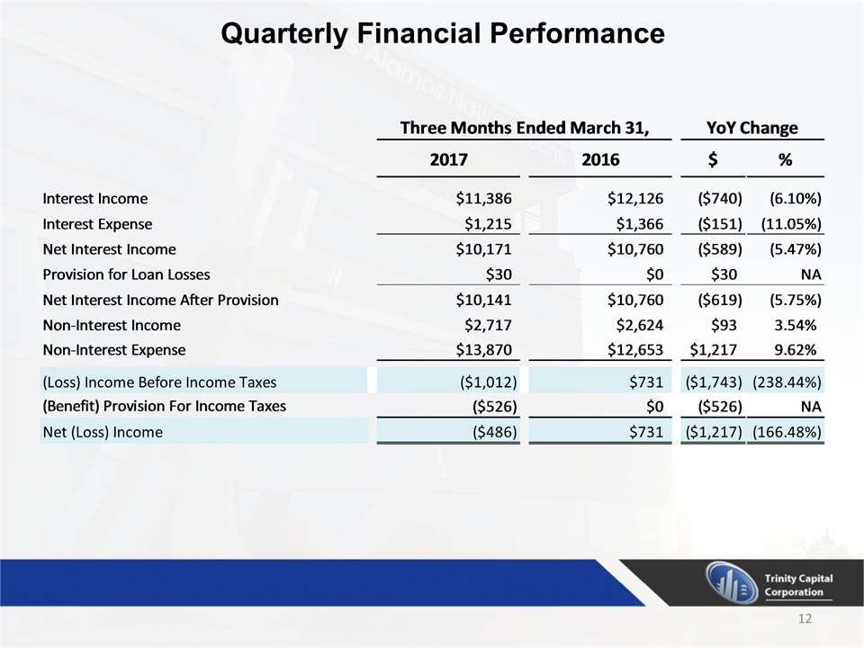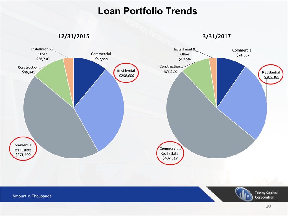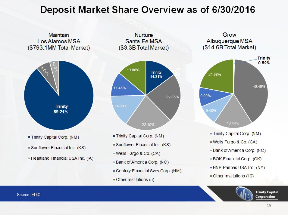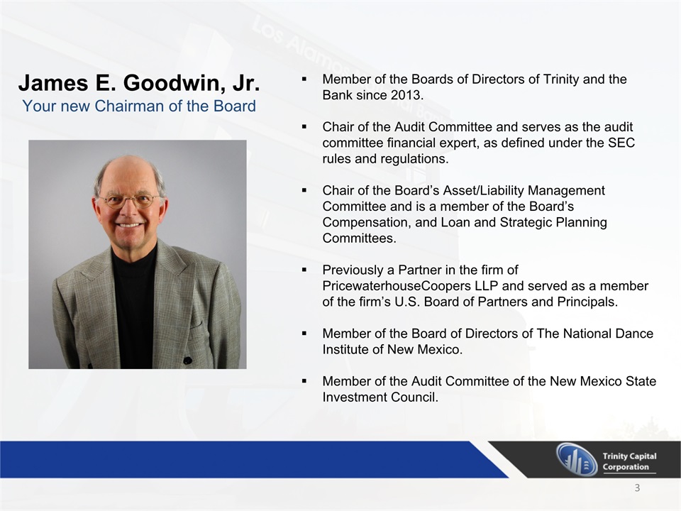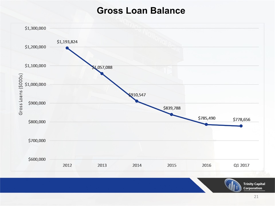 8 Experienced Management Team Name Title Years of Experience Year started with LANB Selected Professional Biography John S. Gulas President & CEO 34 2014 Most recently employed as President and Chief Executive Officer for Farmers National Bank in Ohio. Graduate of the University of Toledo College of Law, with a Juris Doctor degree in Law. Joe Martony EVP, Chief Risk Officer 30 2016 Most recently employed as Executive Vice President and Chief Risk Officer for SKBHC Holdings LLC, Starbuck Bancshares, Inc. and American West Bank in Washington. Graduate of Indiana University, with a Bachelor of Science degree in Business Finance. Stan Sluder EVP, Chief Lending Officer & Director of Sales 28 2015 Most recently employed as Market President and Chief Lending Officer for Peoples Bank in New Mexico. Graduate of New Mexico State University with a Bachelor of Science in Communication Studies. Tom Lilly EVP, Chief Credit Officer 25 2013 Most recently employed as Senior Vice President and Chief Credit Officer for The National Bank in Iowa.Graduated from the School of Banking at the University of Wisconsin and completed certifications from the Commercial Lending School in Norman, Okla., and the Consumer Lending School from the University of Wisconsin. Eddie Ho EVP, Chief Information Officer 39 2014 Previously employed as Executive Vice President and Chief Information Officer at OmniAmerican Bank in Fort Worth, Texas.Graduated with a BS from University of Wisconsin, an MS in Computer Science from North Dakota State University, and holds CIPP, CISA, CISM, CGEIT, and CISSP certification. Tom Dolan EVP, Senior Financial OfficerOf Trinity, CFO of Bank 35 2017 Most recently employed at Anchor Bank in Madison, WI as the Chief Operating Officer.Graduated from Loyola University with a Bachelor of Science in Economics and earned an MBA at the University of Chicago with a concentration in Finance. Esther Lumague SVP, Human Resources 15 2015 Most recently employed as Director, International Human Resources for Harris Corporation in New York. Graduate of Loyola University of Chicago, with Master degrees in Organization Development and Industrial Relations. Jennifer Weller SVP, Retail Operations & Delivery 27 2016 Most recently employed as VP Operations for Central Bancshares, Inc. in Iowa.Graduate of the University of South Dakota with a Bachelor of Science degree in Business Administration. Liddie Martinez SVP, Market President, Los Alamos 27 2016 Most recently employed as the Executive Director of Regional Development Corporation for Northern New Mexico. Currently serves on the board of the LANL Subcontractor Consortium, Think New Mexico, New Mexico Economic Development Rural Council, Northern New Mexico College Foundation, and the Los Alamos Commerce and Development. Dion Silva SVP, Market President, Santa Fe 16 2001 Served as the Vice President of Lending through 2016, when he became Market President for Santa Fe. Graduate of New Mexico State University, with a Bachelor of Science degree in Environmental Engineering and a Master of Business Administration Degree in Finance. Robert Gabaldon SVP, Market President, Albuquerque Metro 23 2014 Held key roles at Bank of America, Bank of Albuquerque, and US Bank. Earned his B.B.A. in management from the University of New Mexico, R.O. Anderson School of Management. Mike Schuler Interim CFO of Trinity, Accounting & Finance 40 2015 Previously employed in various capacities by Beal Bank, located in Texas, including the position of Senior Vice President Controller from 2001 through 2011. Graduate of the University of Central Oklahoma with Bachelor of Science degree in Accounting and is a Certified Public Accountant and is a Certified Global Management Accountant.