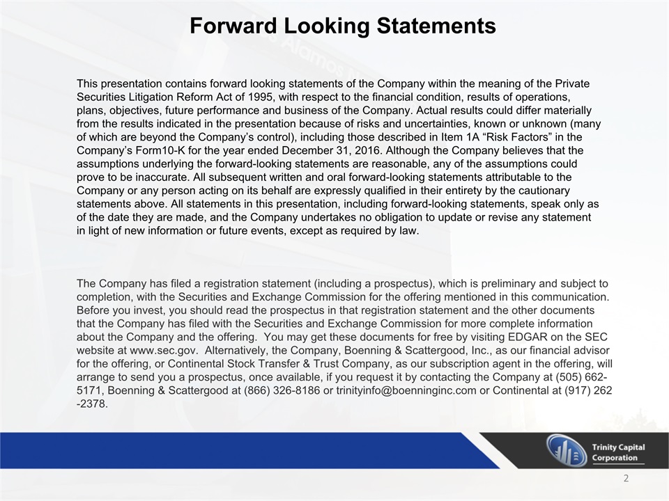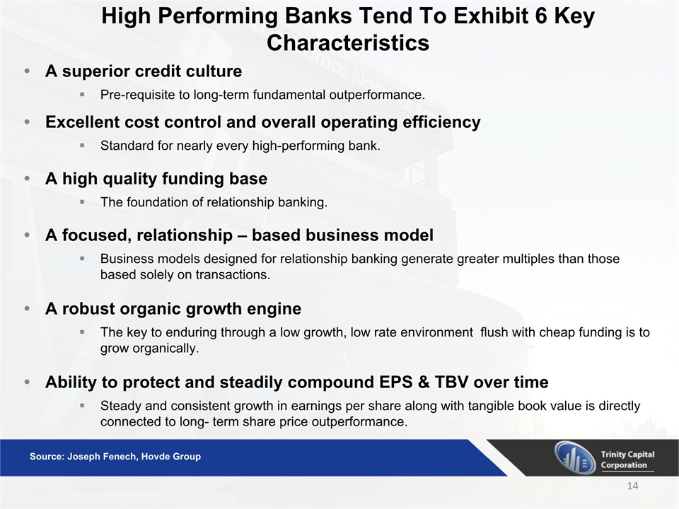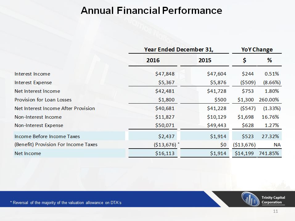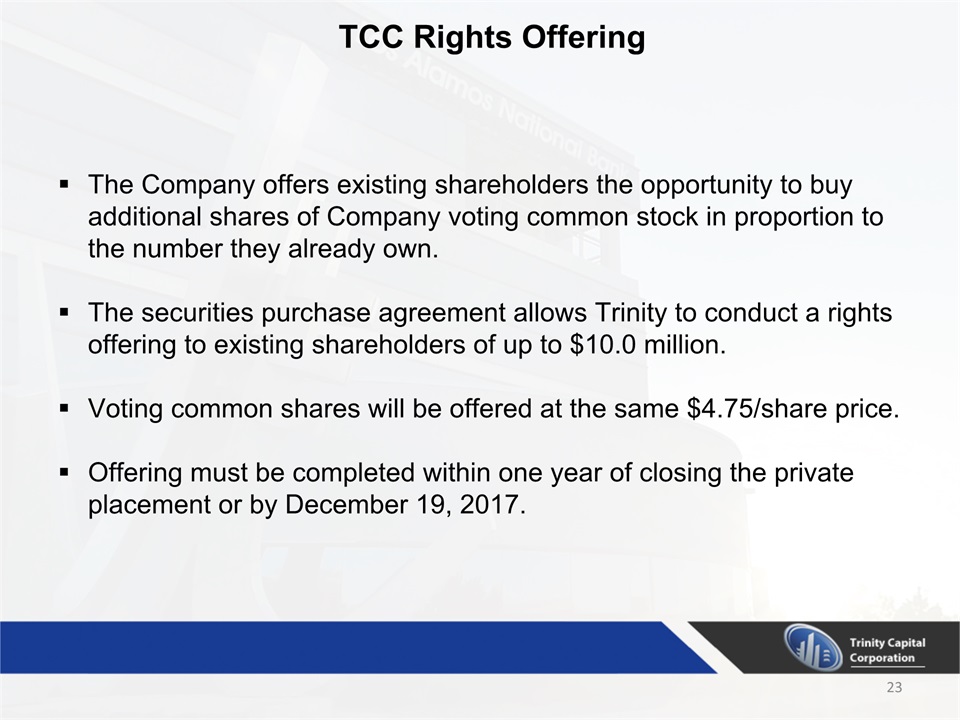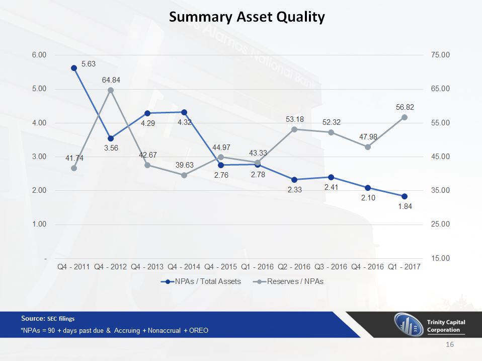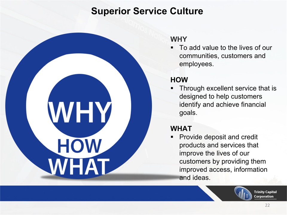 8 Experienced Management Team Name Title Years of Experience Year started with LANB Selected Professional Biography John S. Gulas President & CEO 34 2014 Most recently employed as President and Chief Executive Officer for Farmers National Bank in Ohio. Graduate of the University of Toledo College of Law, with a Juris Doctor degree in Law. Joe Martony EVP, Chief Risk Officer 30 2016 Most recently employed as Executive Vice President and Chief Risk Officer for SKBHC Holdings LLC, Starbuck Bancshares, Inc. and American West Bank in Washington. Graduate of Indiana University, with a Bachelor of Science degree in Business Finance. Stan Sluder EVP, Chief Lending Officer & Director of Sales 28 2015 Most recently employed as Market President and Chief Lending Officer for Peoples Bank in New Mexico. Graduate of New Mexico State University with a Bachelor of Science in Communication Studies. Tom Lilly EVP, Chief Credit Officer 25 2013 Most recently employed as Senior Vice President and Chief Credit Officer for The National Bank in Iowa.Graduated from the School of Banking at the University of Wisconsin and completed certifications from the Commercial Lending School in Norman, Okla., and the Consumer Lending School from the University of Wisconsin. Eddie Ho EVP, Chief Information Officer 39 2014 Previously employed as Executive Vice President and Chief Information Officer at OmniAmerican Bank in Fort Worth, Texas.Graduated with a BS from University of Wisconsin, an MS in Computer Science from North Dakota State University, and holds CIPP, CISA, CISM, CGEIT, and CISSP certification. Tom Dolan EVP, Senior Financial OfficerOf Trinity, CFO of Bank 35 2017 Most recently employed at Anchor Bank in Madison, WI as the Chief Operating Officer.Graduated from Loyola University with a Bachelor of Science in Economics and earned an MBA at the University of Chicago with a concentration in Finance. Esther Lumague SVP, Human Resources 15 2015 Most recently employed as Director, International Human Resources for Harris Corporation in New York. Graduate of Loyola University of Chicago, with Master degrees in Organization Development and Industrial Relations. Jennifer Weller SVP, Retail Operations & Delivery 27 2016 Most recently employed as VP Operations for Central Bancshares, Inc. in Iowa.Graduate of the University of South Dakota with a Bachelor of Science degree in Business Administration. Liddie Martinez SVP, Market President, Los Alamos 27 2016 Most recently employed as the Executive Director of Regional Development Corporation for Northern New Mexico. Currently serves on the board of the LANL Subcontractor Consortium, Think New Mexico, New Mexico Economic Development Rural Council, Northern New Mexico College Foundation, and the Los Alamos Commerce and Development. Dion Silva SVP, Market President, Santa Fe 16 2001 Served as the Vice President of Lending through 2016, when he became Market President for Santa Fe. Graduate of New Mexico State University, with a Bachelor of Science degree in Environmental Engineering and a Master of Business Administration Degree in Finance. Robert Gabaldon SVP, Market President, Albuquerque Metro 23 2014 Held key roles at Bank of America, Bank of Albuquerque, and US Bank. Earned his B.B.A. in management from the University of New Mexico, R.O. Anderson School of Management. Mike Schuler Interim CFO of Trinity, Accounting & Finance 40 2015 Previously employed in various capacities by Beal Bank, located in Texas, including the position of Senior Vice President Controller from 2001 through 2011. Graduate of the University of Central Oklahoma with Bachelor of Science degree in Accounting and is a Certified Public Accountant and is a Certified Global Management Accountant.