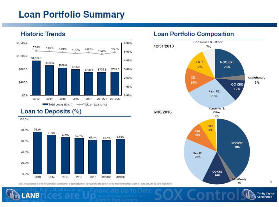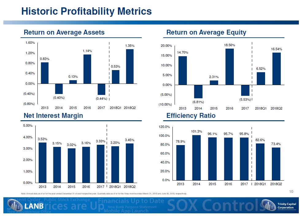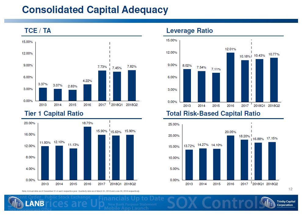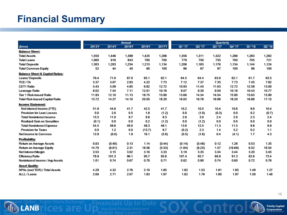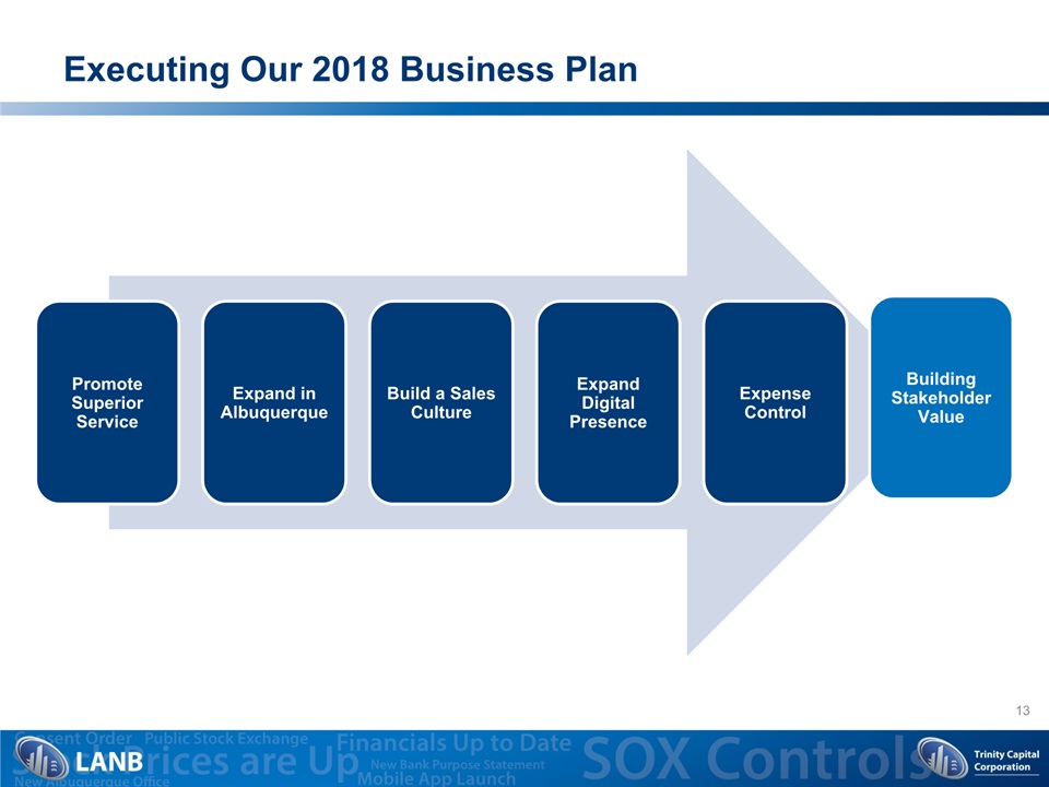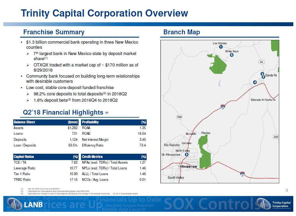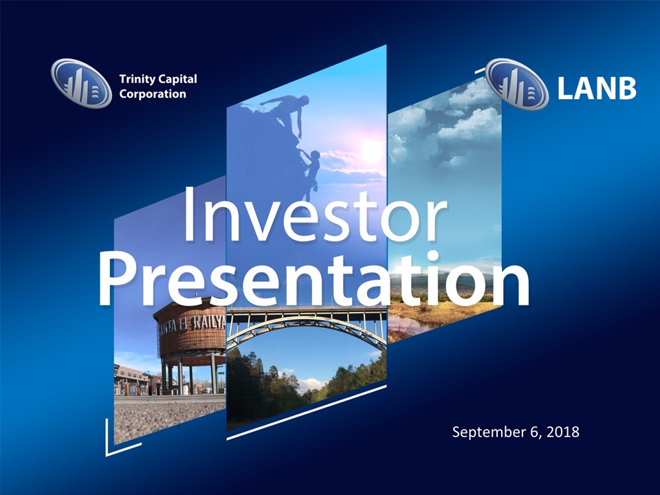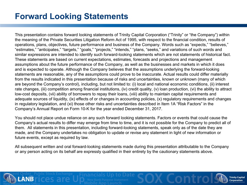 Forward Looking Statements This presentation contains forward looking statements of Trinity Capital Corporation (“Trinity” or “the Company”) within the meaning of the Private Securities Litigation Reform Act of 1995, with respect to the financial condition, results of operations, plans, objectives, future performance and business of the Company. Words such as “expects,” “believes,” “estimates,” “anticipates,” “targets,” “goals,” “projects,” “intends,” “plans, “seeks,” and variations of such words and similar expressions are intended to identify such forward-looking statements which are not statements of historical fact. These statements are based on current expectations, estimates, forecasts and projections and management assumptions about the future performance of the Company, as well as the businesses and markets in which it does and is expected to operate. Although the Company believes that the assumptions underlying the forward-looking statements are reasonable, any of the assumptions could prove to be inaccurate. Actual results could differ materially from the results indicated in this presentation because of risks and uncertainties, known or unknown (many of which are beyond the Company’s control), including, but not limited to: (i) local and national economic conditions, (ii) interest rate changes, (iii) competition among financial institutions, (iv) credit quality, (v) loan production, (vi) the ability to attract low-cost deposits, (vii) ability of borrowers to repay their loans, (viii) ability to maintain capital requirements and adequate sources of liquidity, (ix) effects of or changes in accounting policies, (x) regulatory requirements and changes in regulatory legislation, and (xi) those other risks and uncertainties described in Item 1A “Risk Factors” in the Company’s Annual Report on Form 10-K for the year ended December 31, 2017. You should not place undue reliance on any such forward looking statements. Factors or events that could cause the Company’s actual results to differ may emerge from time to time, and it is not possible for the Company to predict all of them. All statements in this presentation, including forward-looking statements, speak only as of the date they are made, and the Company undertakes no obligation to update or revise any statement in light of new information or future events, except as required by law.All subsequent written and oral forward-looking statements made during this presentation attributable to the Company or any person acting on its behalf are expressly qualified in their entirety by the cautionary statements above.