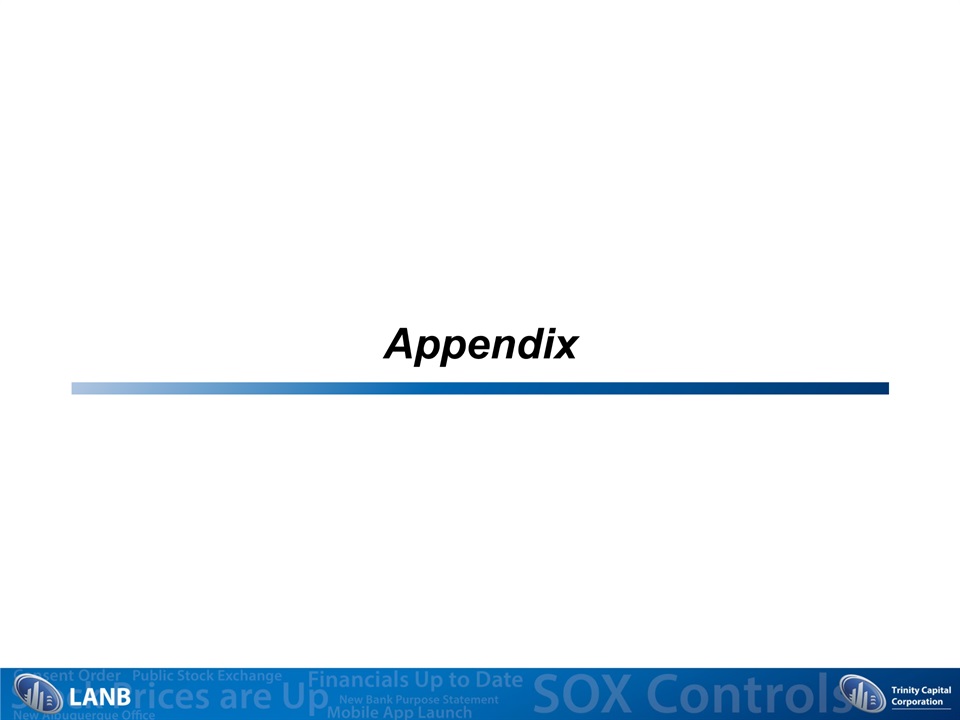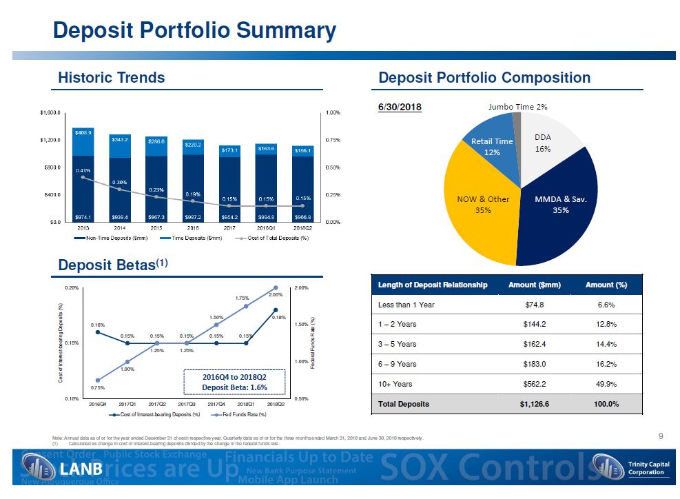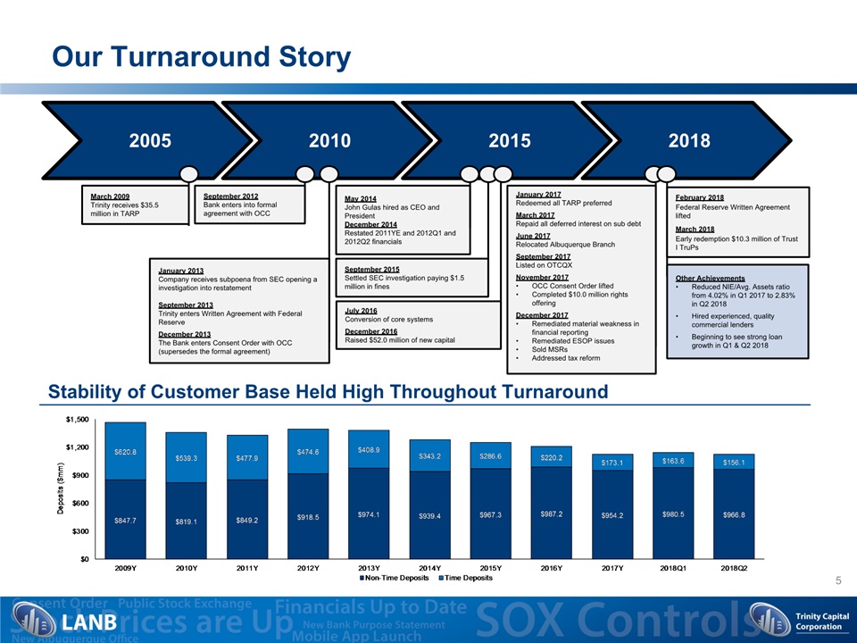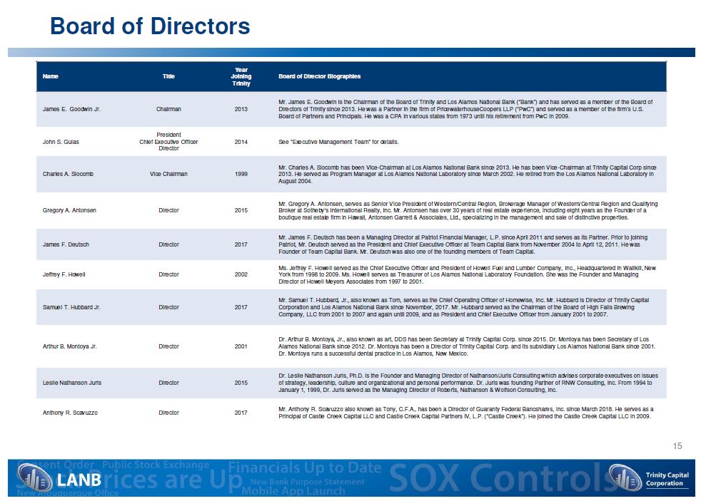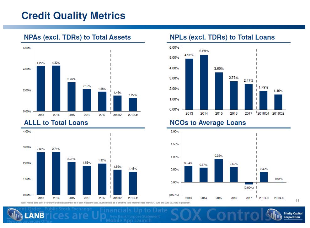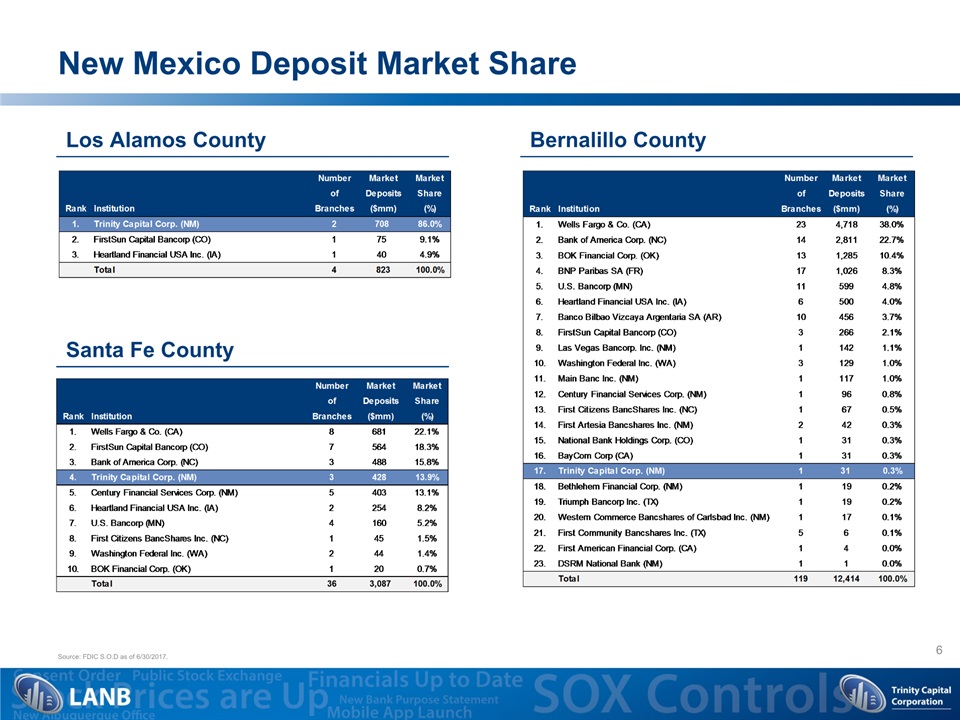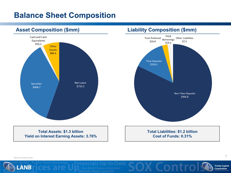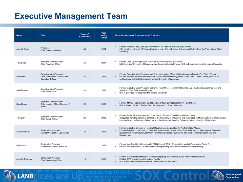 Forward Looking Statements This presentation contains forward looking statements of Trinity Capital Corporation (“Trinity” or “the Company”) within the meaning of the Private Securities Litigation Reform Act of 1995, with respect to the financial condition, results of operations, plans, objectives, future performance and business of the Company. Words such as “expects,” “believes,” “estimates,” “anticipates,” “targets,” “goals,” “projects,” “intends,” “plans, “seeks,” and variations of such words and similar expressions are intended to identify such forward-looking statements which are not statements of historical fact. These statements are based on current expectations, estimates, forecasts and projections and management assumptions about the future performance of the Company, as well as the businesses and markets in which it does and is expected to operate. Although the Company believes that the assumptions underlying the forward-looking statements are reasonable, any of the assumptions could prove to be inaccurate. Actual results could differ materially from the results indicated in this presentation because of risks and uncertainties, known or unknown (many of which are beyond the Company’s control), including, but not limited to: (i) local and national economic conditions, (ii) interest rate changes, (iii) competition among financial institutions, (iv) credit quality, (v) loan production, (vi) the ability to attract low-cost deposits, (vii) ability of borrowers to repay their loans, (viii) ability to maintain capital requirements and adequate sources of liquidity, (ix) effects of or changes in accounting policies, (x) regulatory requirements and changes in regulatory legislation, and (xi) those other risks and uncertainties described in Item 1A “Risk Factors” in the Company’s Annual Report on Form 10-K for the year ended December 31, 2017. You should not place undue reliance on any such forward looking statements. Factors or events that could cause the Company’s actual results to differ may emerge from time to time, and it is not possible for the Company to predict all of them. All statements in this presentation, including forward-looking statements, speak only as of the date they are made, and the Company undertakes no obligation to update or revise any statement in light of new information or future events, except as required by law.All subsequent written and oral forward-looking statements made during this presentation attributable to the Company or any person acting on its behalf are expressly qualified in their entirety by the cautionary statements above.
