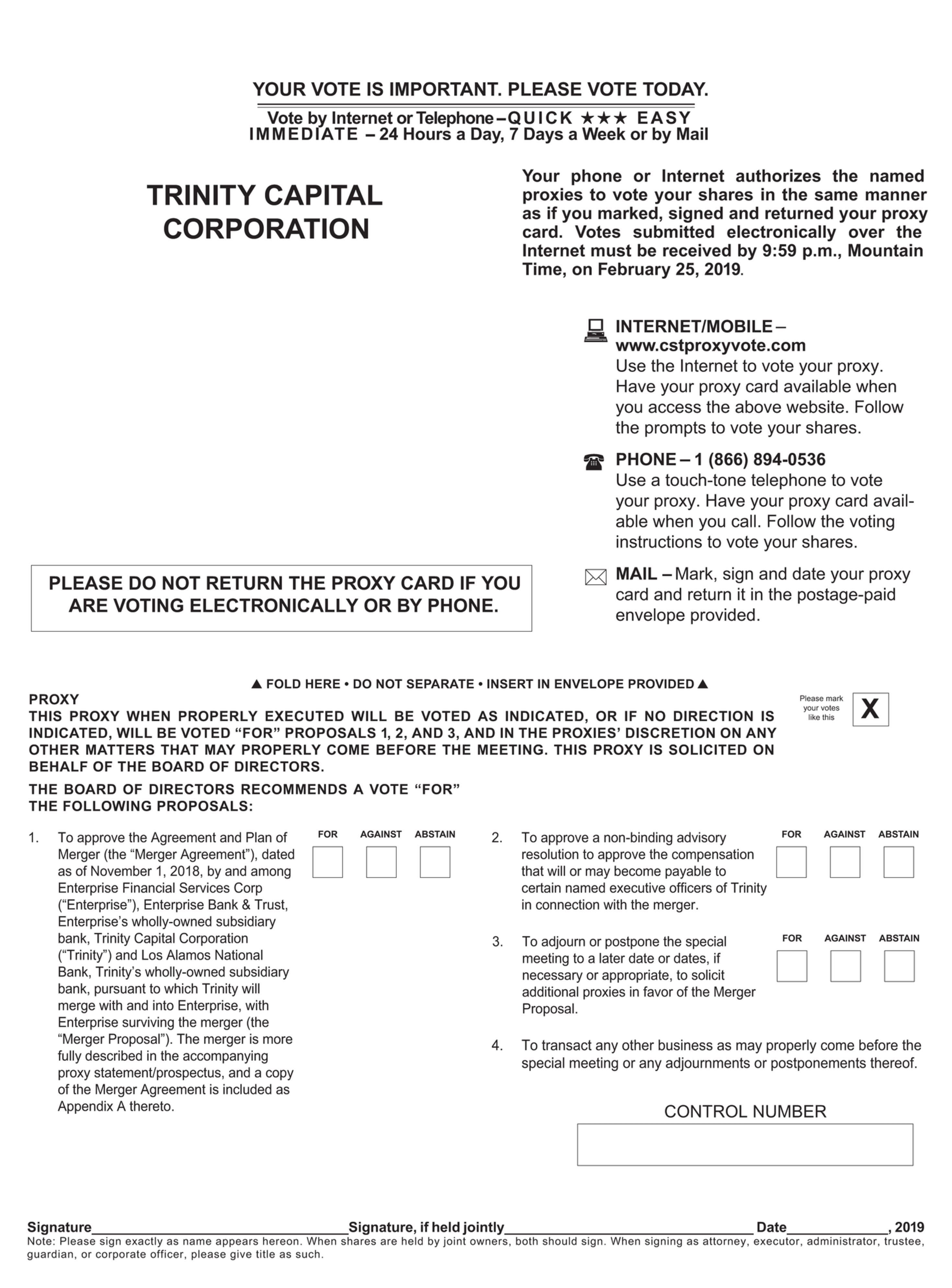 | 1. | A proposal to approve the Agreement and Plan of Merger (the “Merger Agreement”), dated as of November 1, 2018, by and among Enterprise Financial Services Corp (“Enterprise”), Enterprise Bank & Trust, Enterprise’s wholly-owned subsidiary bank (“EB&T”), Trinity and Los Alamos National Bank, Trinity’s wholly-owned subsidiary bank (“LANB”), a copy of which is included in this proxy statement/prospectus as Appendix A, pursuant to which Trinity will merge with and into Enterprise, with Enterprise surviving the merger (the “Merger”), and transactions contemplated thereby (the “Merger Proposal”); |