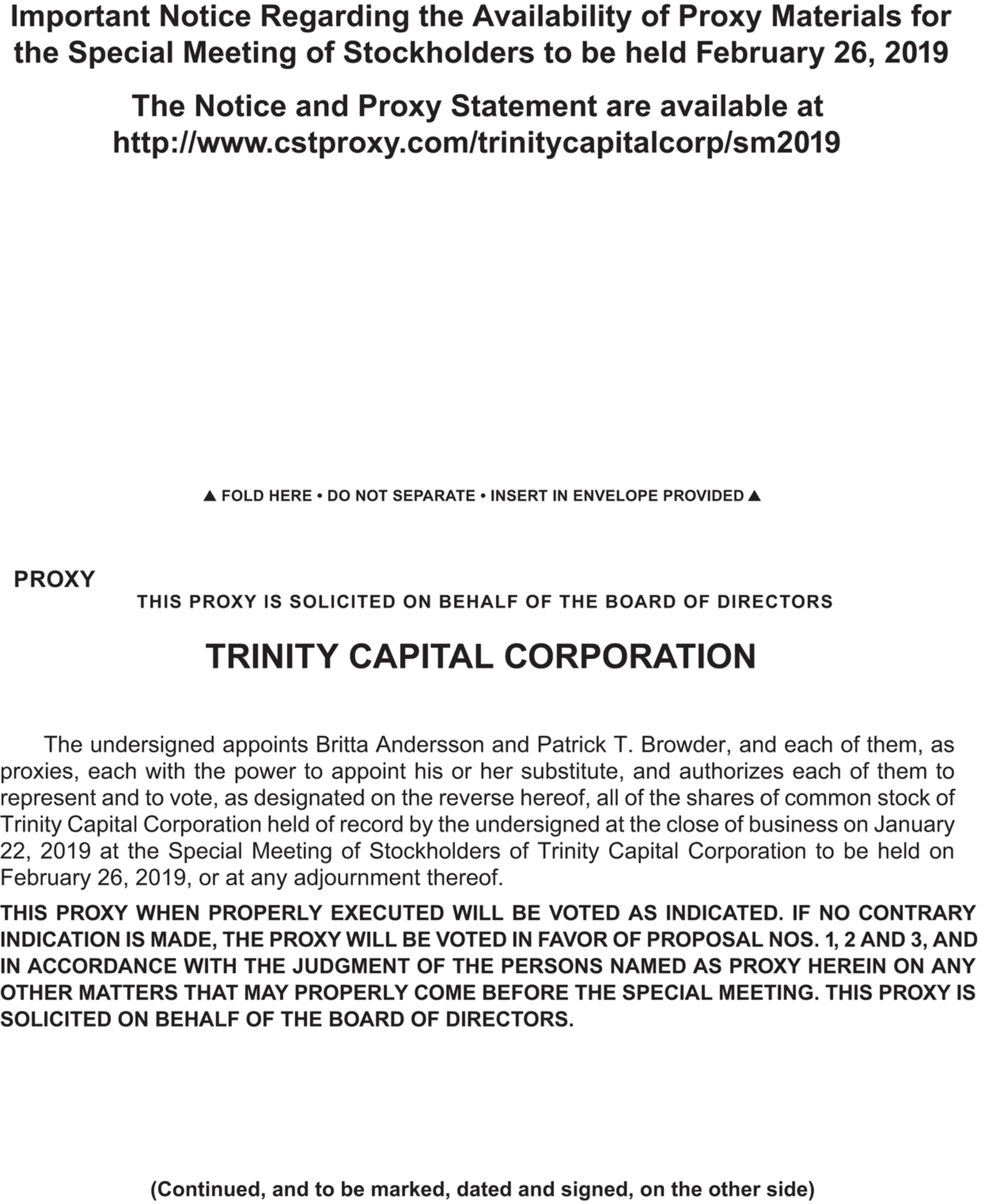 NOTICE IS HEREBY GIVEN that a special meeting of shareholders (the “Special Meeting”) of Trinity Capital Corporation (“Trinity”) will be held on February 26, 2019, at 10:00 a.m., Mountain Time, at Crossroads Bible Church, 97 E Road, Los Alamos, New Mexico 87544.