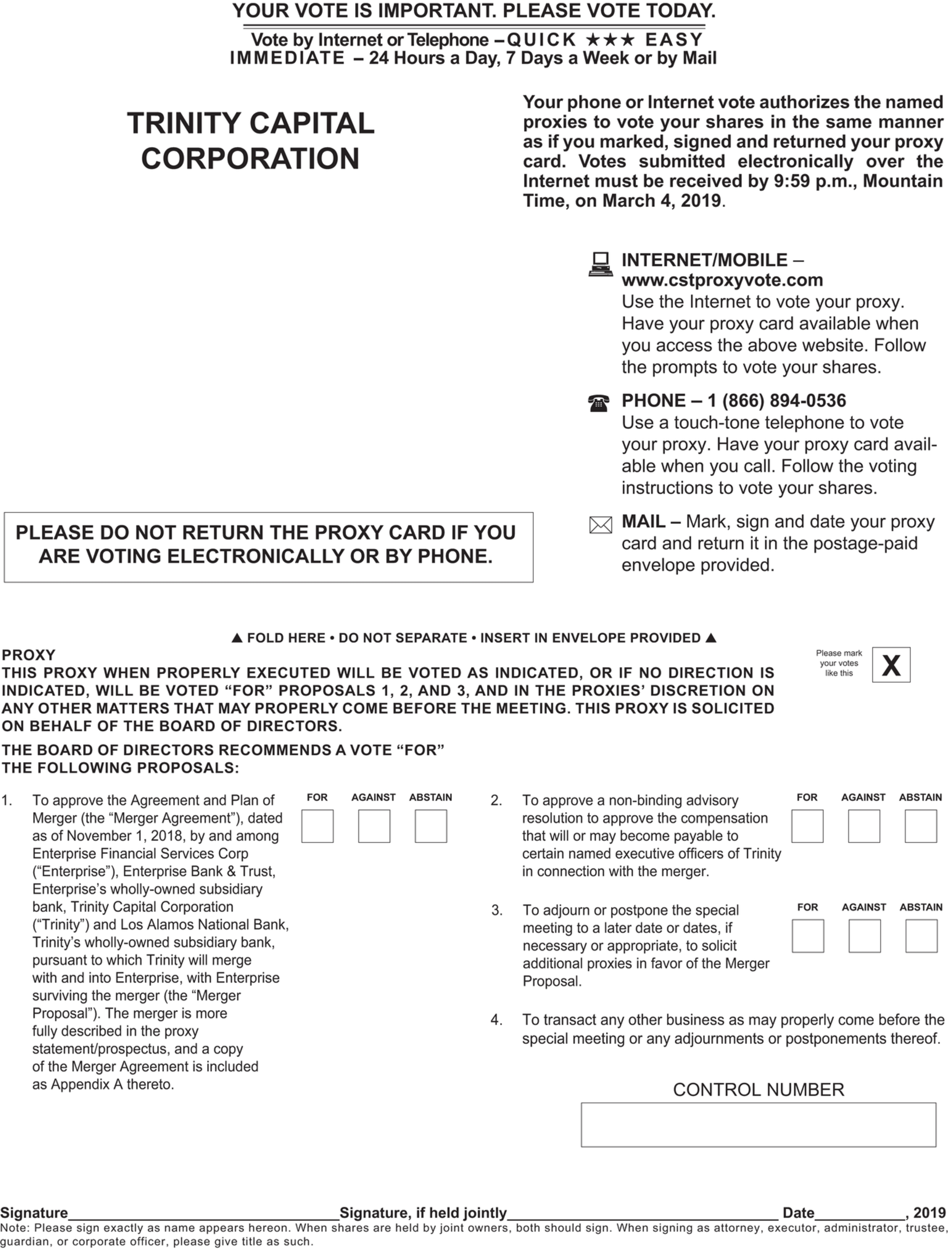 | 1. | A proposal to approve the Agreement and Plan of Merger (the “Merger Agreement”), dated as of November 1, 2018, by and among Enterprise Financial Services Corp (“Enterprise”), Enterprise Bank & Trust, Enterprise’s wholly-owned subsidiary bank (“EB&T”), Trinity and Los Alamos National Bank, Trinity’s wholly-owned subsidiary bank (“LANB”), a copy of which is included in the Proxy Statement/Prospectus as Appendix A, pursuant to which Trinity will merge with and into Enterprise, with Enterprise surviving the merger (the “Merger”), and transactions contemplated thereby (the “Merger Proposal”); |