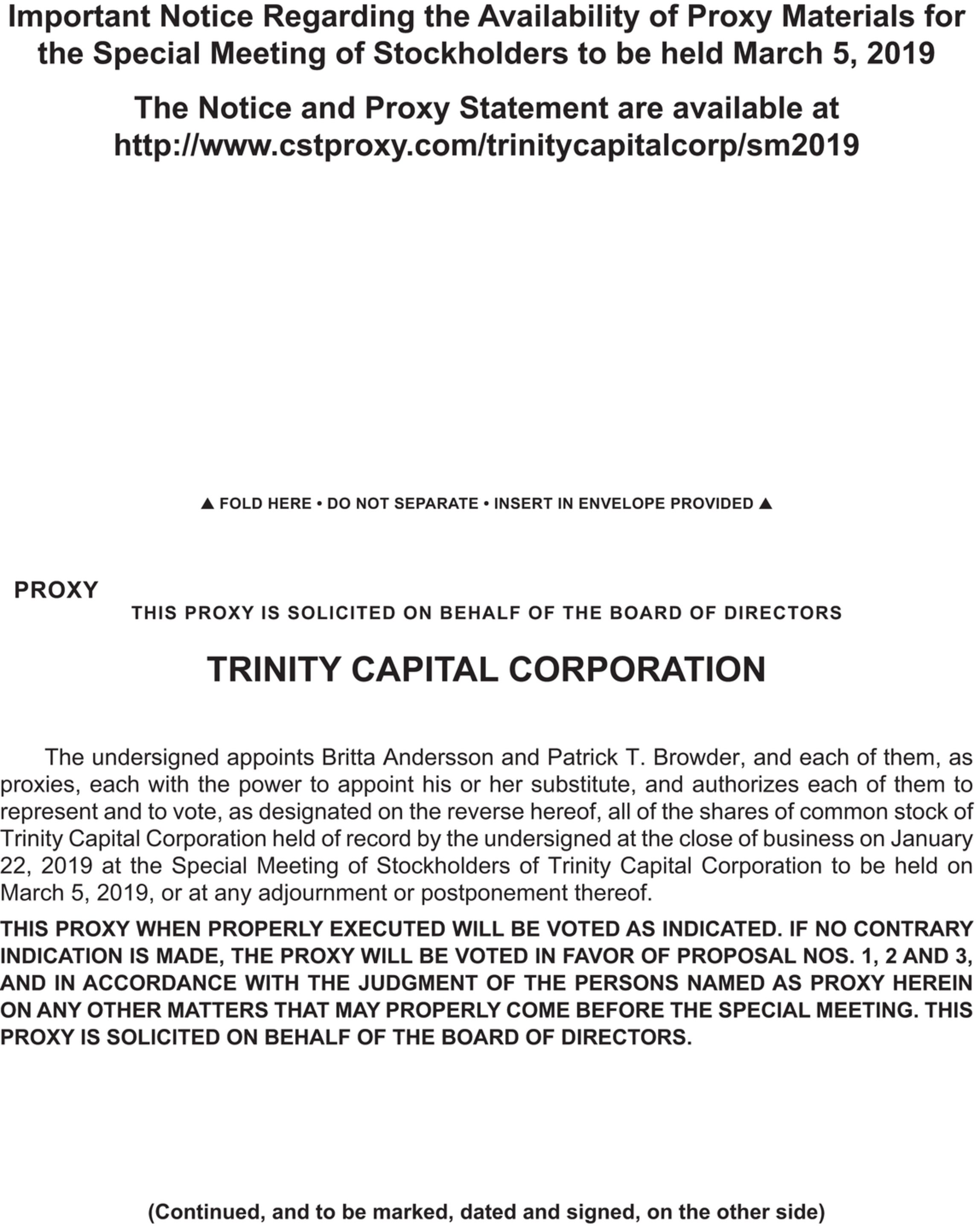 YOUR VOTE IS VERY IMPORTANT. You are requested to vote (i) via the Internet at the website http://www.cstproxy.com/trinitycapitalcorp/sm2019 no later than 9:59 p.m., Mountain Time, on March 4, 2019, (ii) by telephone at the number 1 (866) 894-0536, (iii) by completing and mailing the enclosed light blue proxy card or (iv) by voting in person at the Special Meeting. Whether or not you plan to attend the Special Meeting, please take time to vote by following the specific instructions set forth in the enclosed light blue proxy card. The proxy will not be used if you attend and vote at the Special Meeting in person. To ensure your vote is represented at the Special Meeting, we recommend that you vote by proxy (either via the Internet, by telephone or by proxy card) even if you plan to attend the Special Meeting. Submitting a proxy now will not prevent you from being able to vote in person at the Special Meeting.