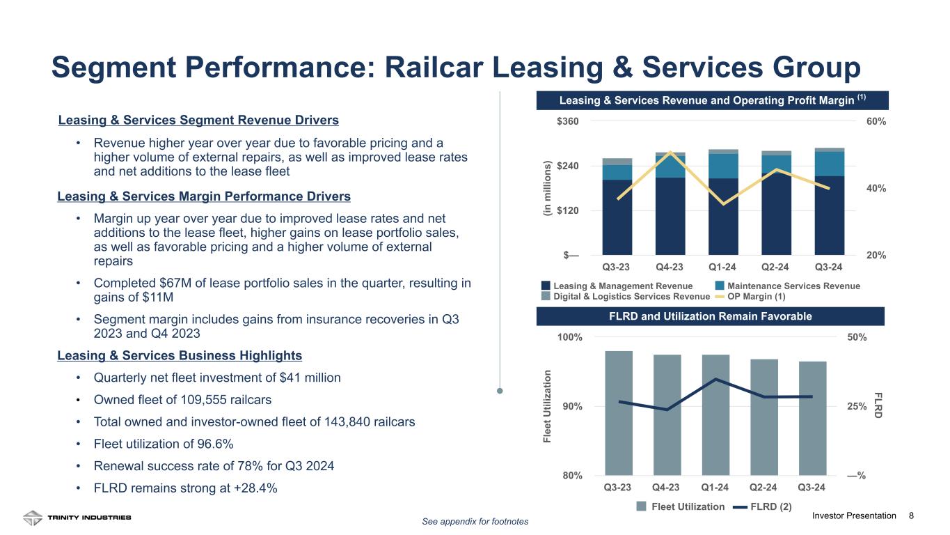 7Investor Presentation North American Railcar Market In Balance C ha ng e in N or th A m er ic an R ai lc ar F le et (r ai lc ar s Y /Y ) S hare of R ailcars in S torage (M onthly % ) Change in Fleet Size (Y/Y) Percent in storage 1/1/2021 1/1/2022 1/1/2023 1/1/2024 -30,000 -20,000 -10,000 0 10,000 20,000 —% 5% 10% 15% 20% 25% North American Railcar Fleet and Railcars in Storage Source: Association of American Railroads (“AAR”) RAILCAR FLEET The industry fleet continues to expand, but the rate of expansion has slowed. Industry deliveries expected to be ~40K for 2024, offset by attrition to keep fleet at replacement level. Fleet expansion and railroad service improvements have been key themes in 2024. RAILCARS IN STORAGE Industry storage rates have dropped to ~19% in Q3 and stable service metrics allow railroads to operate more efficiently with fewer railcars, providing longer term incentive for shippers to switch to rail.