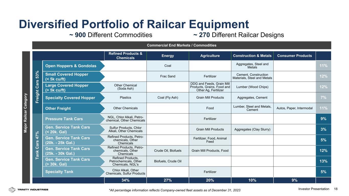 2Investor Presentation 2 Forward Looking Statements Some statements in this presentation, which are not historical facts, are “forward-looking statements” as defined by the Private Securities Litigation Reform Act of 1995. Forward-looking statements include statements about Trinity's estimates, expectations, beliefs, intentions or strategies for the future, and the assumptions underlying these forward-looking statements, including, but not limited to, future financial and operating performance, future opportunities and any other statements regarding events or developments that Trinity believes or anticipates will or may occur in the future. Trinity uses the words “anticipates,” “assumes,” “believes,” “estimates,” “expects,” “intends,” “forecasts,” “may,” “will,” “should,” “guidance,” “projected,” “outlook,” and similar expressions to identify these forward-looking statements. Forward-looking statements speak only as of the date of this material, and Trinity expressly disclaims any obligation or undertaking to disseminate any updates or revisions to any forward-looking statement contained herein to reflect any change in Trinity’s expectations with regard thereto or any change in events, conditions or circumstances on which any such statement is based, except as required by federal securities laws. Forward-looking statements involve risks and uncertainties that could cause actual results to differ materially from historical experience or our present expectations, including but not limited to risks and uncertainties regarding economic, competitive, governmental, and technological factors affecting Trinity’s operations, markets, products, services and prices, and such forward-looking statements are not guarantees of future performance. For a discussion of such risks and uncertainties, which could cause actual results to differ from those contained in the forward-looking statements, see “Risk Factors” and “Forward-Looking Statements” in Trinity’s Annual Report on Form 10-K for the most recent fiscal year, as may be revised and updated by Trinity’s Quarterly Reports on Form 10-Q, and Trinity’s Current Reports on Form 8-K. This presentation also includes references to calculations that are not based on generally accepted accounting principles (“GAAP”). Reconciliations of each of these non-GAAP measures to the most directly comparable GAAP measures have been included in the Appendix. When forward-looking non-GAAP measures are provided, Trinity does not provide quantitative reconciliations of forward-looking non-GAAP measures to the most directly comparable GAAP measures because it cannot, without unreasonable effort, predict the timing and amounts of certain items included in the computations of each of these measures. These factors include, but are not limited to: the product mix of expected railcar deliveries; the timing and amount of significant transactions and investments, such as lease portfolio sales, capital expenditures, and returns of capital to shareholders; and the amount and timing of certain other items outside the normal course of our core business operations. Except where noted, financial data is presented as of the Company’s most recent fiscal quarter ending September 30, 2024. “LTM” represents Last Twelve Months(1) financial information from October 1, 2023 to September 30, 2024. See appendix for footnotes