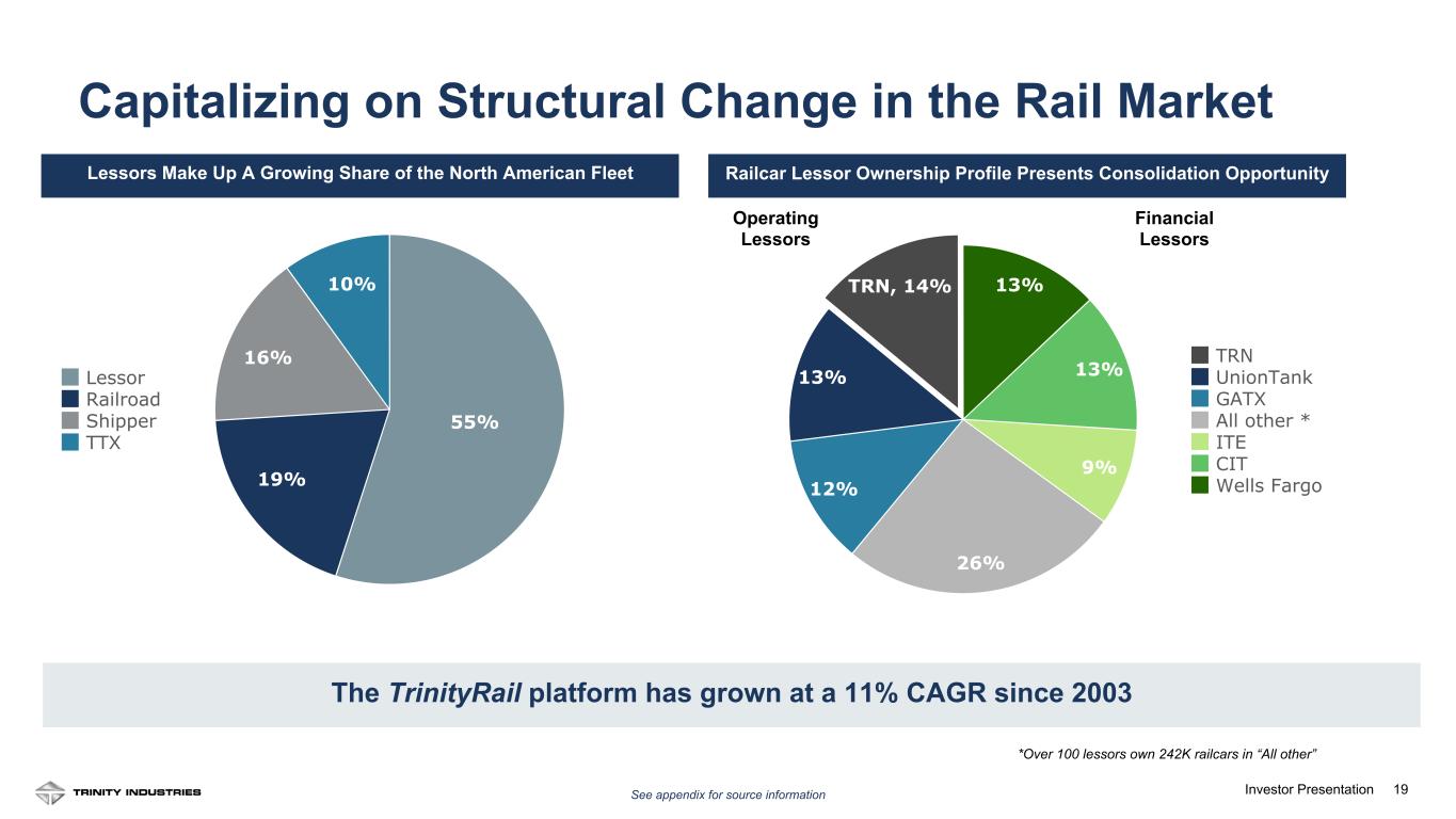 19Investor Presentation 13% 13% 9% 26% 12% 13% TRN, 14% TRN UnionTank GATX All other * ITE CIT Wells Fargo The TrinityRail platform has grown at a 11% CAGR since 2003 Lessors Make Up A Growing Share of the North American Fleet Railcar Lessor Ownership Profile Presents Consolidation Opportunity Operating Lessors *Over 100 lessors own 242K railcars in “All other” 19 Financial Lessors 55% 19% 16% 10% Lessor Railroad Shipper TTX See appendix for source information Capitalizing on Structural Change in the Rail Market