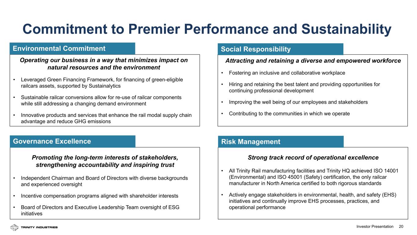 20Investor Presentation20 Operating our business in a way that minimizes impact on natural resources and the environment • Leveraged Green Financing Framework, for financing of green-eligible railcars assets, supported by Sustainalytics • Sustainable railcar conversions allow for re-use of railcar components while still addressing a changing demand environment • Innovative products and services that enhance the rail modal supply chain advantage and reduce GHG emissions Attracting and retaining a diverse and empowered workforce • Fostering an inclusive and collaborative workplace • Hiring and retaining the best talent and providing opportunities for continuing professional development • Improving the well being of our employees and stakeholders • Contributing to the communities in which we operate Promoting the long-term interests of stakeholders, strengthening accountability and inspiring trust • Independent Chairman and Board of Directors with diverse backgrounds and experienced oversight • Incentive compensation programs aligned with shareholder interests • Board of Directors and Executive Leadership Team oversight of ESG initiatives Strong track record of operational excellence • All Trinity Rail manufacturing facilities and Trinity HQ achieved ISO 14001 (Environmental) and ISO 45001 (Safety) certification, the only railcar manufacturer in North America certified to both rigorous standards • Actively engage stakeholders in environmental, health, and safety (EHS) initiatives and continually improve EHS processes, practices, and operational performance Commitment to Premier Performance and Sustainability Environmental Commitment Social Responsibility Governance Excellence Risk Management