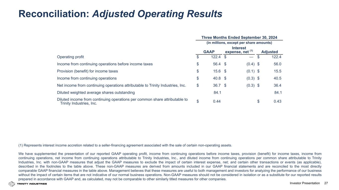 27Investor Presentation 27 Three Months Ended September 30, 2024 (in millions, except per share amounts) GAAP Interest expense, net (1) Adjusted Operating profit $ 122.4 $ — $ 122.4 Income from continuing operations before income taxes $ 56.4 $ (0.4) $ 56.0 Provision (benefit) for income taxes $ 15.6 $ (0.1) $ 15.5 Income from continuing operations $ 40.8 $ (0.3) $ 40.5 Net income from continuing operations attributable to Trinity Industries, Inc. $ 36.7 $ (0.3) $ 36.4 Diluted weighted average shares outstanding 84.1 84.1 Diluted income from continuing operations per common share attributable to Trinity Industries, Inc. $ 0.44 $ 0.43 (1) Represents interest income accretion related to a seller-financing agreement associated with the sale of certain non-operating assets. We have supplemented the presentation of our reported GAAP operating profit, income from continuing operations before income taxes, provision (benefit) for income taxes, income from continuing operations, net income from continuing operations attributable to Trinity Industries, Inc., and diluted income from continuing operations per common share attributable to Trinity Industries, Inc. with non-GAAP measures that adjust the GAAP measures to exclude the impact of certain interest expense, net; and certain other transactions or events (as applicable), described in the footnotes to the table above. These non-GAAP measures are derived from amounts included in our GAAP financial statements and are reconciled to the most directly comparable GAAP financial measures in the table above. Management believes that these measures are useful to both management and investors for analyzing the performance of our business without the impact of certain items that are not indicative of our normal business operations. Non-GAAP measures should not be considered in isolation or as a substitute for our reported results prepared in accordance with GAAP and, as calculated, may not be comparable to other similarly titled measures for other companies. Reconciliation: Adjusted Operating Results