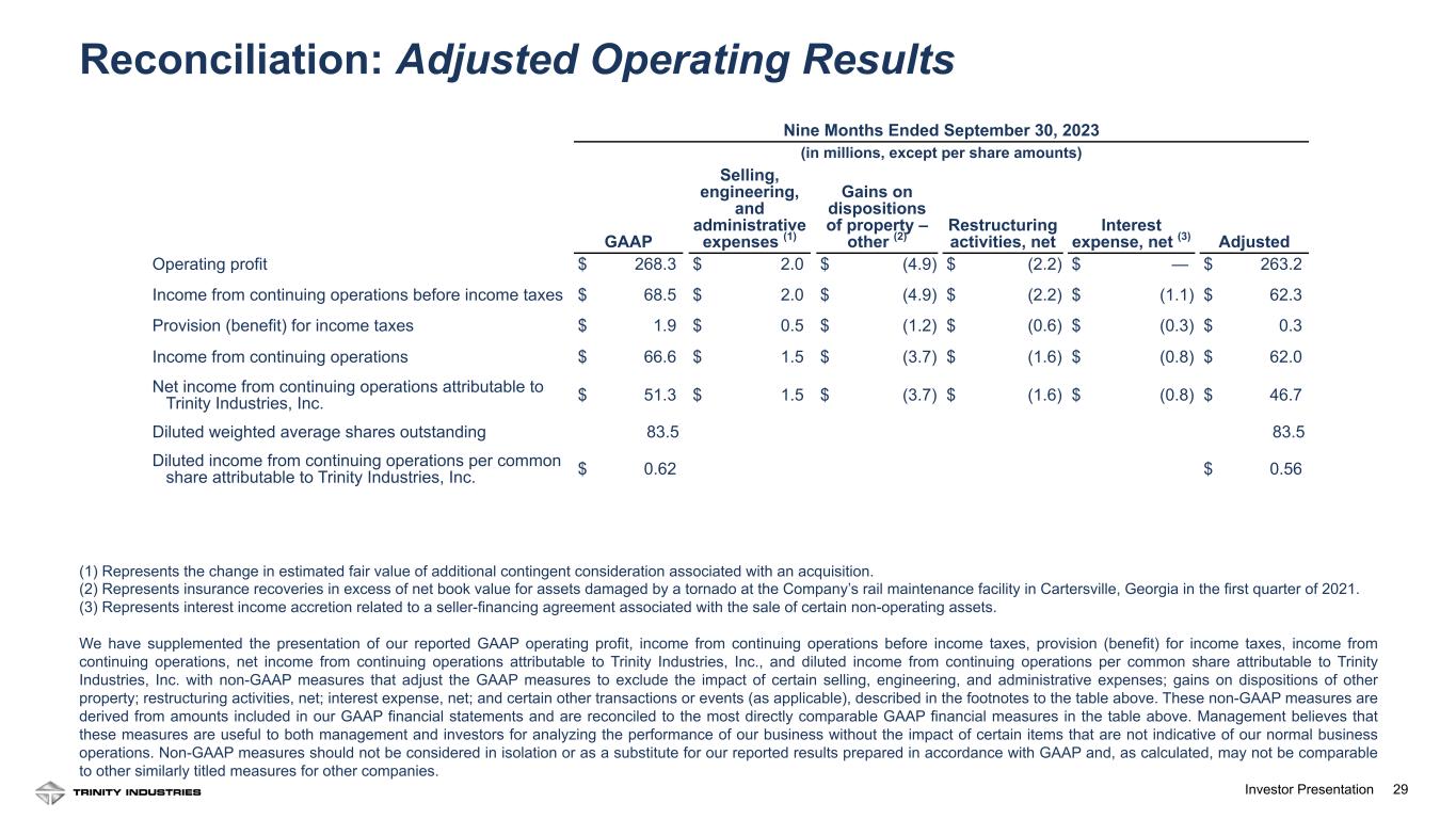 28Investor Presentation 28 Nine Months Ended September 30, 2024 (in millions, except per share amounts) GAAP Interest expense, net (1) Adjusted Operating profit $ 379.5 $ — $ 379.5 Income from continuing operations before income taxes $ 174.3 $ (1.2) $ 173.1 Provision (benefit) for income taxes $ 43.7 $ (0.3) $ 43.4 Income from continuing operations $ 130.6 $ (0.9) $ 129.7 Net income from continuing operations attributable to Trinity Industries, Inc. $ 120.8 $ (0.9) $ 119.9 Diluted weighted average shares outstanding 83.9 83.9 Diluted income from continuing operations per common share attributable to Trinity Industries, Inc. $ 1.44 $ 1.43 (1) Represents interest income accretion related to a seller-financing agreement associated with the sale of certain non-operating assets. We have supplemented the presentation of our reported GAAP operating profit, income from continuing operations before income taxes, provision (benefit) for income taxes, income from continuing operations, net income from continuing operations attributable to Trinity Industries, Inc., and diluted income from continuing operations per common share attributable to Trinity Industries, Inc. with non-GAAP measures that adjust the GAAP measures to exclude the impact of certain interest expense, net; and certain other transactions or events (as applicable), described in the footnotes to the table above. These non-GAAP measures are derived from amounts included in our GAAP financial statements and are reconciled to the most directly comparable GAAP financial measures in the table above. Management believes that these measures are useful to both management and investors for analyzing the performance of our business without the impact of certain items that are not indicative of our normal business operations. Non-GAAP measures should not be considered in isolation or as a substitute for our reported results prepared in accordance with GAAP and, as calculated, may not be comparable to other similarly titled measures for other companies. Reconciliation: Adjusted Operating Results
