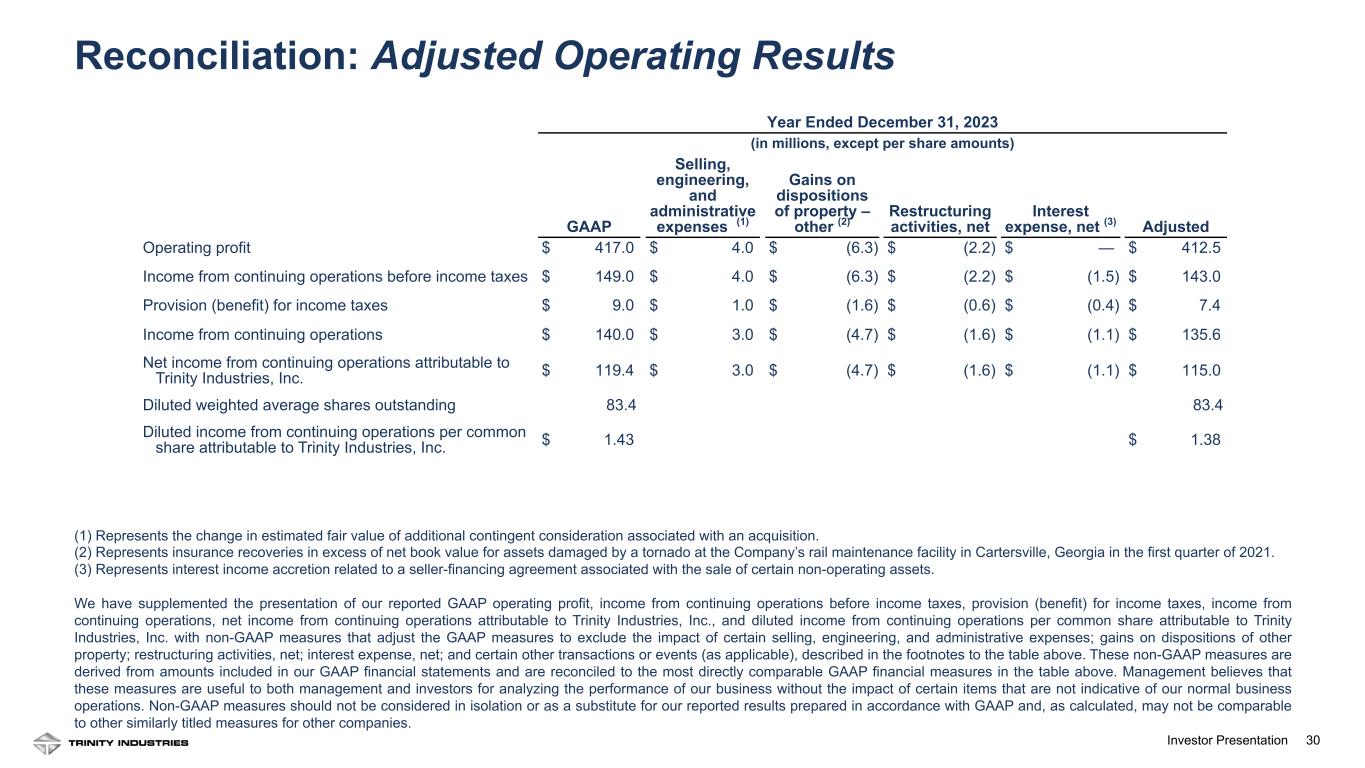 29Investor Presentation 29 Reconciliation: Adjusted Operating Results (1) Represents the change in estimated fair value of additional contingent consideration associated with an acquisition. (2) Represents insurance recoveries in excess of net book value for assets damaged by a tornado at the Company’s rail maintenance facility in Cartersville, Georgia in the first quarter of 2021. (3) Represents interest income accretion related to a seller-financing agreement associated with the sale of certain non-operating assets. We have supplemented the presentation of our reported GAAP operating profit, income from continuing operations before income taxes, provision (benefit) for income taxes, income from continuing operations, net income from continuing operations attributable to Trinity Industries, Inc., and diluted income from continuing operations per common share attributable to Trinity Industries, Inc. with non-GAAP measures that adjust the GAAP measures to exclude the impact of certain selling, engineering, and administrative expenses; gains on dispositions of other property; restructuring activities, net; interest expense, net; and certain other transactions or events (as applicable), described in the footnotes to the table above. These non-GAAP measures are derived from amounts included in our GAAP financial statements and are reconciled to the most directly comparable GAAP financial measures in the table above. Management believes that these measures are useful to both management and investors for analyzing the performance of our business without the impact of certain items that are not indicative of our normal business operations. Non-GAAP measures should not be considered in isolation or as a substitute for our reported results prepared in accordance with GAAP and, as calculated, may not be comparable to other similarly titled measures for other companies. Nine Months Ended September 30, 2023 (in millions, except per share amounts) GAAP Selling, engineering, and administrative expenses (1) Gains on dispositions of property – other (2) Restructuring activities, net Interest expense, net (3) Adjusted Operating profit $ 268.3 $ 2.0 $ (4.9) $ (2.2) $ — $ 263.2 Income from continuing operations before income taxes $ 68.5 $ 2.0 $ (4.9) $ (2.2) $ (1.1) $ 62.3 Provision (benefit) for income taxes $ 1.9 $ 0.5 $ (1.2) $ (0.6) $ (0.3) $ 0.3 Income from continuing operations $ 66.6 $ 1.5 $ (3.7) $ (1.6) $ (0.8) $ 62.0 Net income from continuing operations attributable to Trinity Industries, Inc. $ 51.3 $ 1.5 $ (3.7) $ (1.6) $ (0.8) $ 46.7 Diluted weighted average shares outstanding 83.5 83.5 Diluted income from continuing operations per common share attributable to Trinity Industries, Inc. $ 0.62 $ 0.56