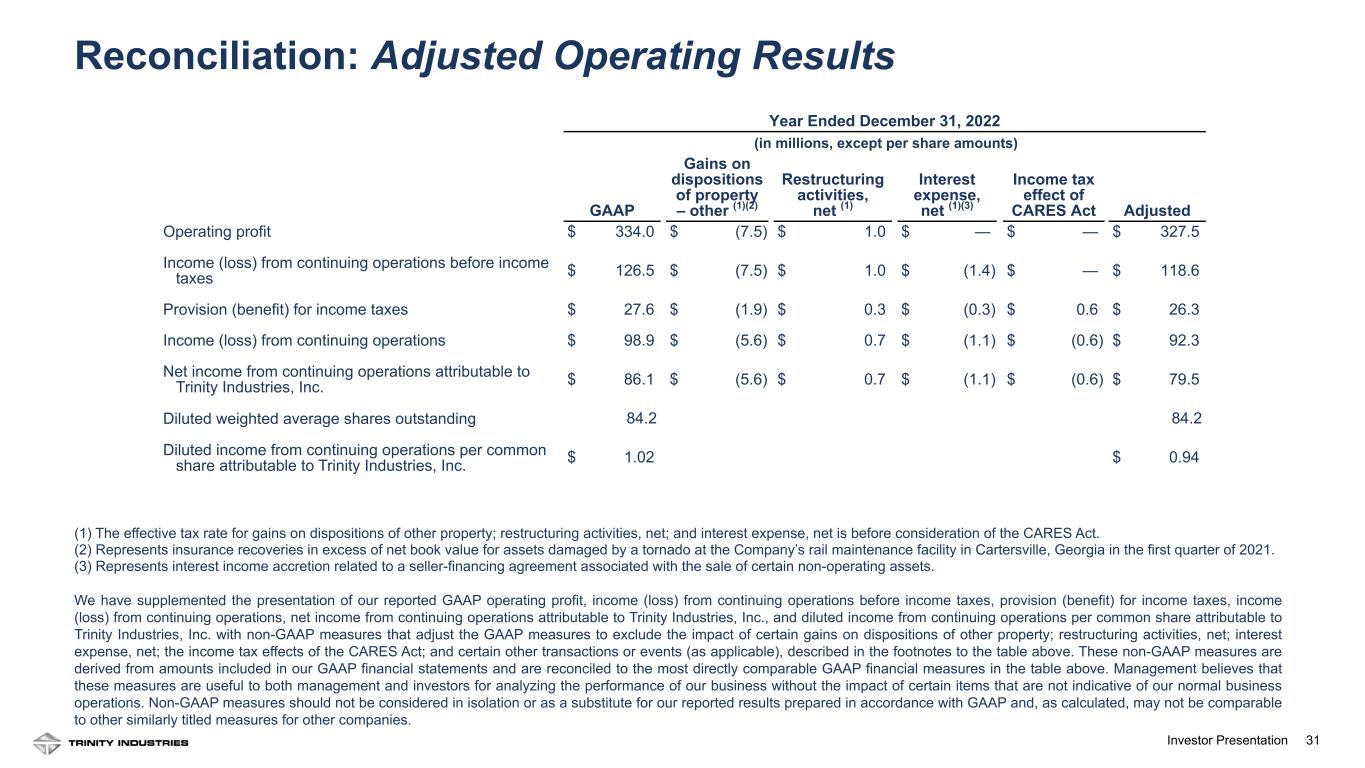 30Investor Presentation 30 (1) Represents the change in estimated fair value of additional contingent consideration associated with an acquisition. (2) Represents insurance recoveries in excess of net book value for assets damaged by a tornado at the Company’s rail maintenance facility in Cartersville, Georgia in the first quarter of 2021. (3) Represents interest income accretion related to a seller-financing agreement associated with the sale of certain non-operating assets. We have supplemented the presentation of our reported GAAP operating profit, income from continuing operations before income taxes, provision (benefit) for income taxes, income from continuing operations, net income from continuing operations attributable to Trinity Industries, Inc., and diluted income from continuing operations per common share attributable to Trinity Industries, Inc. with non-GAAP measures that adjust the GAAP measures to exclude the impact of certain selling, engineering, and administrative expenses; gains on dispositions of other property; restructuring activities, net; interest expense, net; and certain other transactions or events (as applicable), described in the footnotes to the table above. These non-GAAP measures are derived from amounts included in our GAAP financial statements and are reconciled to the most directly comparable GAAP financial measures in the table above. Management believes that these measures are useful to both management and investors for analyzing the performance of our business without the impact of certain items that are not indicative of our normal business operations. Non-GAAP measures should not be considered in isolation or as a substitute for our reported results prepared in accordance with GAAP and, as calculated, may not be comparable to other similarly titled measures for other companies. Year Ended December 31, 2023 (in millions, except per share amounts) GAAP Selling, engineering, and administrative expenses (1) Gains on dispositions of property – other (2) Restructuring activities, net Interest expense, net (3) Adjusted Operating profit $ 417.0 $ 4.0 $ (6.3) $ (2.2) $ — $ 412.5 Income from continuing operations before income taxes $ 149.0 $ 4.0 $ (6.3) $ (2.2) $ (1.5) $ 143.0 Provision (benefit) for income taxes $ 9.0 $ 1.0 $ (1.6) $ (0.6) $ (0.4) $ 7.4 Income from continuing operations $ 140.0 $ 3.0 $ (4.7) $ (1.6) $ (1.1) $ 135.6 Net income from continuing operations attributable to Trinity Industries, Inc. $ 119.4 $ 3.0 $ (4.7) $ (1.6) $ (1.1) $ 115.0 Diluted weighted average shares outstanding 83.4 83.4 Diluted income from continuing operations per common share attributable to Trinity Industries, Inc. $ 1.43 $ 1.38 Reconciliation: Adjusted Operating Results