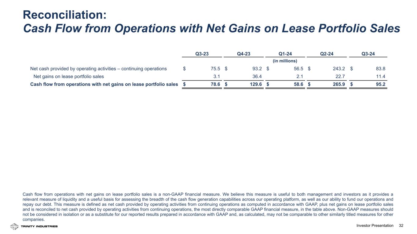 31Investor Presentation (1) The effective tax rate for gains on dispositions of other property; restructuring activities, net; and interest expense, net is before consideration of the CARES Act. (2) Represents insurance recoveries in excess of net book value for assets damaged by a tornado at the Company’s rail maintenance facility in Cartersville, Georgia in the first quarter of 2021. (3) Represents interest income accretion related to a seller-financing agreement associated with the sale of certain non-operating assets. We have supplemented the presentation of our reported GAAP operating profit, income (loss) from continuing operations before income taxes, provision (benefit) for income taxes, income (loss) from continuing operations, net income from continuing operations attributable to Trinity Industries, Inc., and diluted income from continuing operations per common share attributable to Trinity Industries, Inc. with non-GAAP measures that adjust the GAAP measures to exclude the impact of certain gains on dispositions of other property; restructuring activities, net; interest expense, net; the income tax effects of the CARES Act; and certain other transactions or events (as applicable), described in the footnotes to the table above. These non-GAAP measures are derived from amounts included in our GAAP financial statements and are reconciled to the most directly comparable GAAP financial measures in the table above. Management believes that these measures are useful to both management and investors for analyzing the performance of our business without the impact of certain items that are not indicative of our normal business operations. Non-GAAP measures should not be considered in isolation or as a substitute for our reported results prepared in accordance with GAAP and, as calculated, may not be comparable to other similarly titled measures for other companies. 31 Year Ended December 31, 2022 (in millions, except per share amounts) GAAP Gains on dispositions of property – other (1)(2) Restructuring activities, net (1) Interest expense, net (1)(3) Income tax effect of CARES Act Adjusted Operating profit $ 334.0 $ (7.5) $ 1.0 $ — $ — $ 327.5 Income (loss) from continuing operations before income taxes $ 126.5 $ (7.5) $ 1.0 $ (1.4) $ — $ 118.6 Provision (benefit) for income taxes $ 27.6 $ (1.9) $ 0.3 $ (0.3) $ 0.6 $ 26.3 Income (loss) from continuing operations $ 98.9 $ (5.6) $ 0.7 $ (1.1) $ (0.6) $ 92.3 Net income from continuing operations attributable to Trinity Industries, Inc. $ 86.1 $ (5.6) $ 0.7 $ (1.1) $ (0.6) $ 79.5 Diluted weighted average shares outstanding 84.2 84.2 Diluted income from continuing operations per common share attributable to Trinity Industries, Inc. $ 1.02 $ 0.94 Reconciliation: Adjusted Operating Results