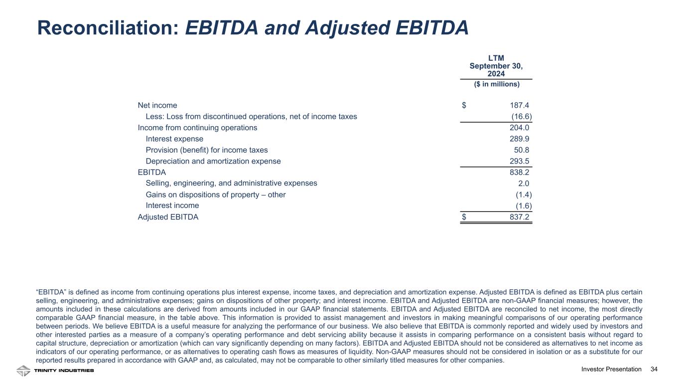 33Investor Presentation (1) Represents the change in estimated fair value of additional contingent consideration associated with an acquisition. (2) Represents insurance recoveries in excess of net book value for assets damaged by a tornado at the Company’s rail maintenance facility in Cartersville, Georgia in the first quarter of 2021. (3) Represents interest income accretion related to a seller-financing agreement associated with the sale of certain non-operating assets. (4) Return on Equity is calculated as income from continuing operations divided by average total stockholders' equity. (5) Adjusted Return on Equity is calculated as adjusted net income divided by average Trinity stockholders' equity, each as defined below and reconciled above. Adjusted Return on Equity (“Adjusted ROE”) is a non-GAAP measure that is derived from amounts included in our GAAP financial statements. We define Adjusted ROE as a ratio for which (i) the numerator is calculated as income or loss from continuing operations, adjusted to exclude the effects of net income or loss attributable to noncontrolling interest, and certain other adjustments (net of income taxes), described in the footnotes to the table above, which include certain selling, engineering, and administrative expenses; gains on dispositions of other property; and interest expense, net; and (ii) the denominator is calculated as average Trinity stockholders’ equity (which excludes noncontrolling interest). In the table above, the numerator and denominator of our Adjusted ROE calculation are reconciled to income from continuing operations and total stockholders’ equity, respectively, which are the GAAP financial measures used in the computation of ROE. Management believes that Adjusted ROE is a useful measure to both management and investors as it provides an indication of the economic return on the Company’s investments over time. Non-GAAP measures should not be considered in isolation or as a substitute for our reported results prepared in accordance with GAAP and, as calculated, may not be comparable to other similarly titled measures for other companies. LTM September 30, 2024 September 30, 2023 ($ in millions) Numerator: Income from continuing operations $ 204.0 Net income attributable to noncontrolling interest (15.1) Net income from continuing operations attributable to Trinity Industries, Inc. 188.9 Adjustments (net of income taxes): Selling, engineering, and administrative expenses (1) 1.5 Gains on dispositions of property – other (2) (1.0) Interest expense, net (3) (1.2) Adjusted Net Income $ 188.2 Denominator: Total stockholders' equity $ 1,298.5 $ 1,253.4 Noncontrolling interest (241.1) (252.6) Trinity stockholders' equity $ 1,057.4 $ 1,000.8 Average total stockholders' equity $ 1,276.0 Return on Equity (4) 16.0 % Average Trinity stockholders' equity $ 1,029.1 Adjusted Return on Equity (5) 18.3 % Reconciliation: Adjusted Return on Equity